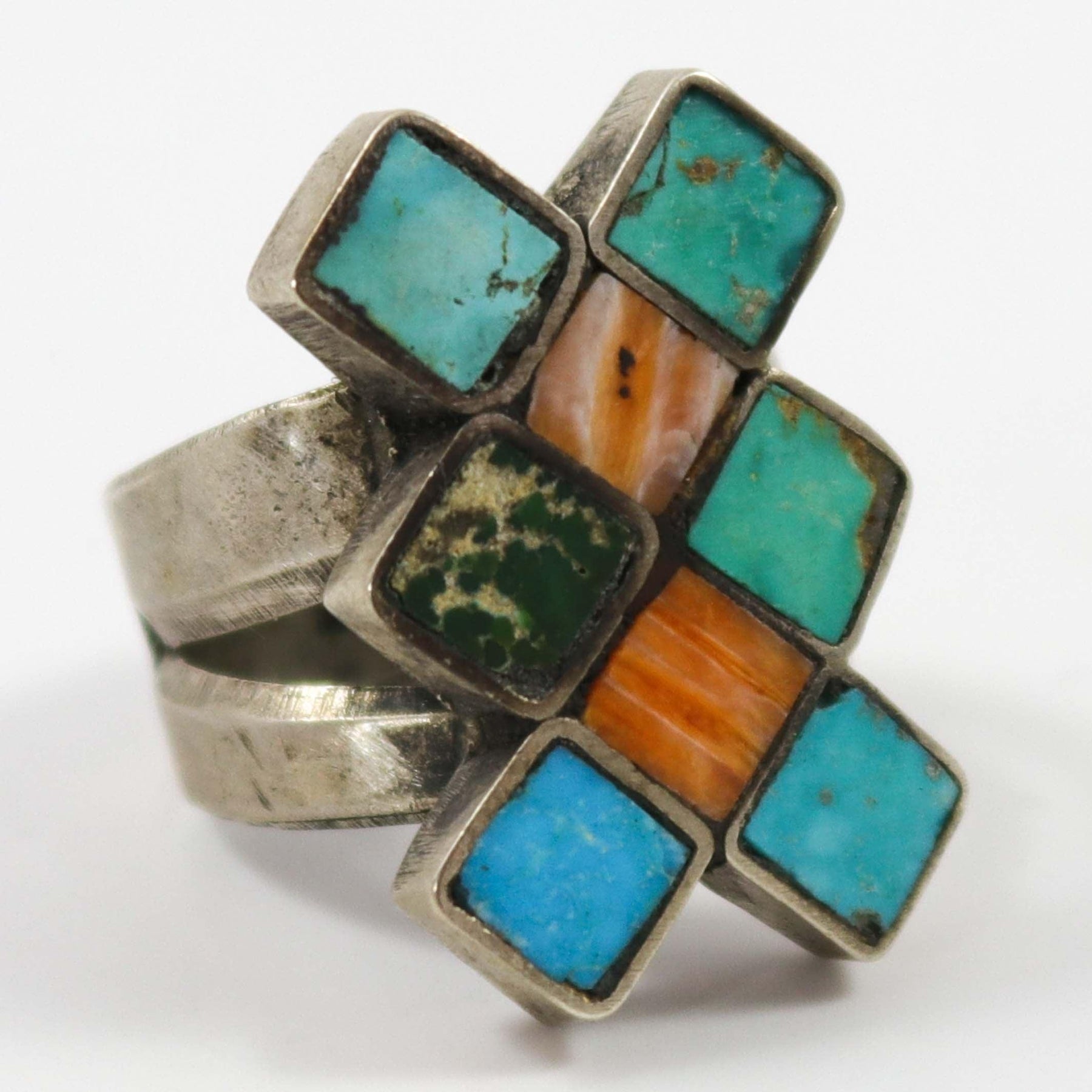 Hand-Forged Coin Silver Ring with Hand-Stamped Designs and Inlaid Natural Turquoise and Spiny Oyster Shell.