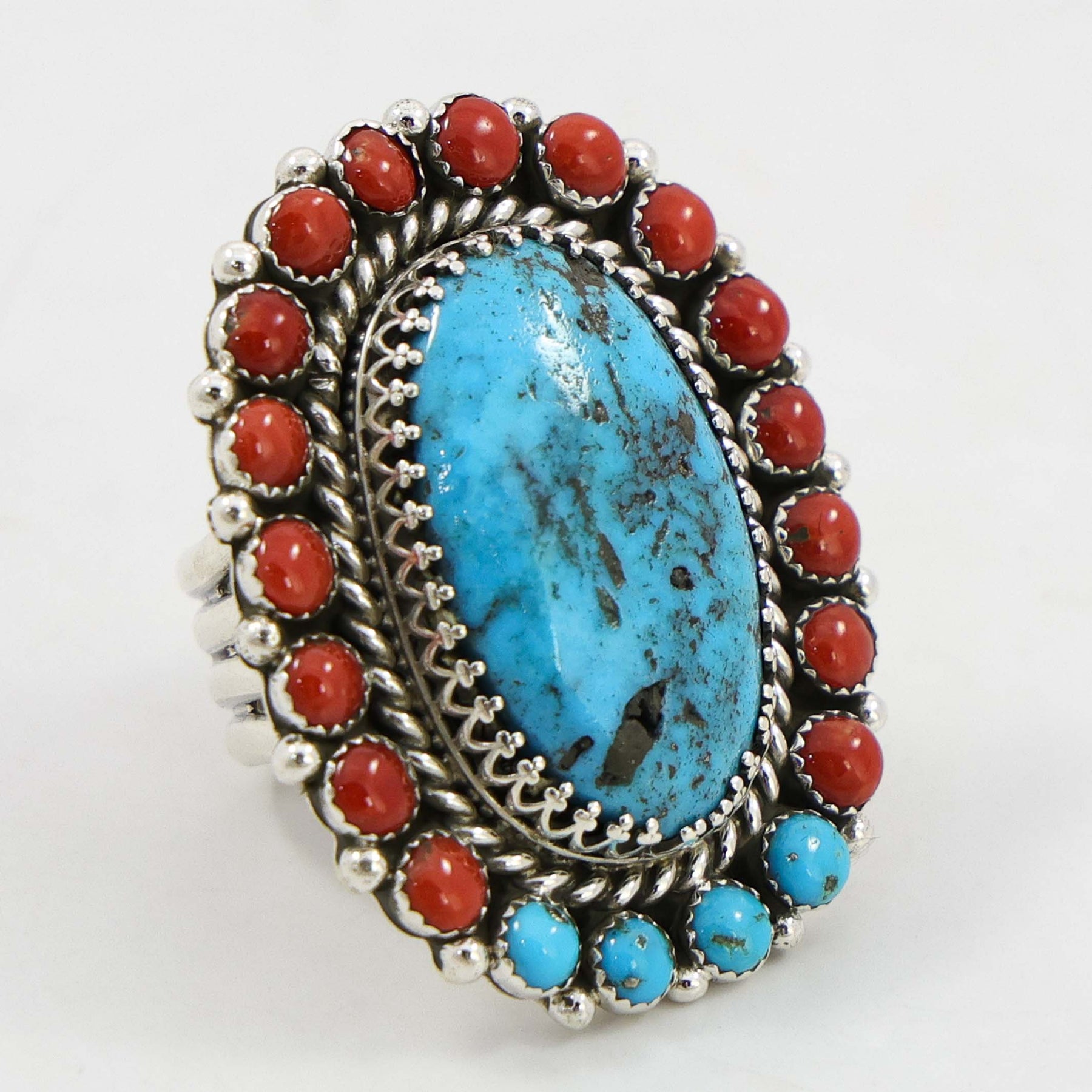 Sterling Silver Ring set with Natural Kingman Turquoise from Arizona and Coral.