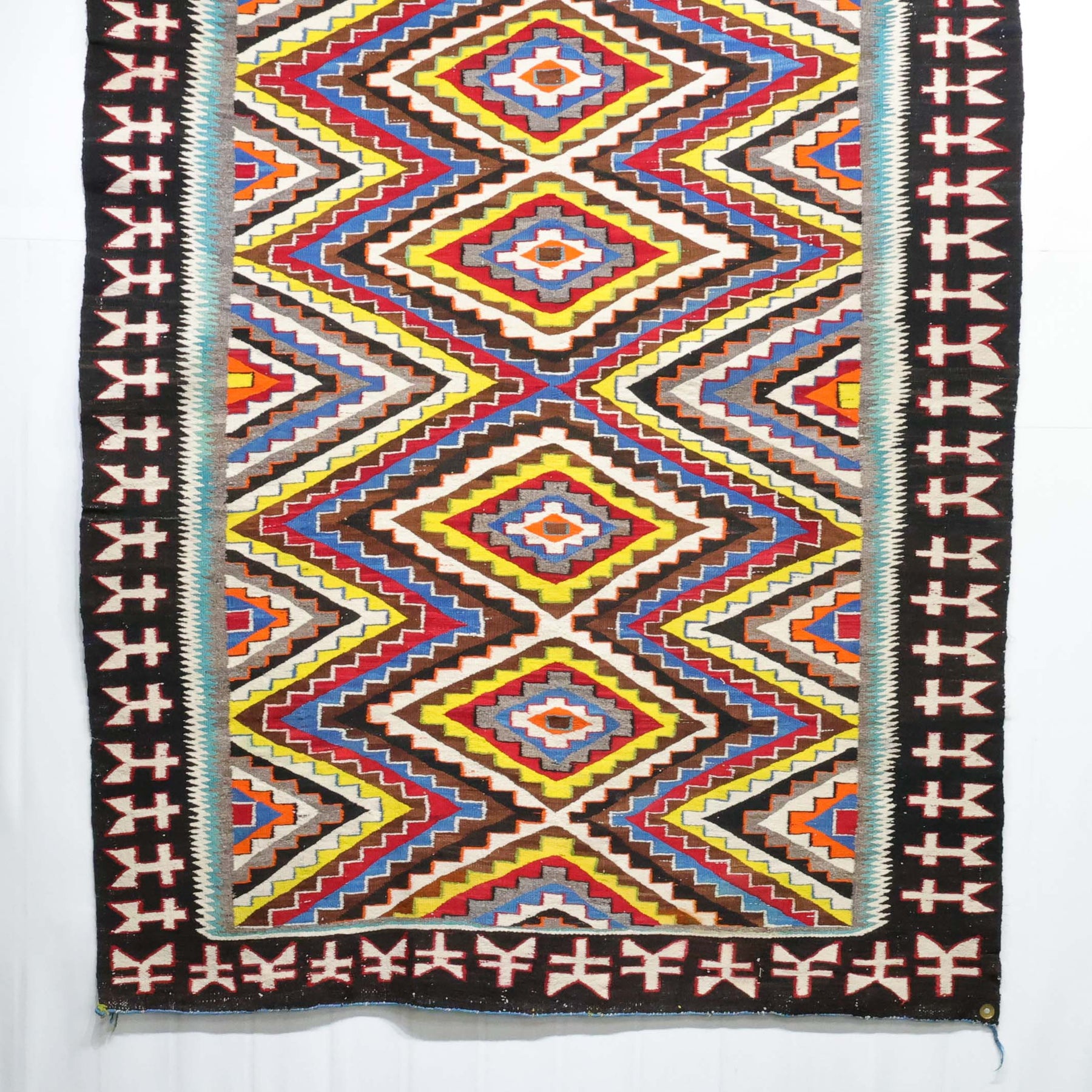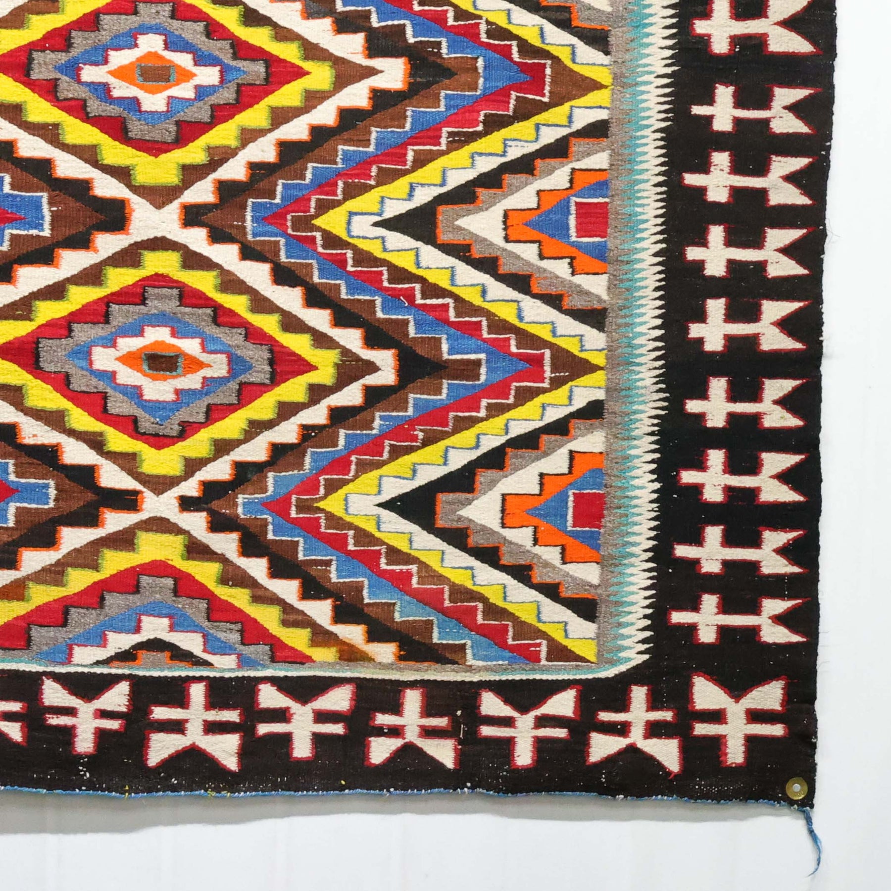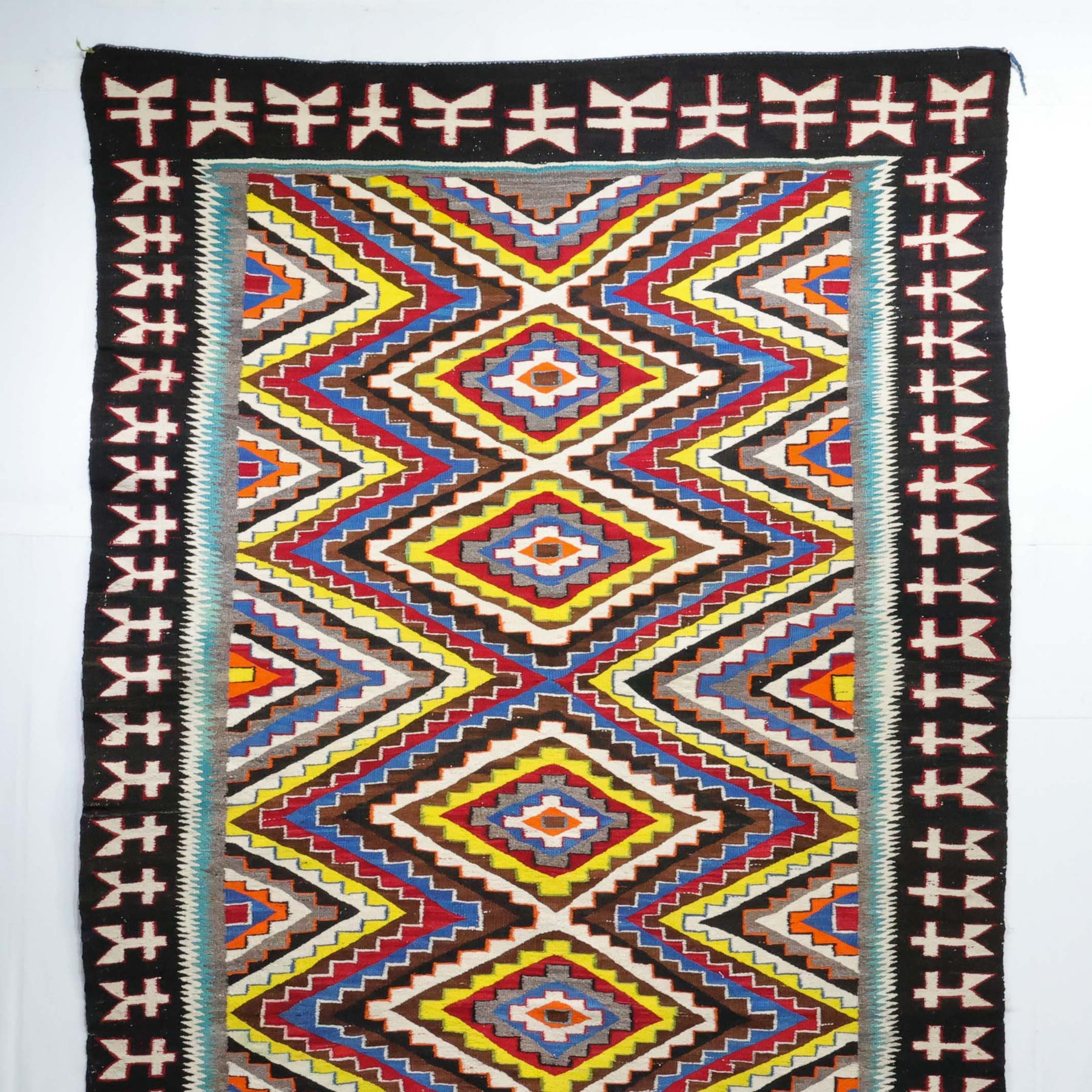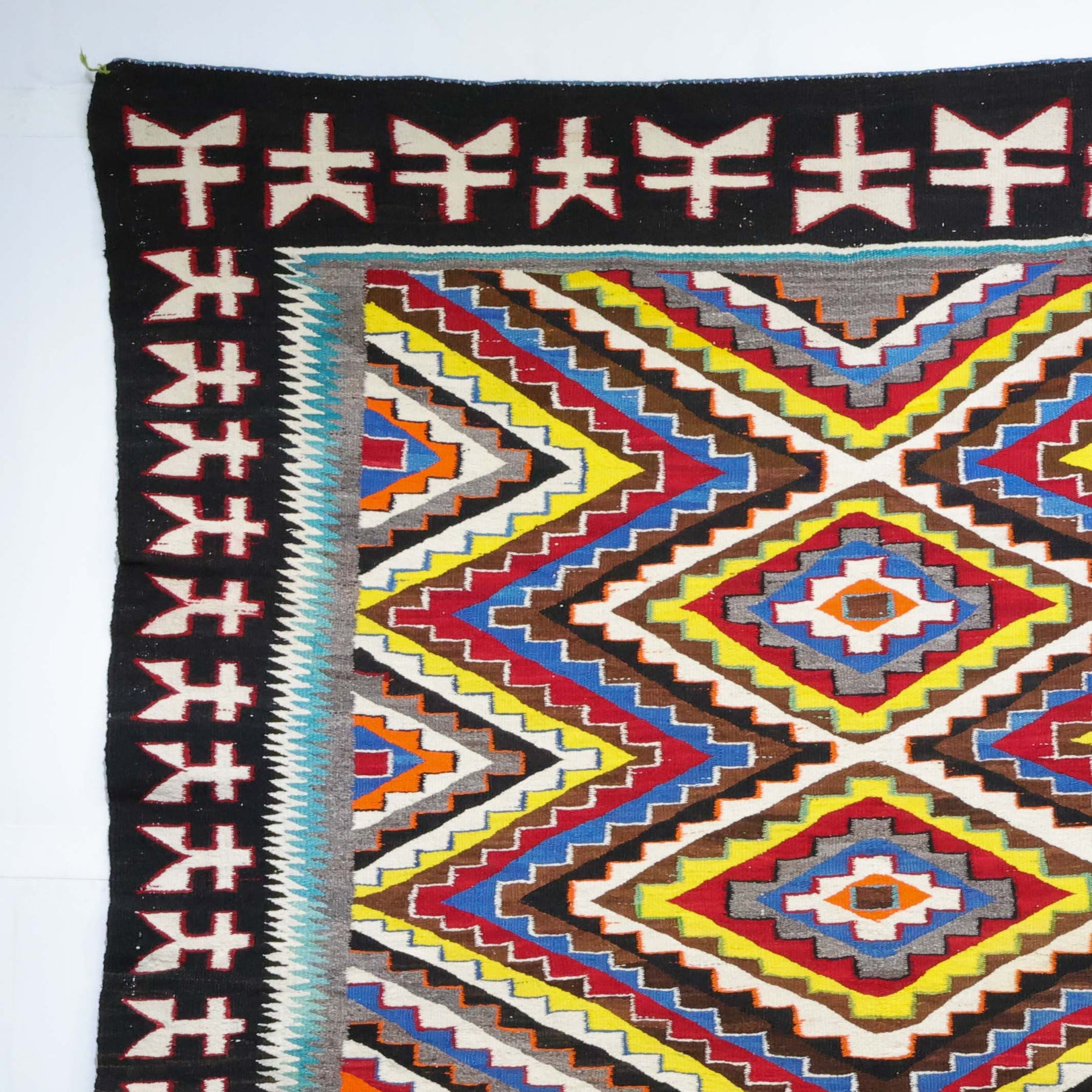 1930s Handwoven Navajo Red Mesa Outline Weaving with Intricate Serrated Diamond Design using Bright Aniline Dyed Colors.