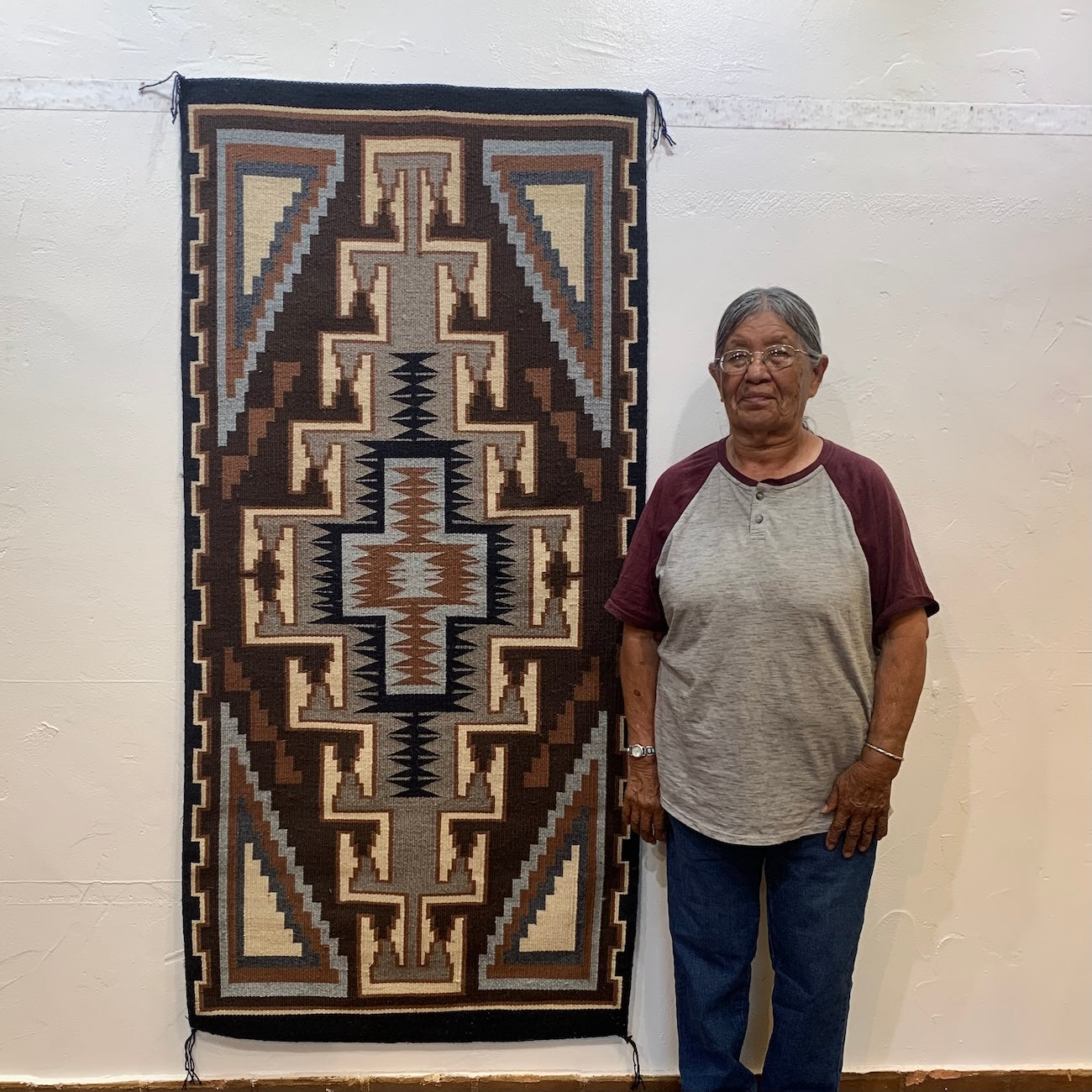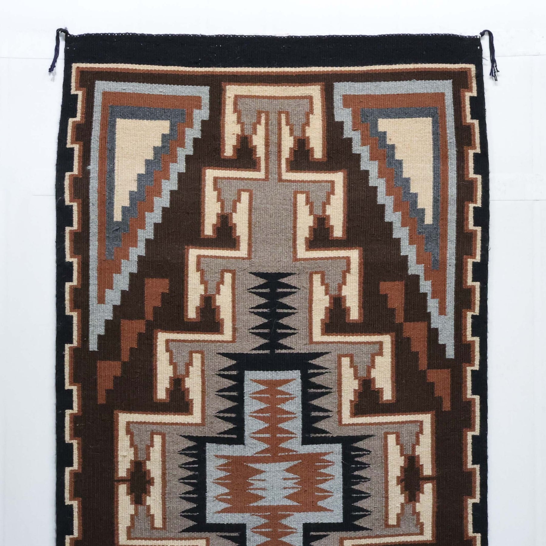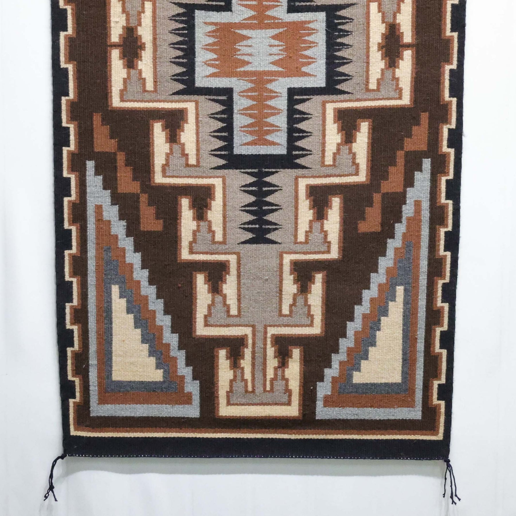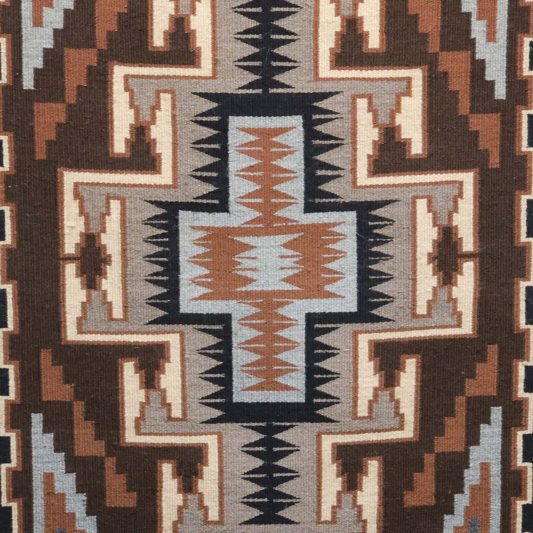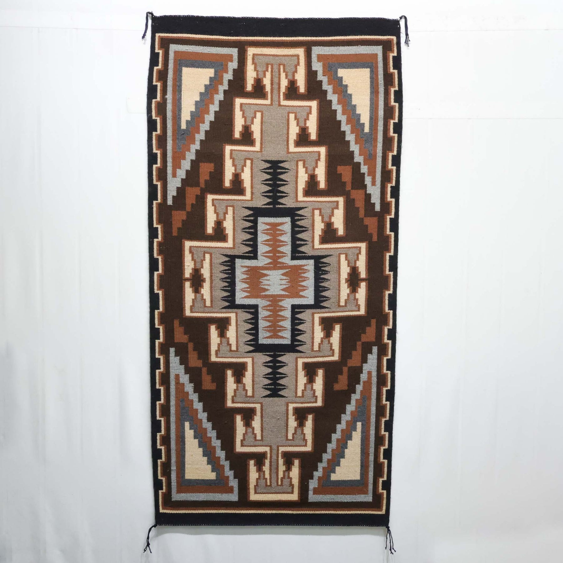 Handwoven Navajo Two Grey Hills Weaving Featuring a Central Diamond Motif with Grey and Brown Hues.