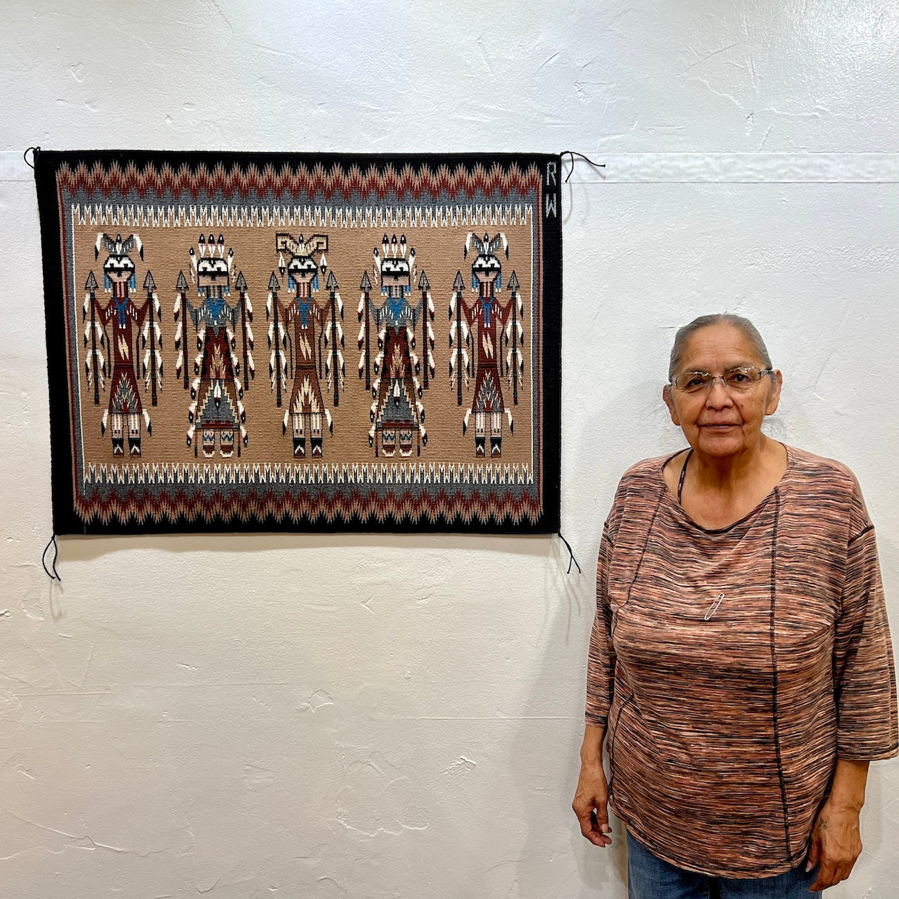 Intricate Handwoven Sandpainting Yei Weaving with Five Yei (Navajo Healing Spirits) Figures on a Brown Background.