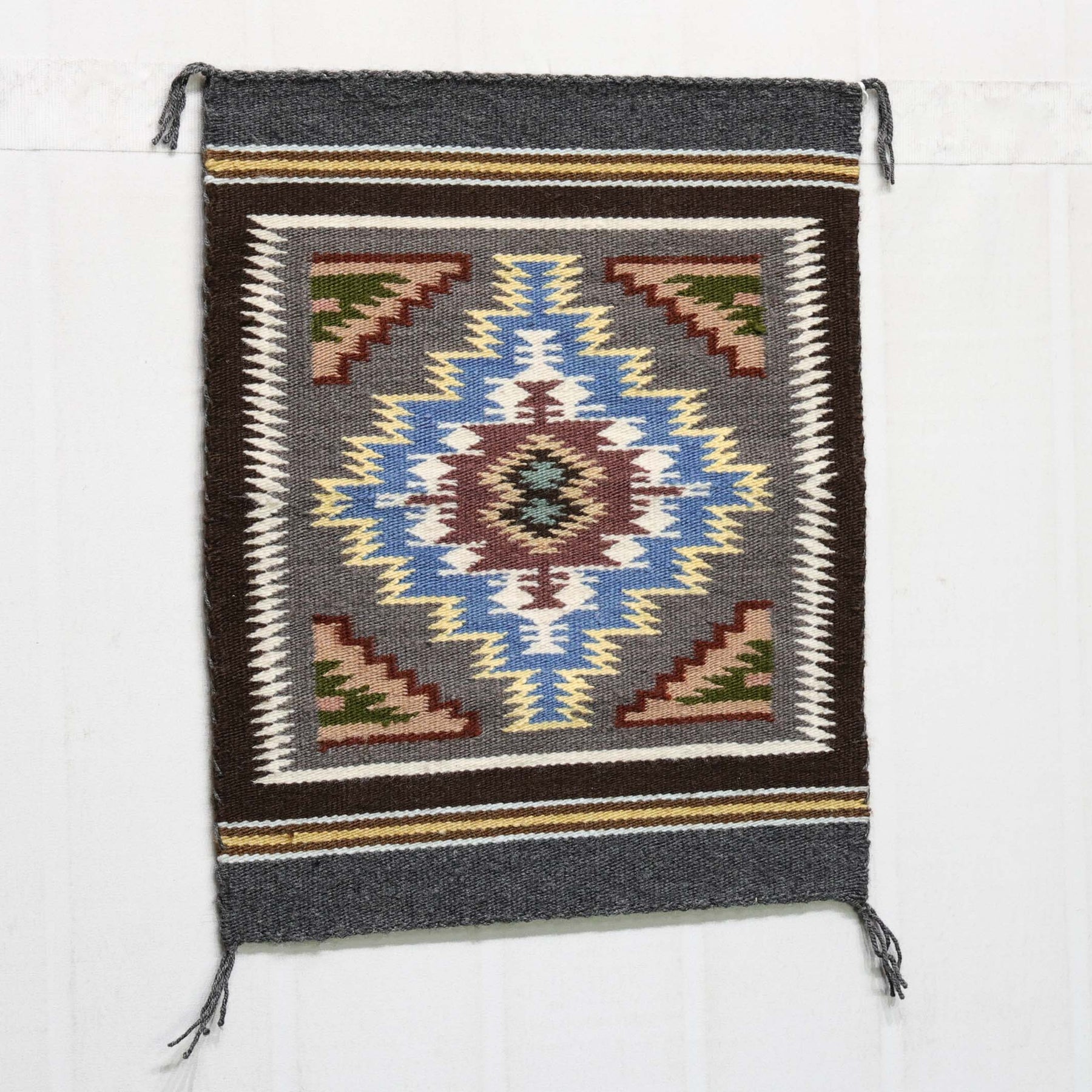 Handwoven Navajo Burntwater Weaving with a Central Blue Diamond.