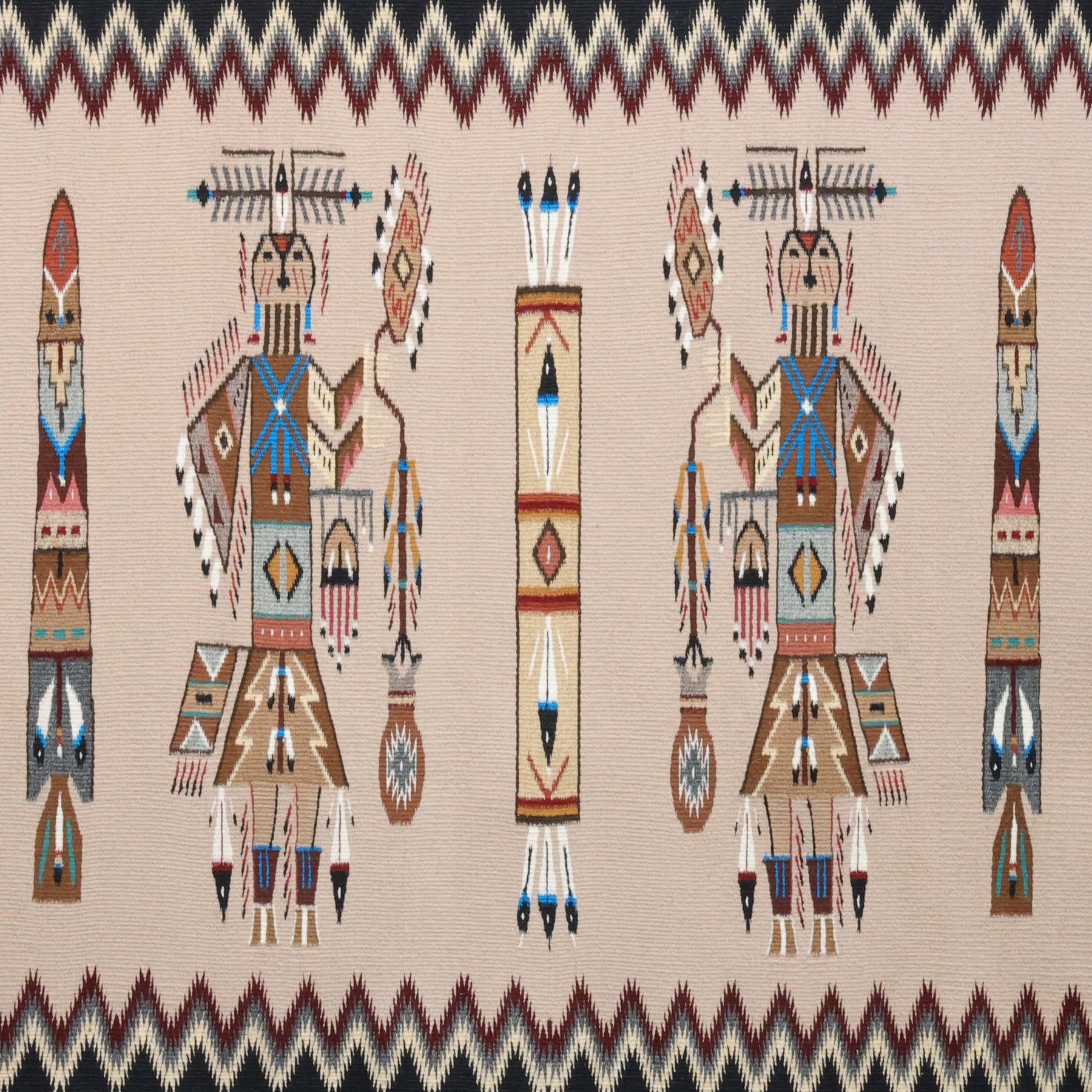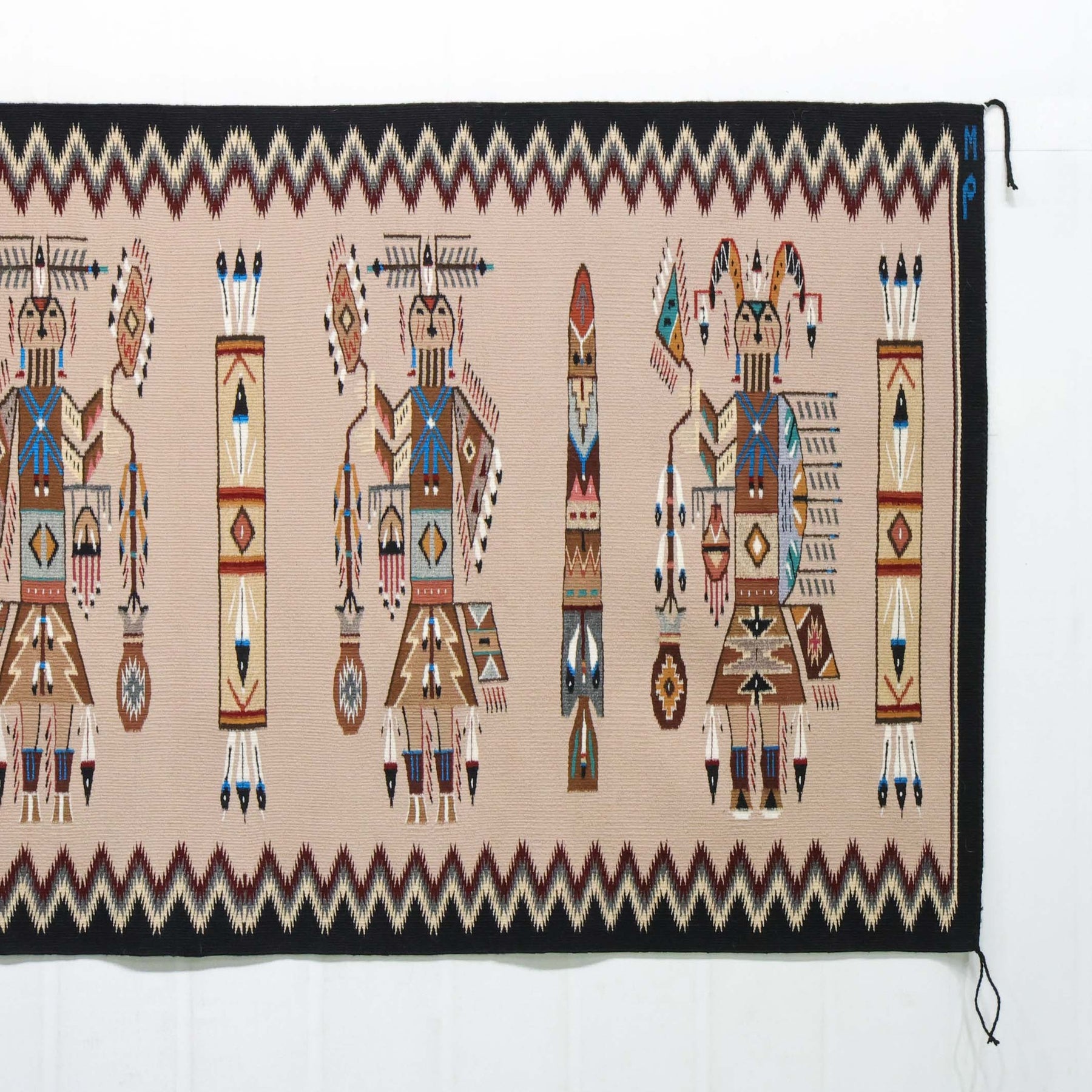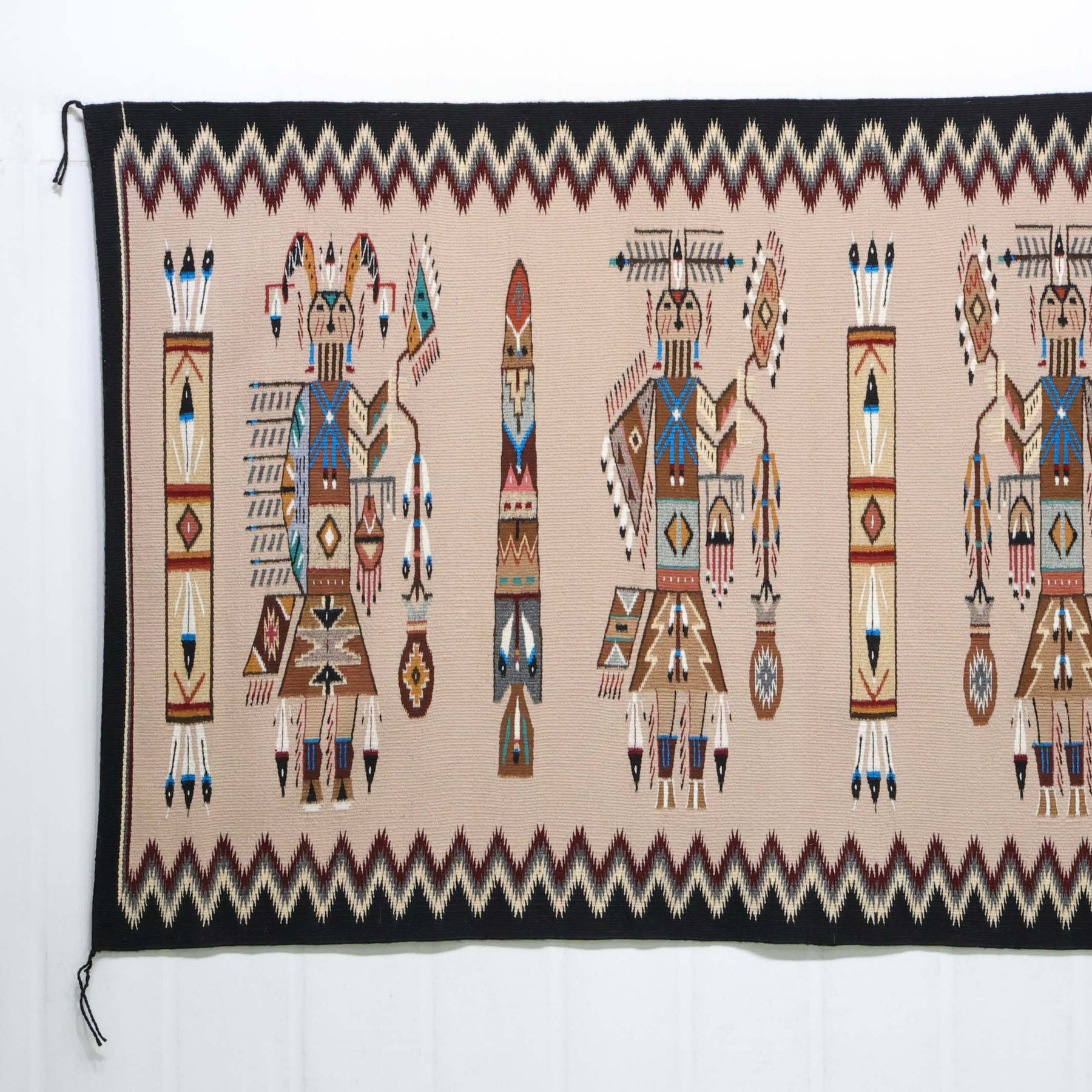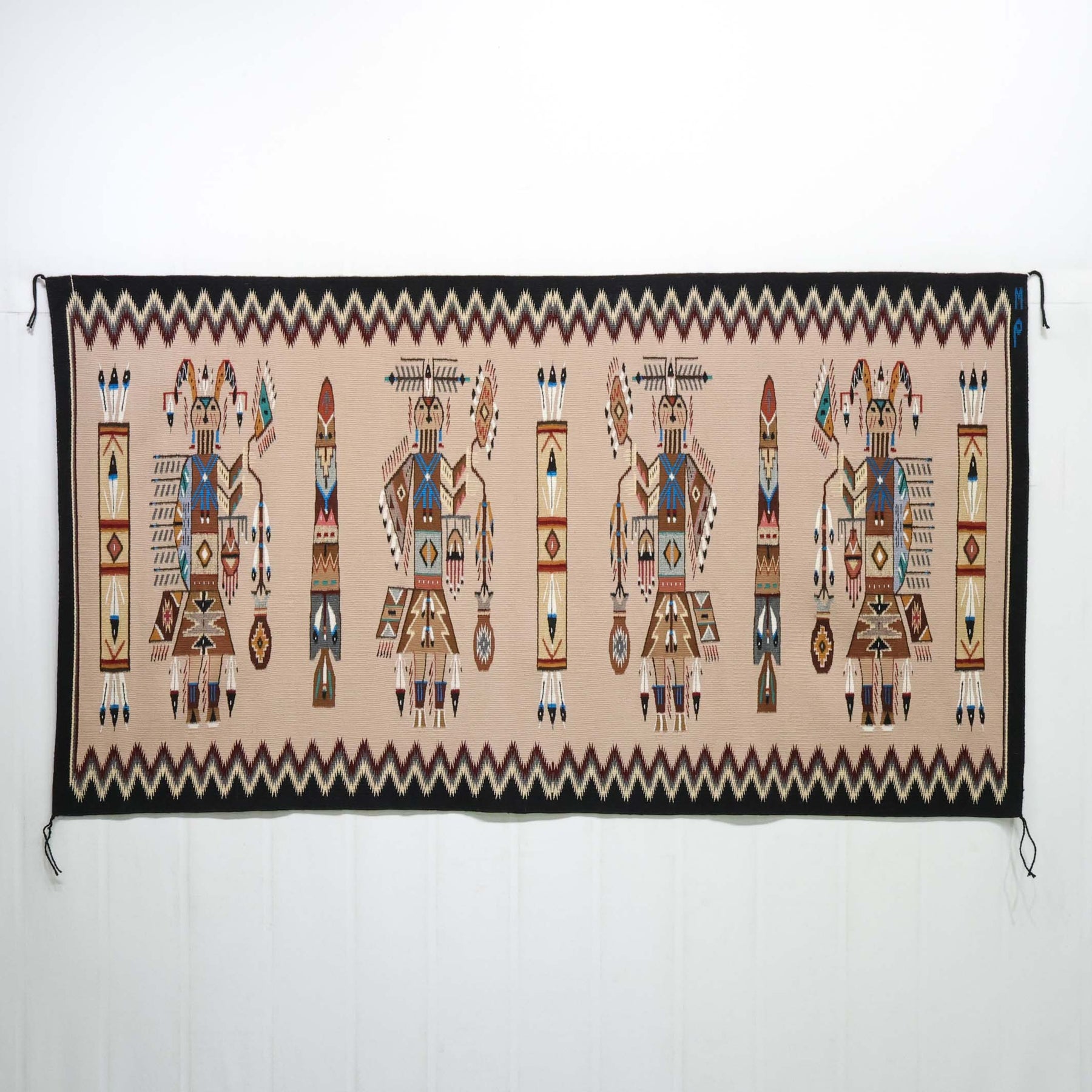 Fine Handwoven Navajo Yei Weaving with Four Intricate Yei Figures (Sandpainting Healing Spirits) and a Serrated Border.