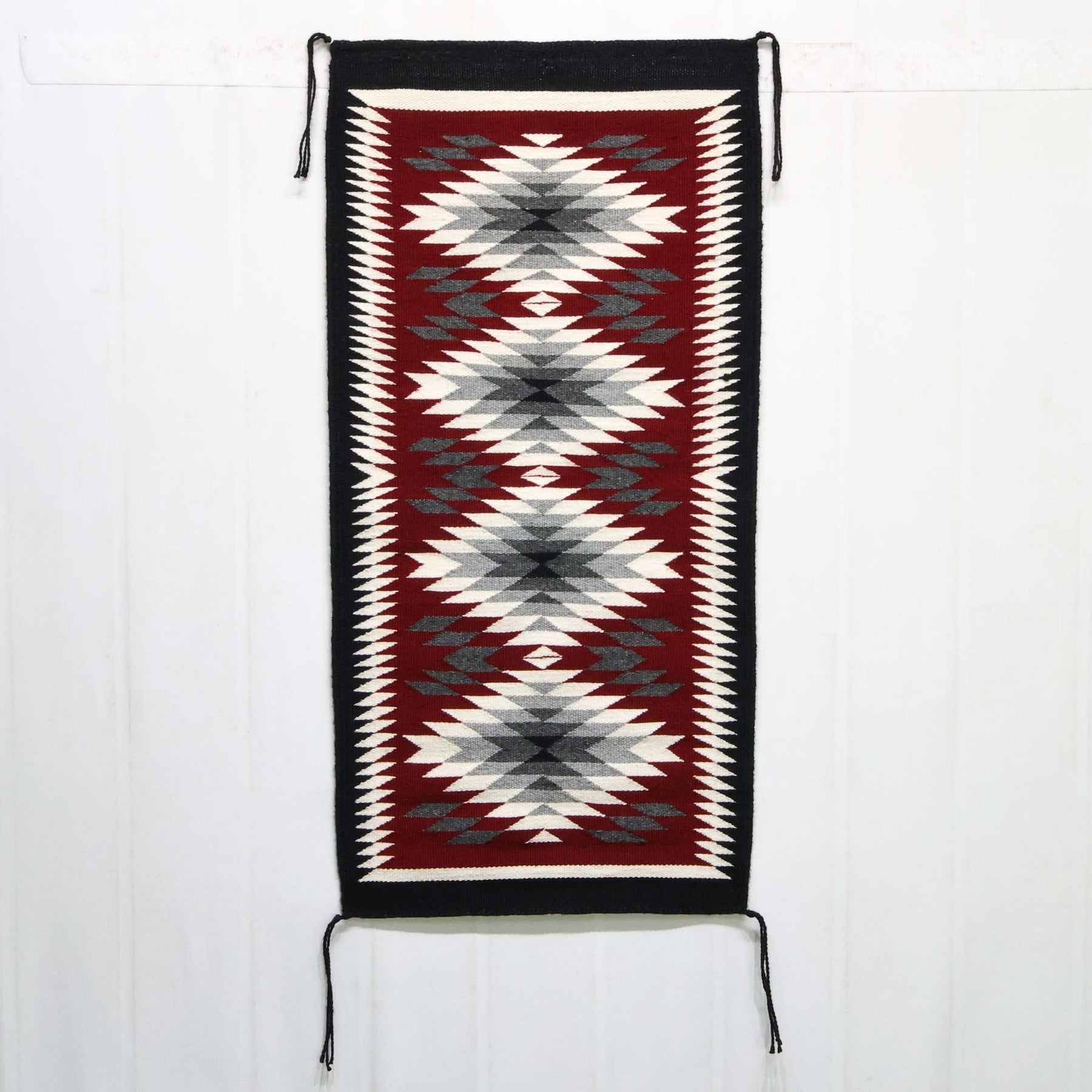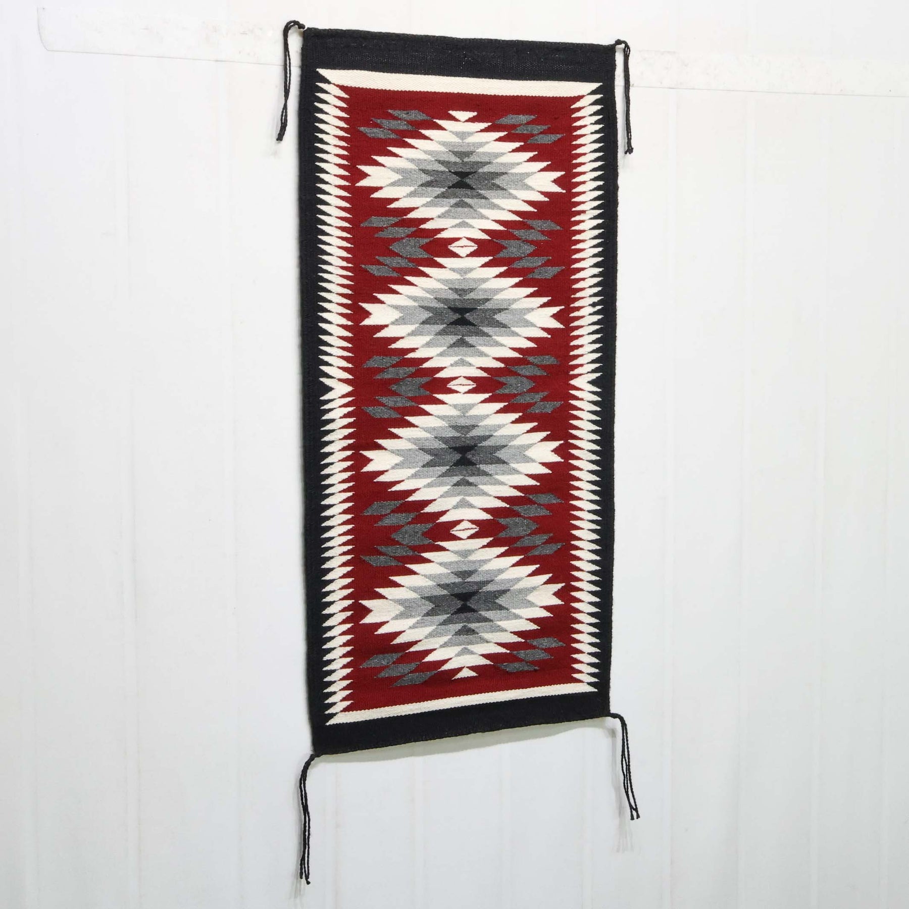 Handwoven Navajo Ganado Weaving with Four Serrated Diamonds on a Red Background.
