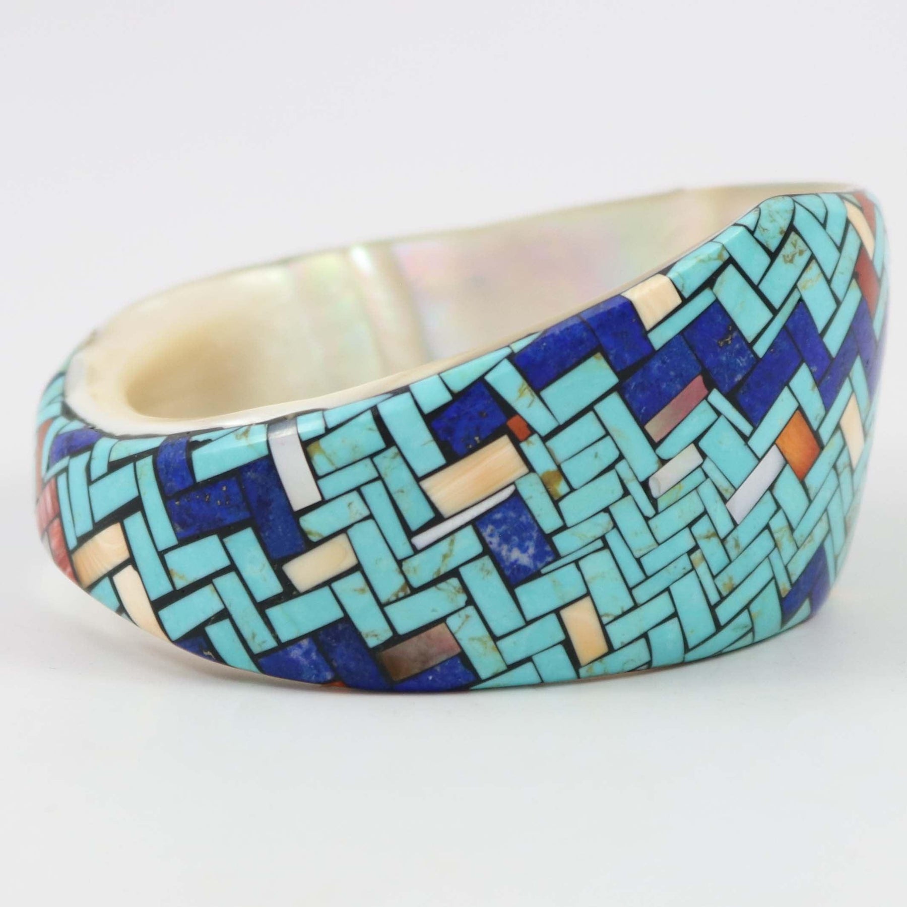 Shell Bangle Bracelet with Mosaic Inlaid Turquoise, Lapis, Mother of Pearl Shell, Spiny Oyster Shell, and Jet.