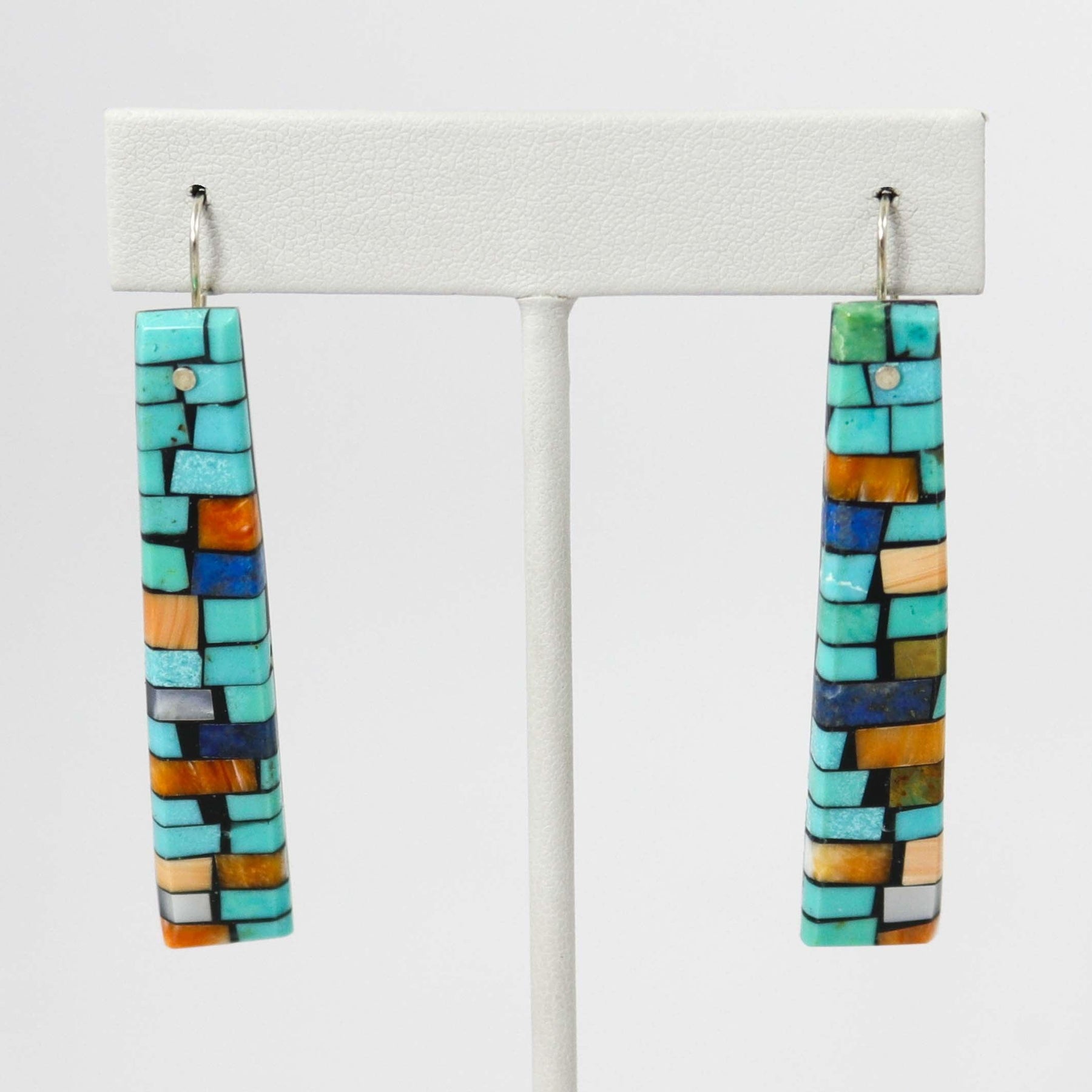 Sterling Silver French Hook Dangle Earrings with Mosaic Inlaid Turquoise, Spiny Oyster Shell, Mother of Pearl Shell, Melon Shell, and Lapis on a Shell Backing.