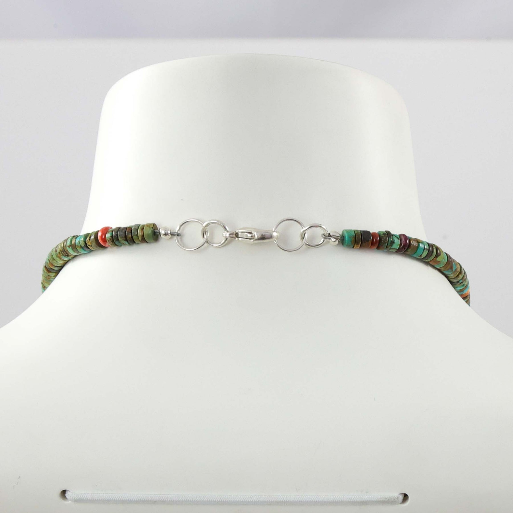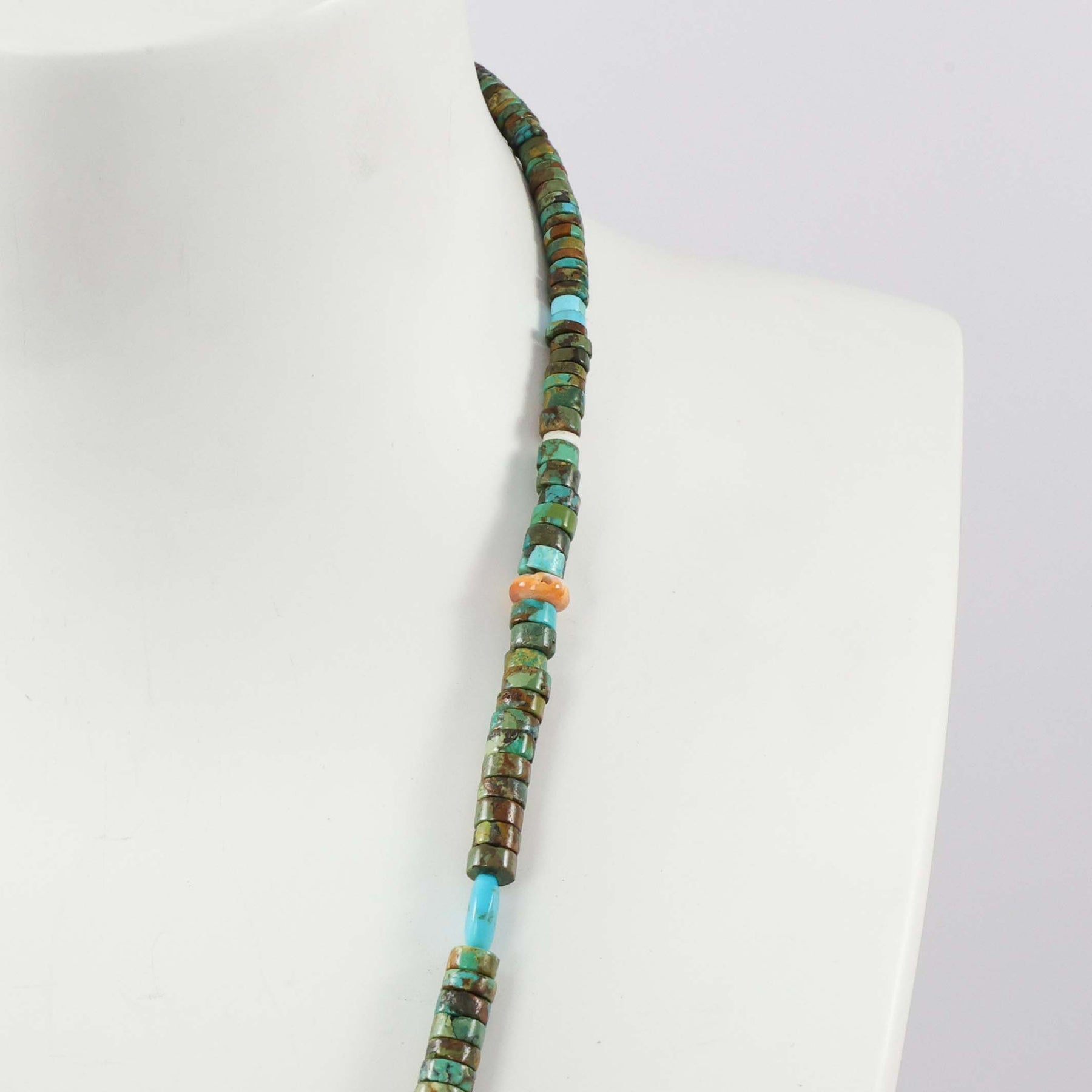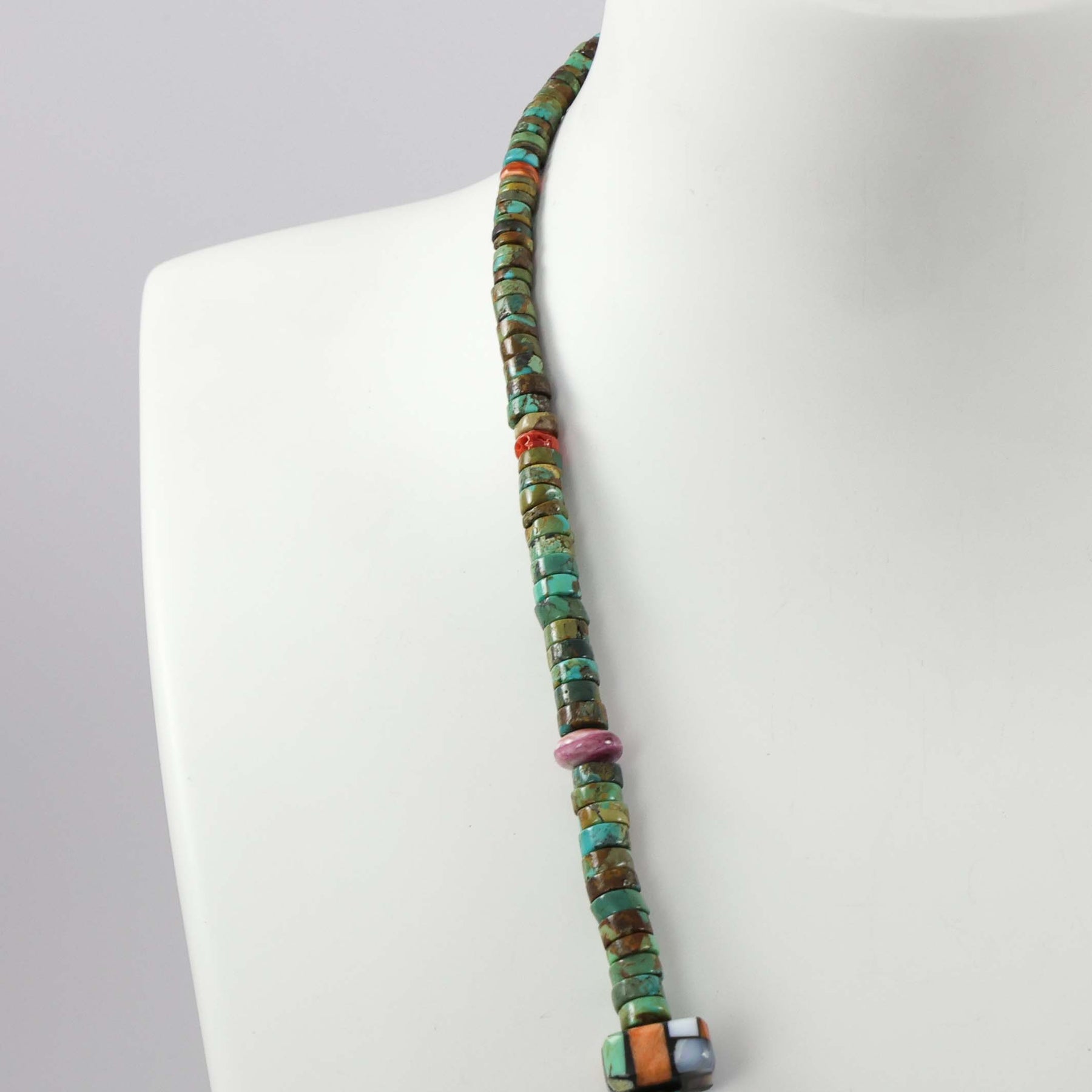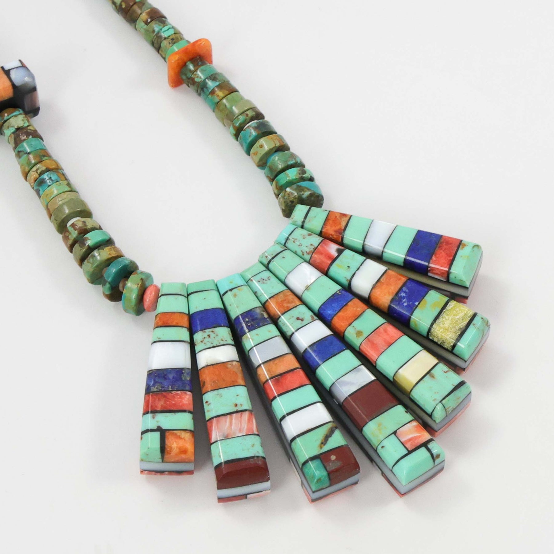 Reversible Single Strand Turquoise Bead Necklace Featuring Seven Central Tabs with Mosaic Inlaid Turquoise, Spiny Oyster Shell, Mother of Pearl, Gold Lip Mother of Pearl, Lapis, Jet, and Pipestone.