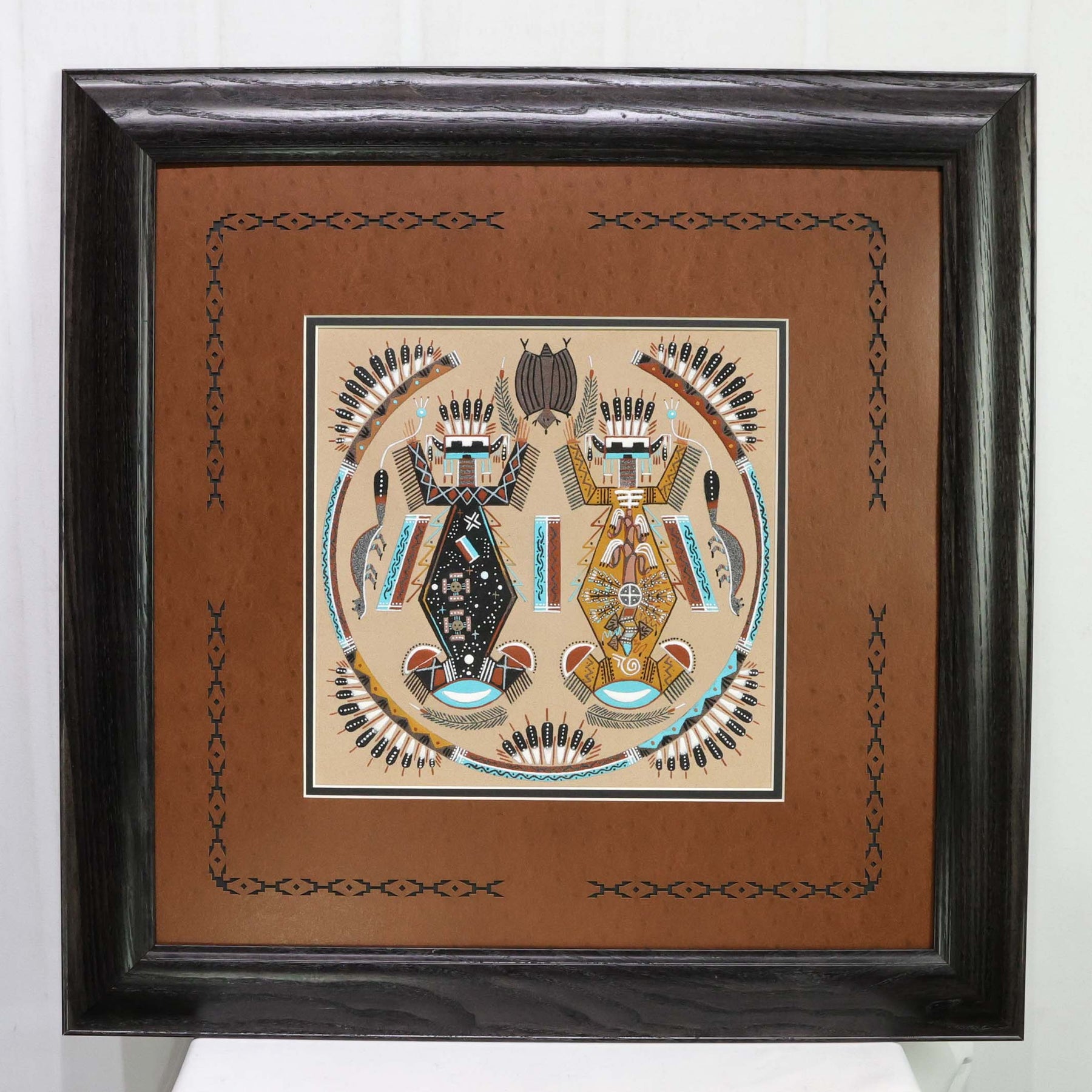 Framed and Matted Navajo sandpainting by Alberta Begay depicting Mother Earth and Father Sky, representing the balance between the natural world and the cosmos. The figures are adorned with corn, celestial symbols, and ceremonial regalia, symbolizing harmony and interconnectedness. The design is crafted using sand made from crushed rocks and minerals, applied to a wooden base. The piece is wired for wall hanging. The piece is wired for wall hanging.