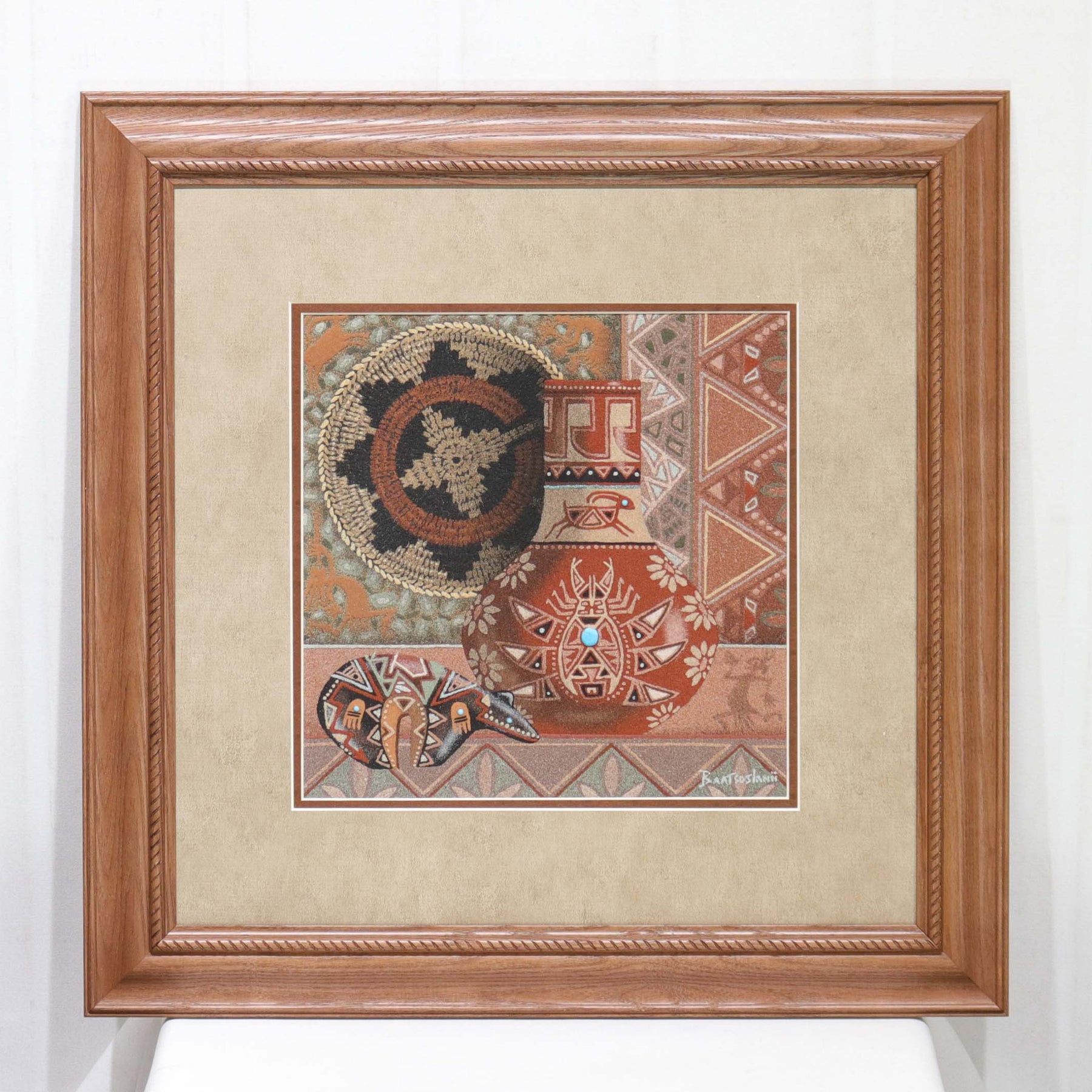 Framed and Matted Navajo Sandpainting by Eugene Baatsoslanii Joe. This still life sandpainting beautifully presents a lifelike Navajo ceremonial basket and a replica of a Tony Da pottery vase and bear, accompanied by geometric and petroglyph designs. The pottery design is set with genuine turquoise stones, adding depth and texture to the artwork. Navajo sandpaintings are created solely from crushed rocks and minerals. Various hues of sand are meticulously arranged to form intricate paintings, without the use of paints or additional colors.