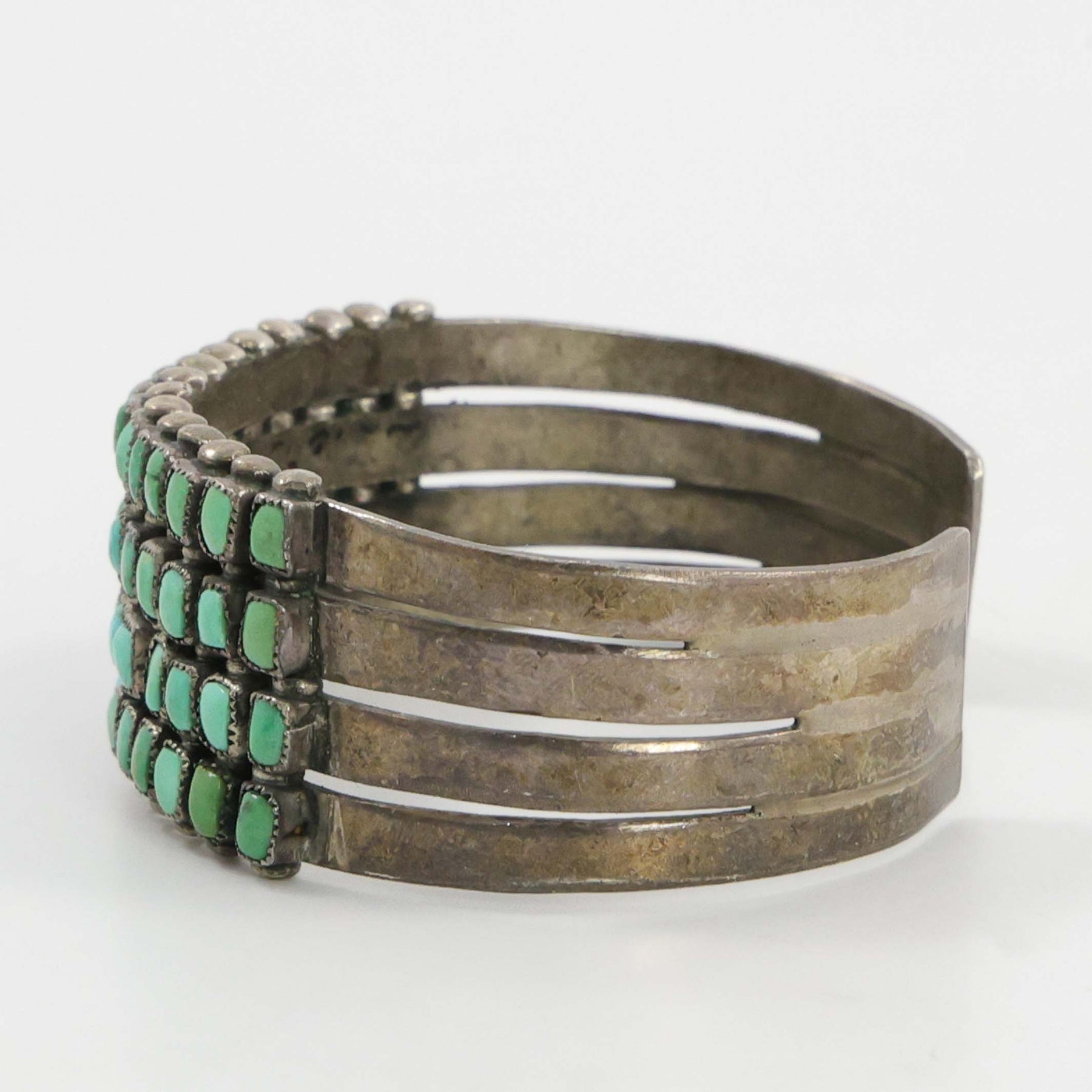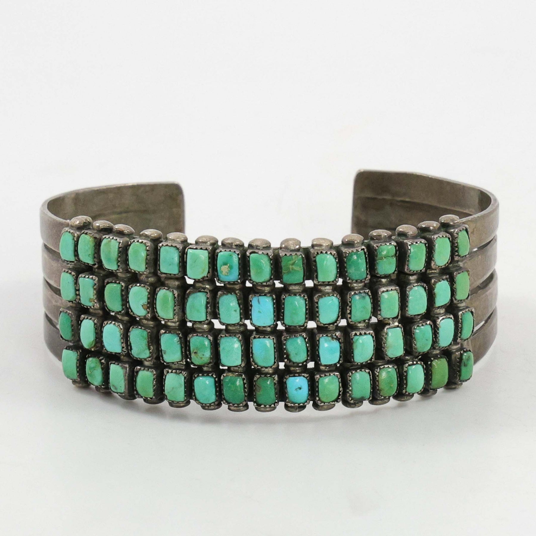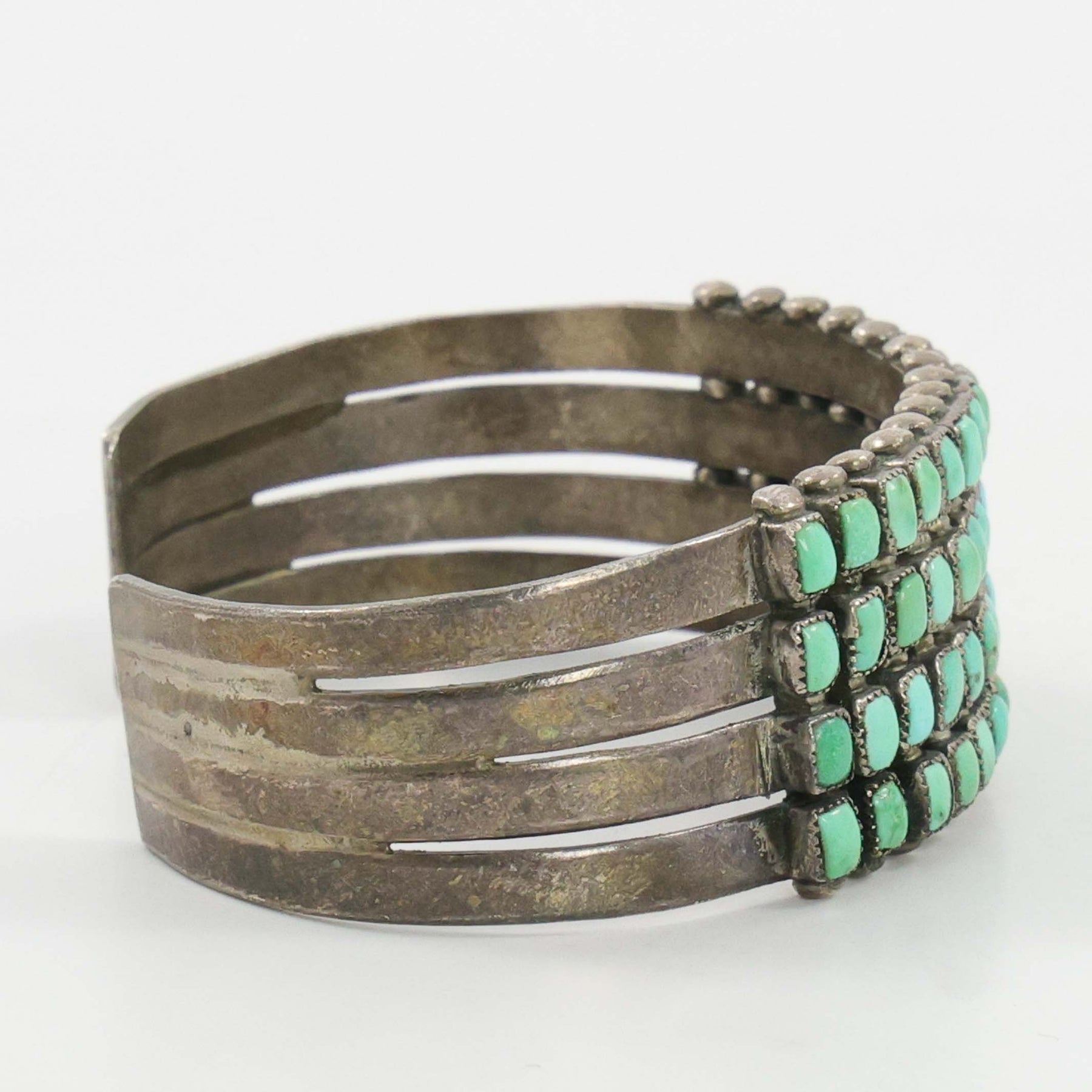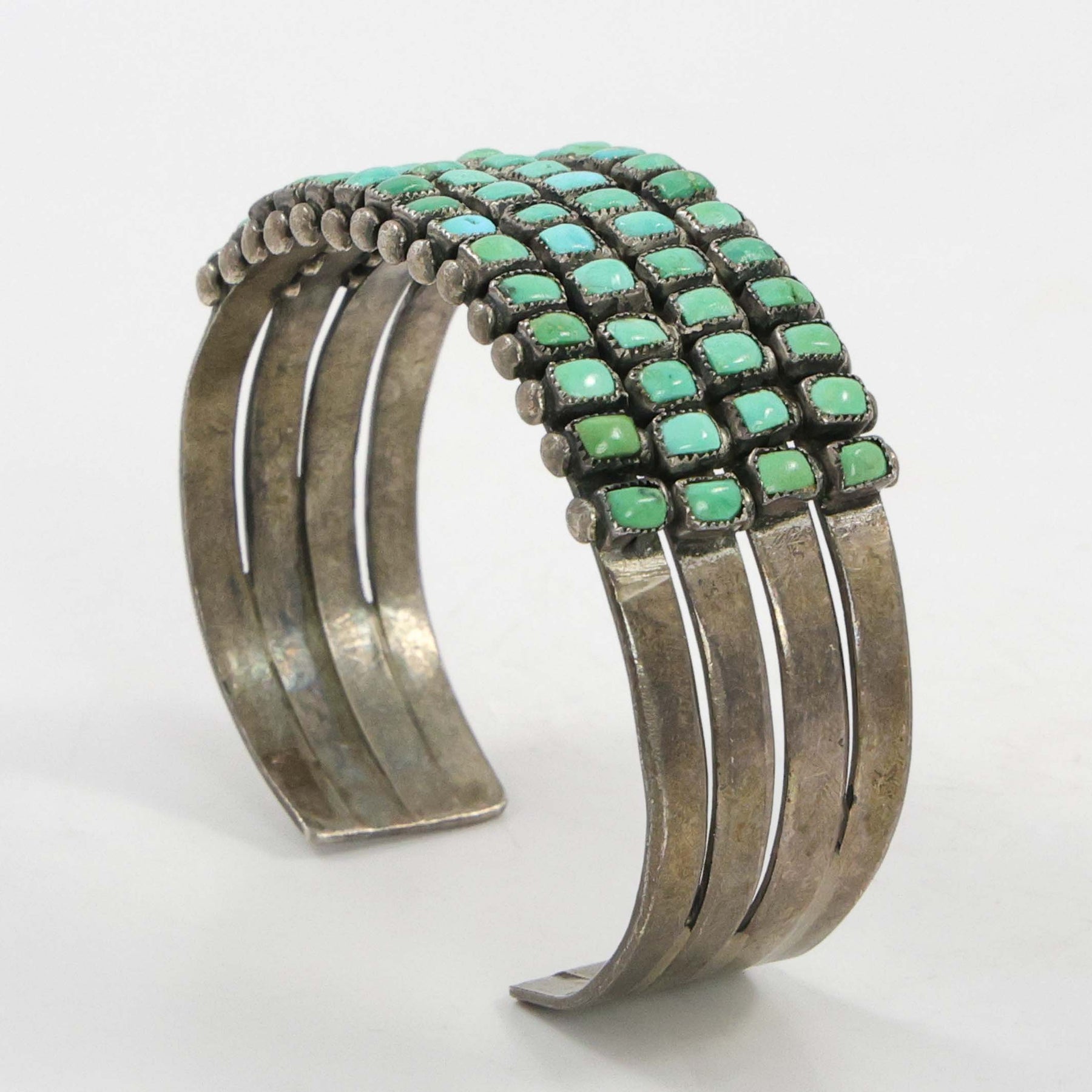 1930s Zuni Sterling Silver Cuff Bracelet set with Four Rows of Hand Cut Square Natural American Turquoise Stones.