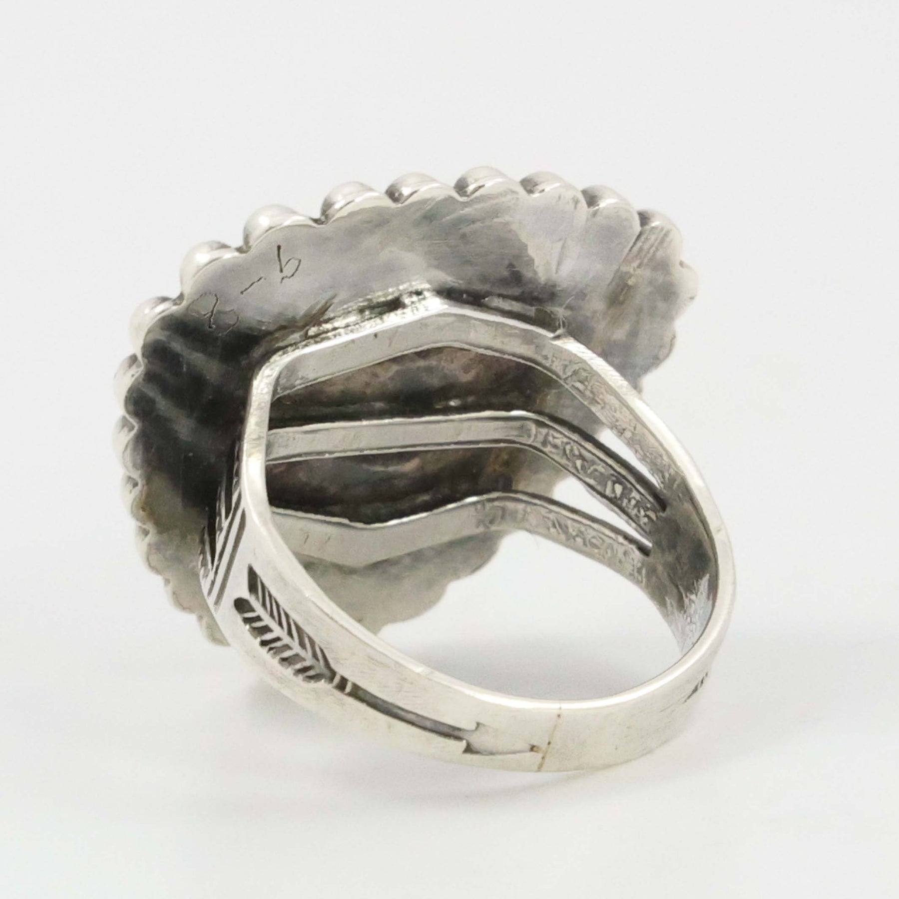 1940s Navajo Sterling Silver Fred Harvey Ring with Hand Stamped Designs on the Band and set with Natural American Turquoise. The ring comes in its original ‘Maisel’s Indian Trading Post’ box, an extremely rare find. Maisel's Indian Trading Post opened in Albuquerque in 1939 and by the 1940s employed more than 300 Navajo silversmiths.