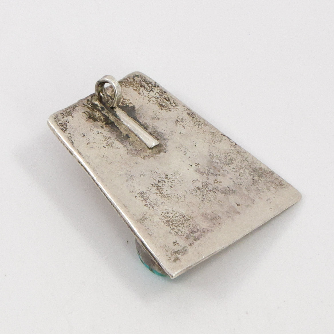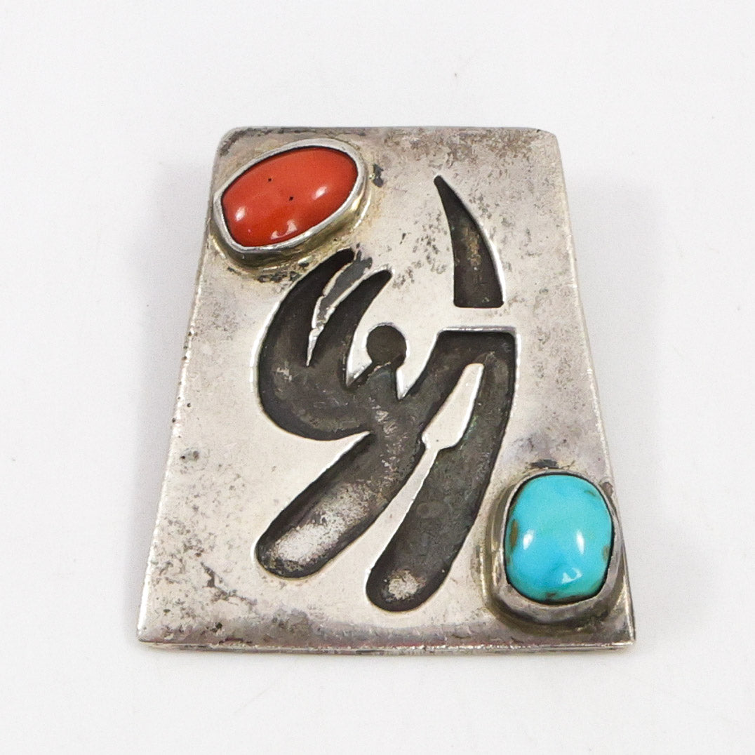 1950s Sterling Silver Pendant with a Prehistoric Bird Overlay Design and set with Mediterranean Coral and Natural American Turquoise. Due to the lack of etching on the background silver, we lean towards this being a mid-century Navajo piece made in the Hopi overlay style.