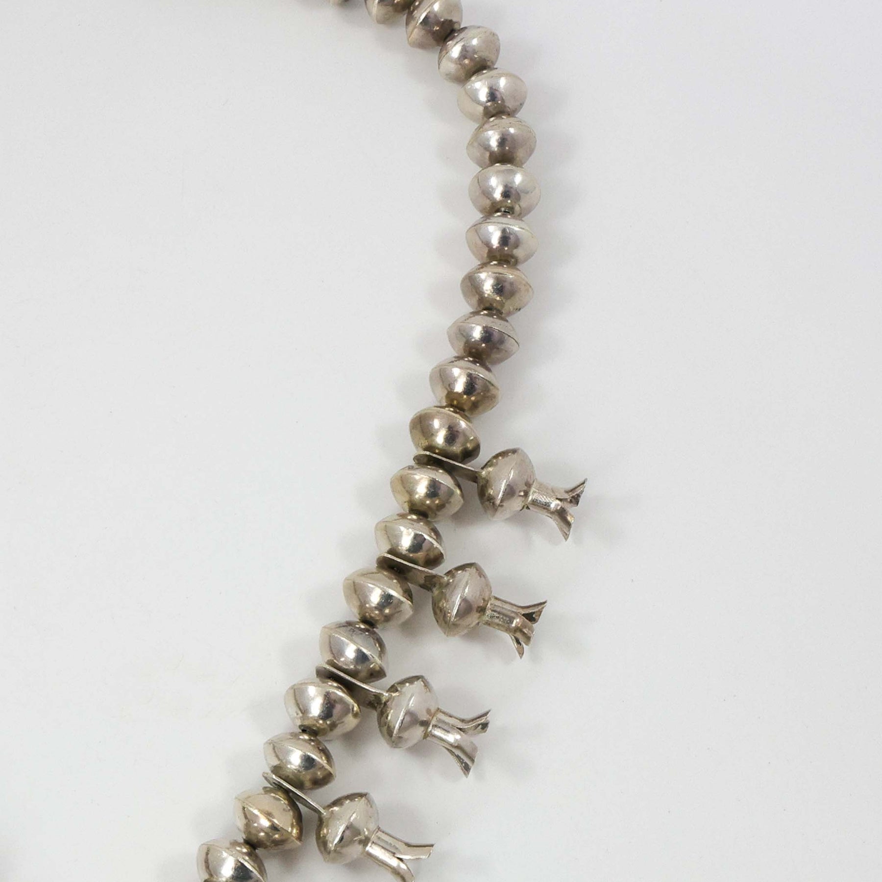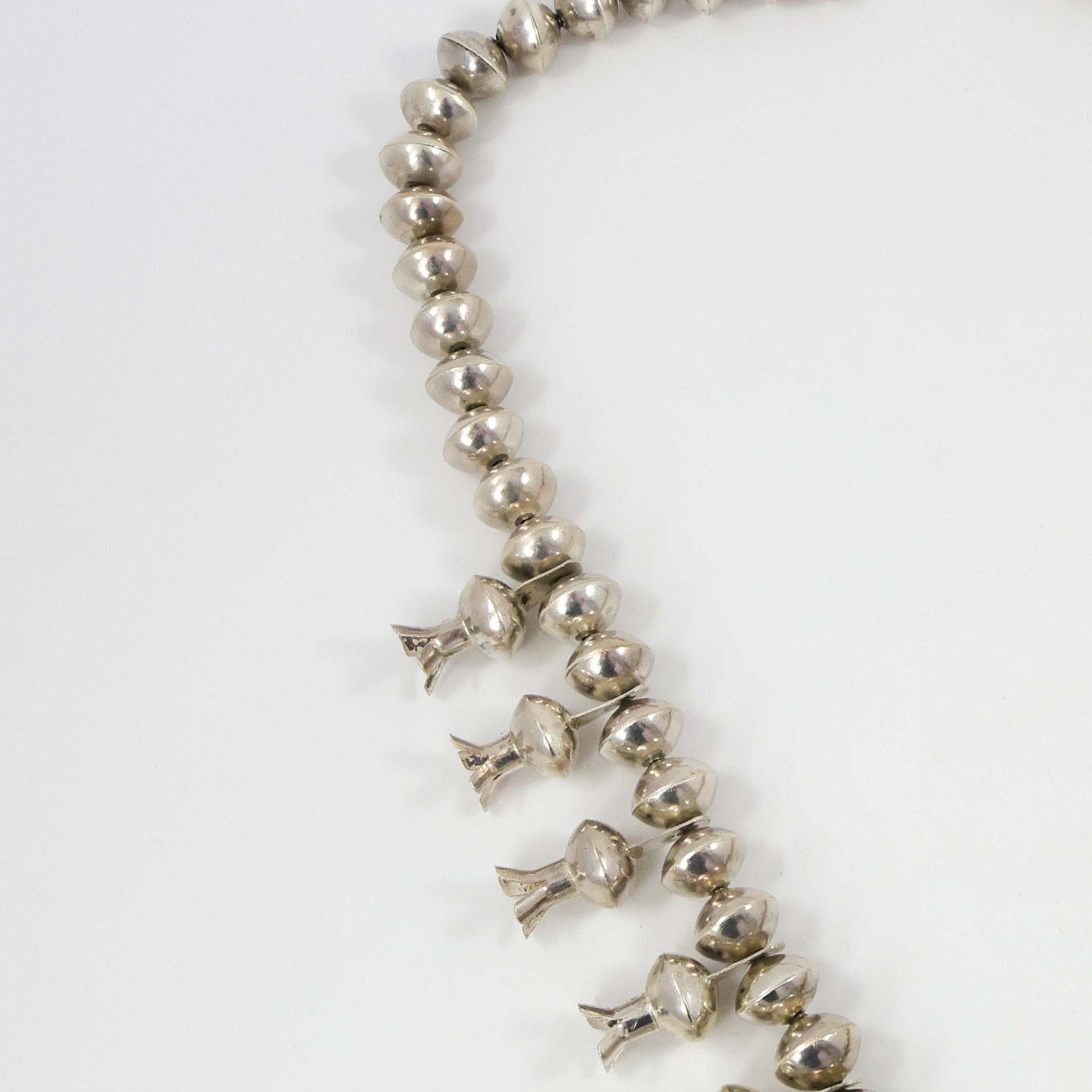 1970s Single Strand Sterling Silver Squash Blossom Necklace set with Natural Morenci Turquoise from Arizona and featuring Handmade Navajo Pearl Beads.