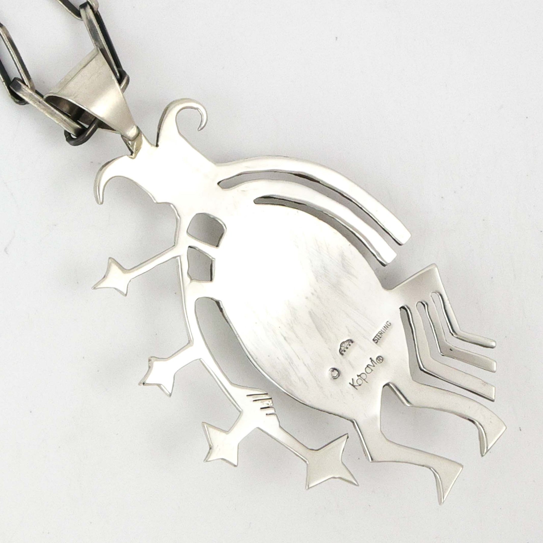 Handmade in the 1970s by Hopi master silversmith Victor Coochwytewa, this striking pendant features his iconic "Starblower" design—a stylized Hopi figure accented with stars and cosmic symbolism. Set at the center is a natural turquoise stone from the Turquoise Mountain mine with rich blue and green tones. The design highlights Victor’s signature linear and textural silverwork. The pendant hangs from a 24" handmade Hopi sterling silver chain. Signed on the reverse with Coochwytewa’s hallmark, the Kopavi mark, and stamped “Sterling.”