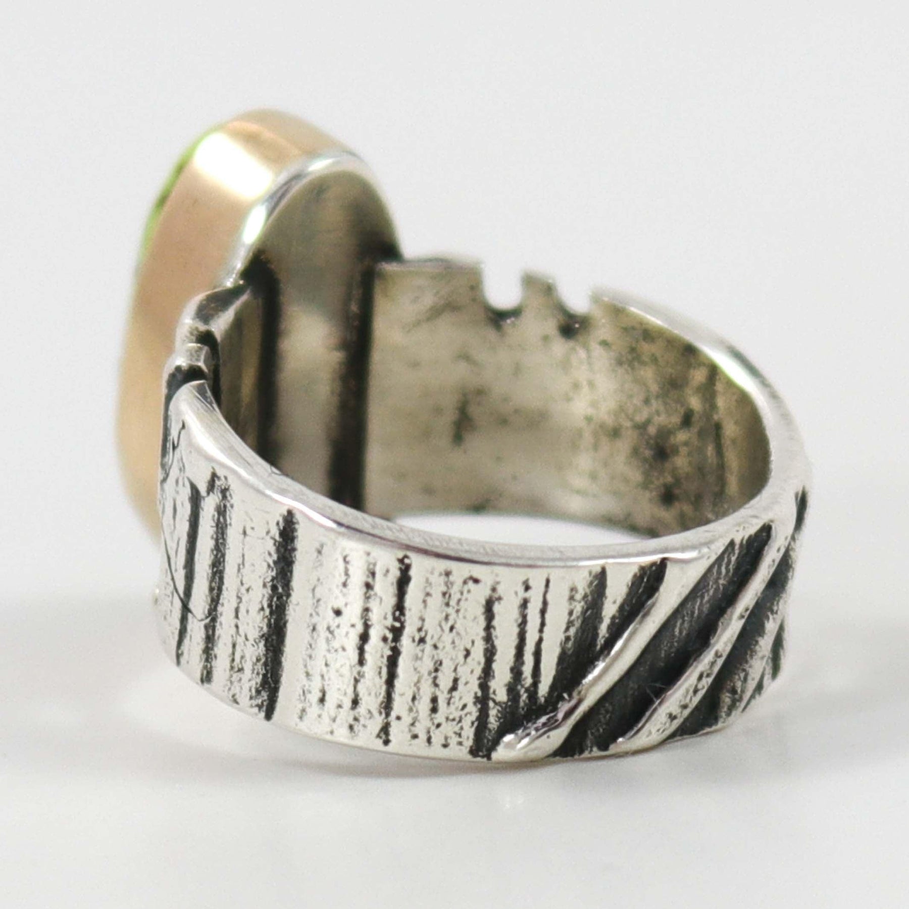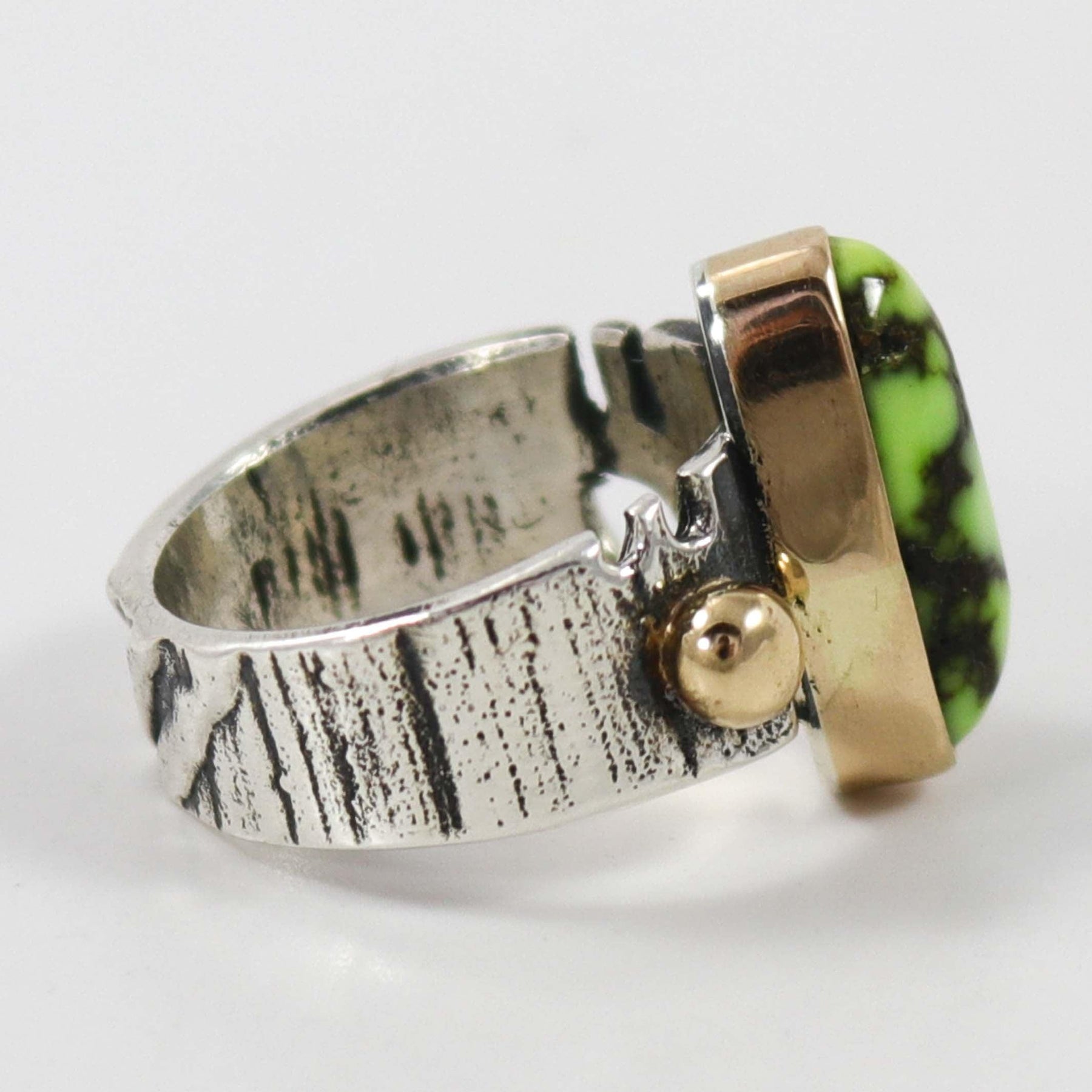 Sterling Silver Ring with a Tufa Cast Band and set with Natural Damele Turquoise from Nevada in a 14K Gold Bezel.