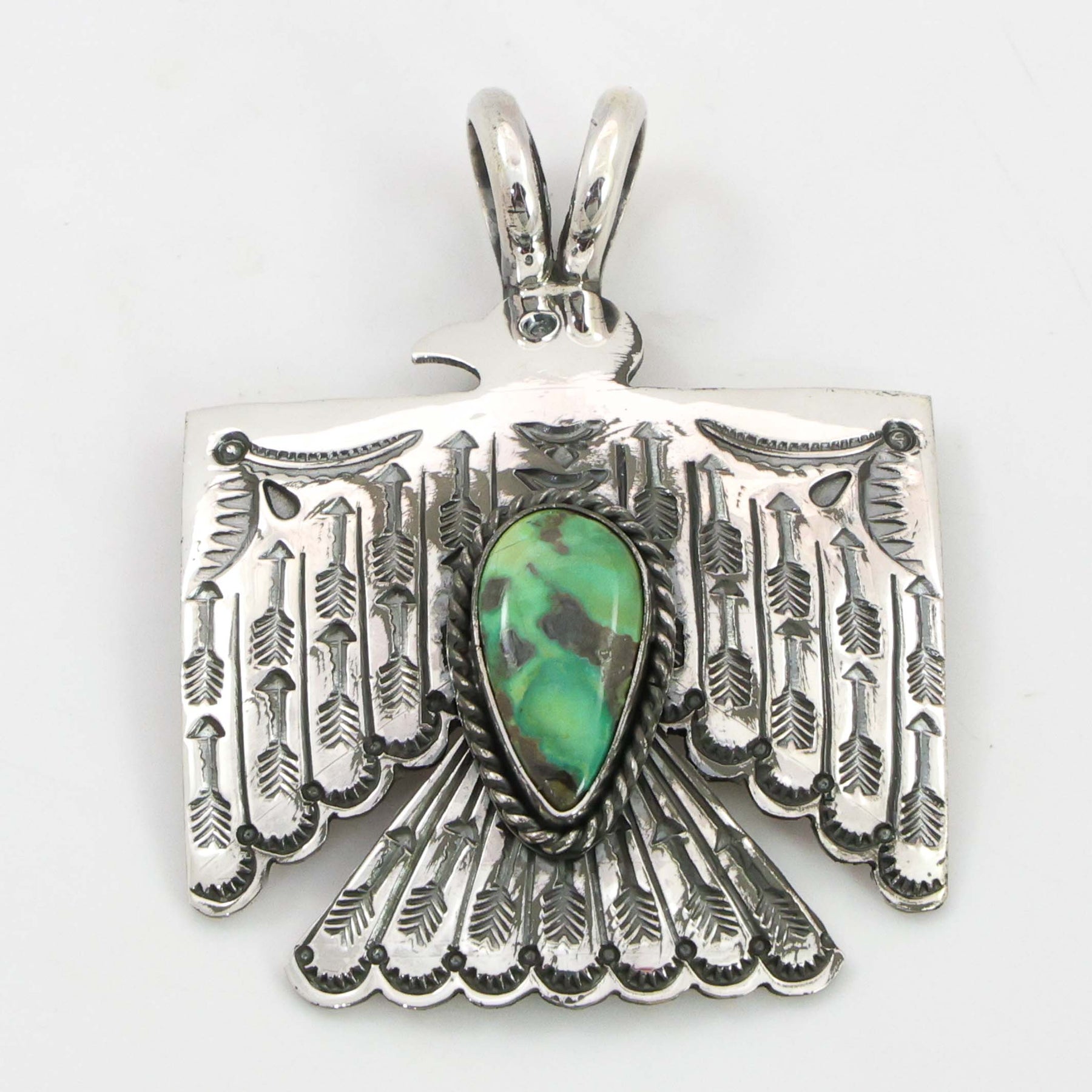 Sterling Silver Thunderbird Pendant with Hand-Stamped Designs and set with Sonoran Gold Turquoise.