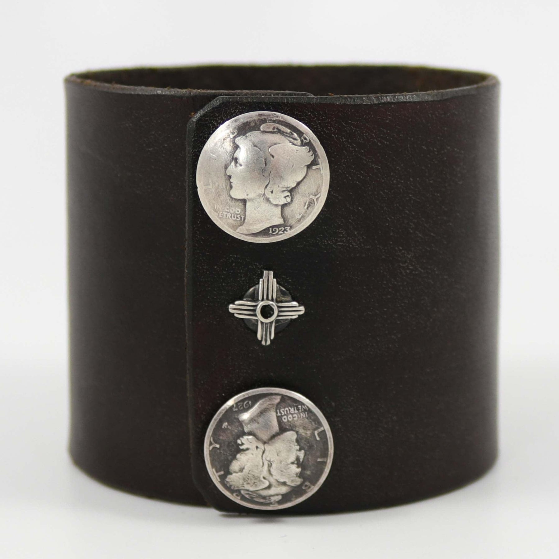 Wide Brown Leather Bracelet with a Sterling Silver Panel with Applique Designs and set with Sugilite and Natural Carico Lake Turquoise from Nevada. The bracelet features snap buttons with antique mercury dimes. This is a collaborative work by Mona Van Riper (leather and silver work) and Bruce Eckhardt (stone work).