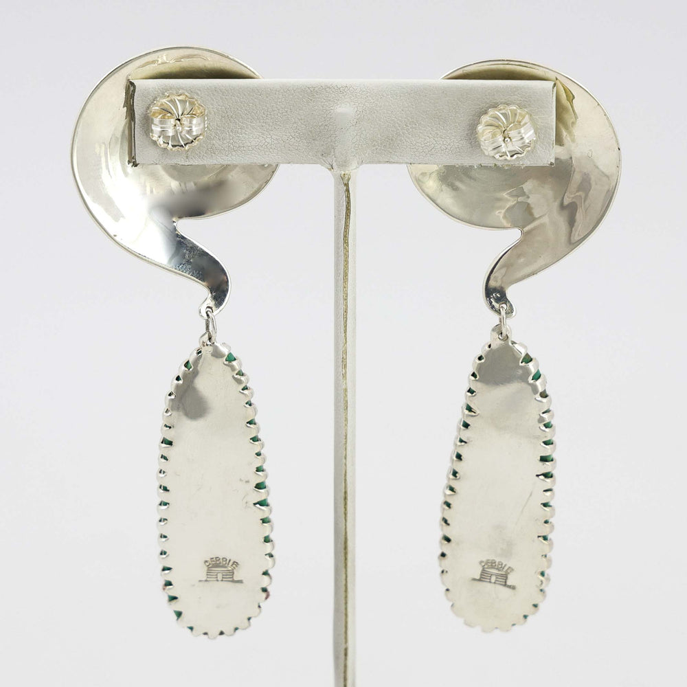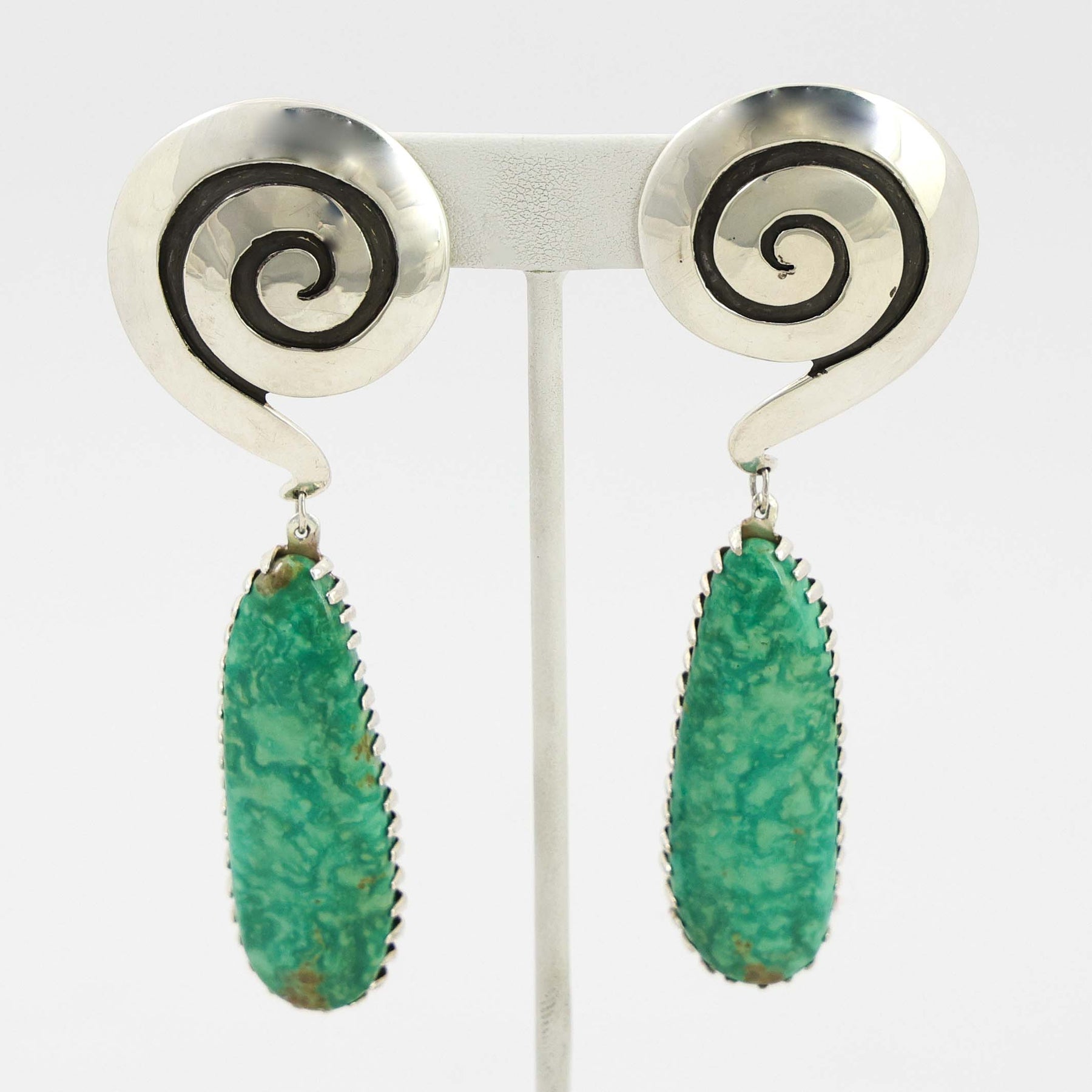 Sterling Silver Post Button and Dangle Earrings with Overlaid Swirl Designs and set with Tyrone Turquoise from New Mexico.