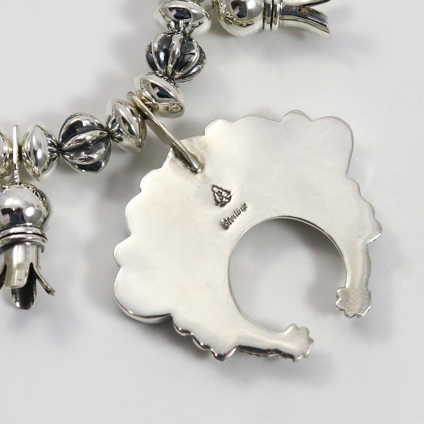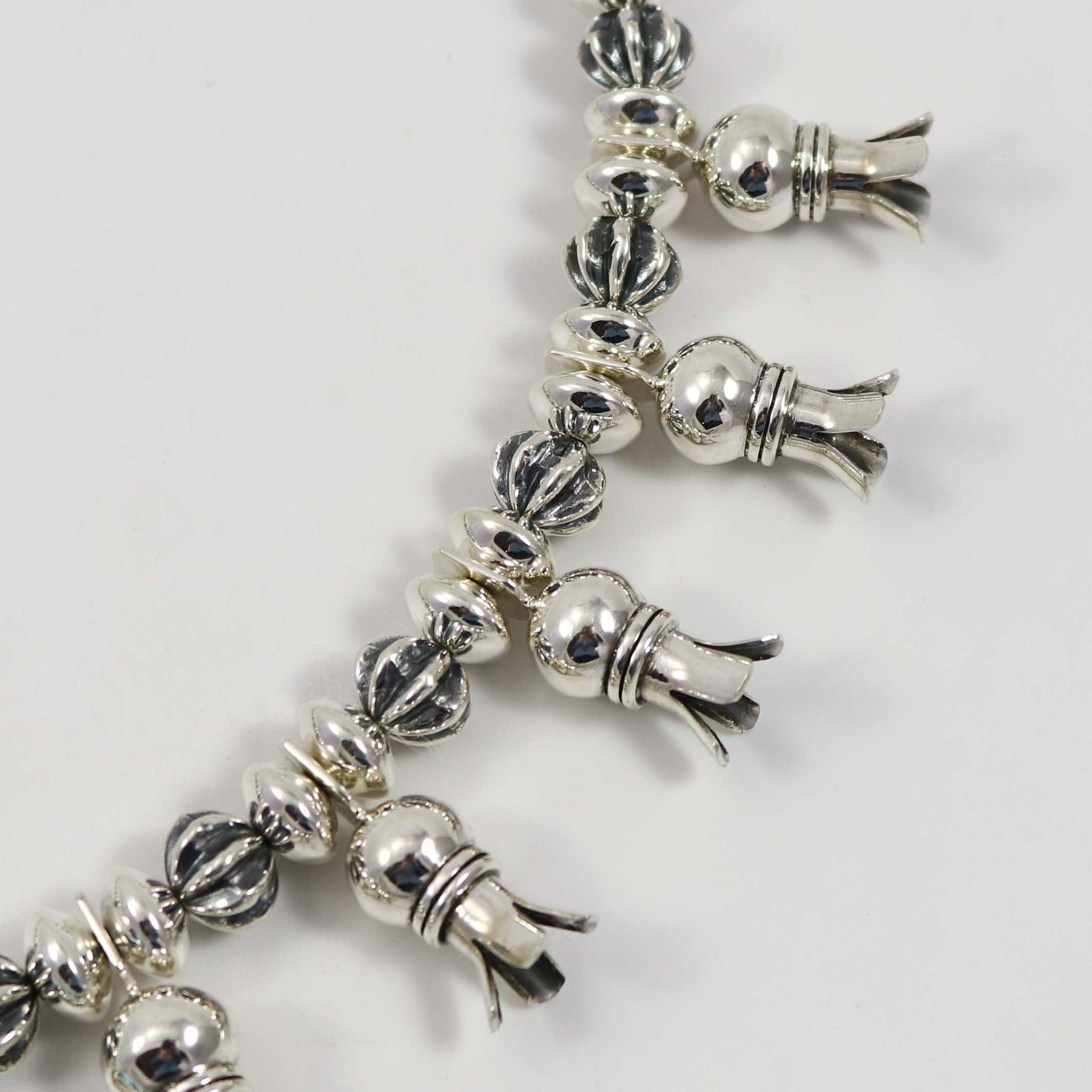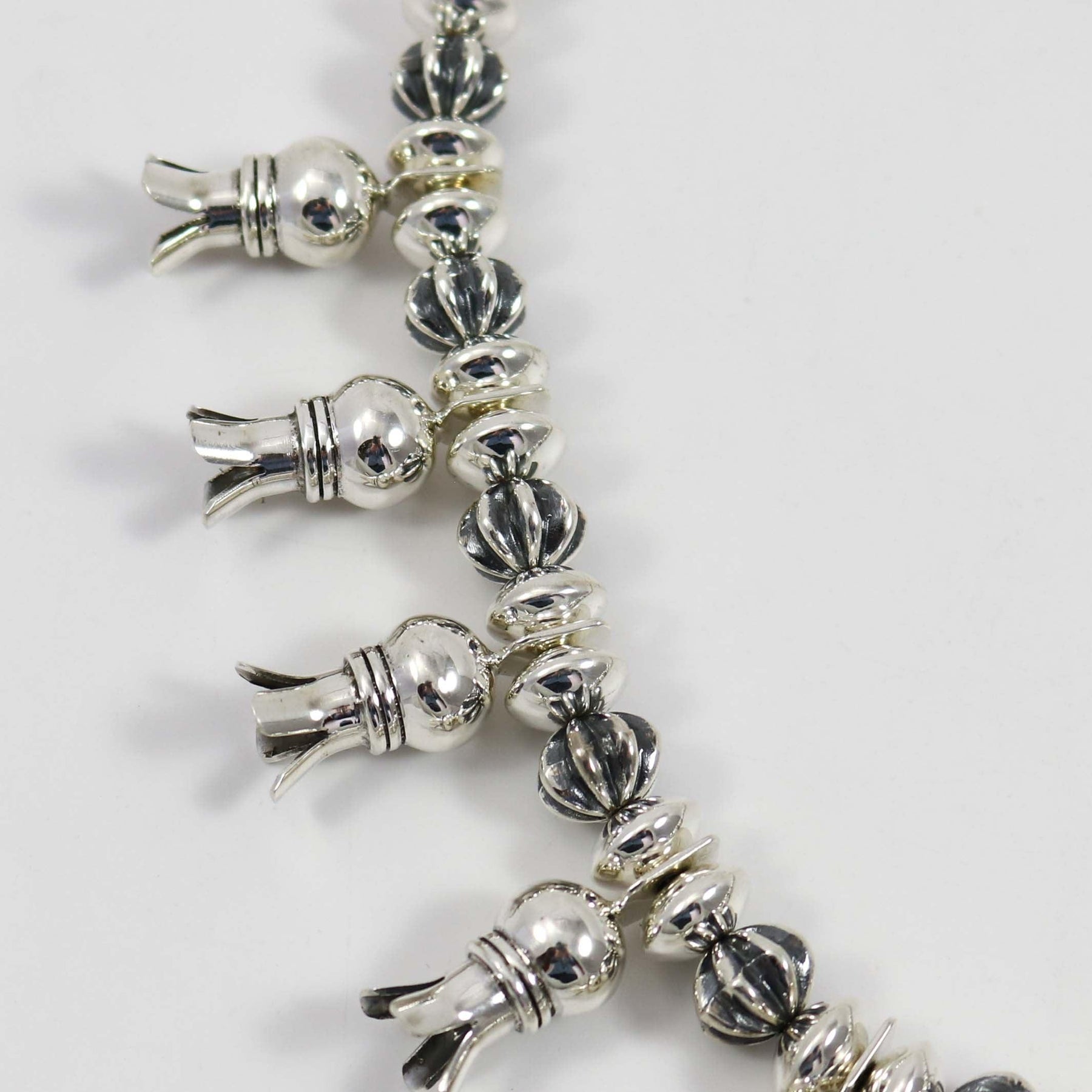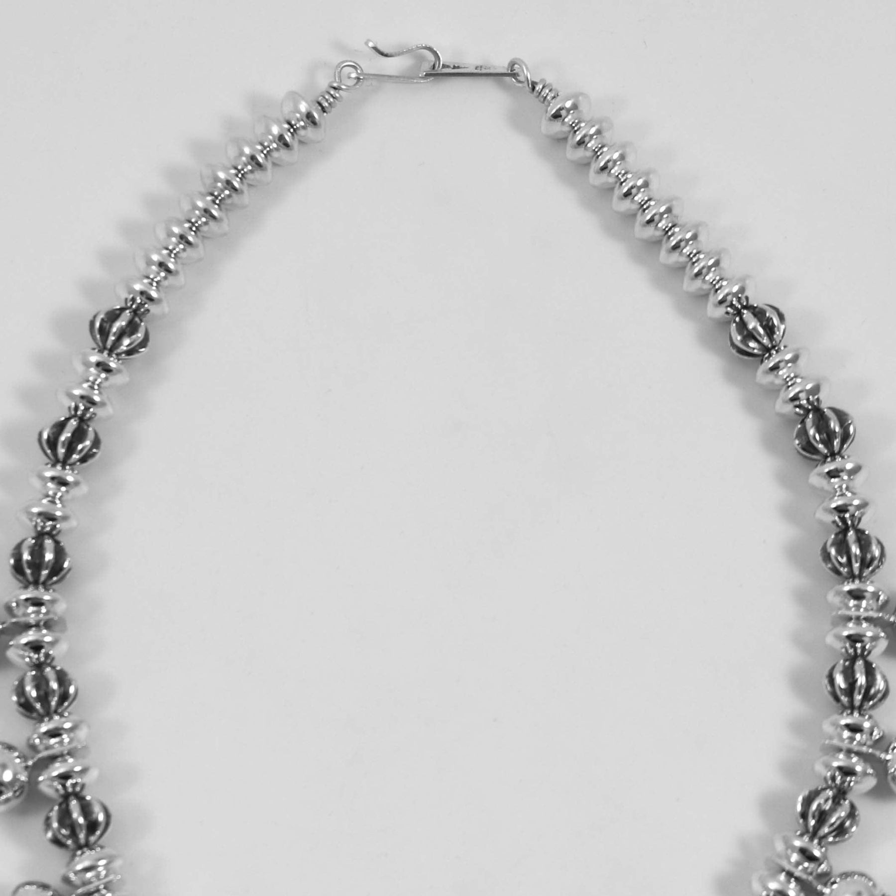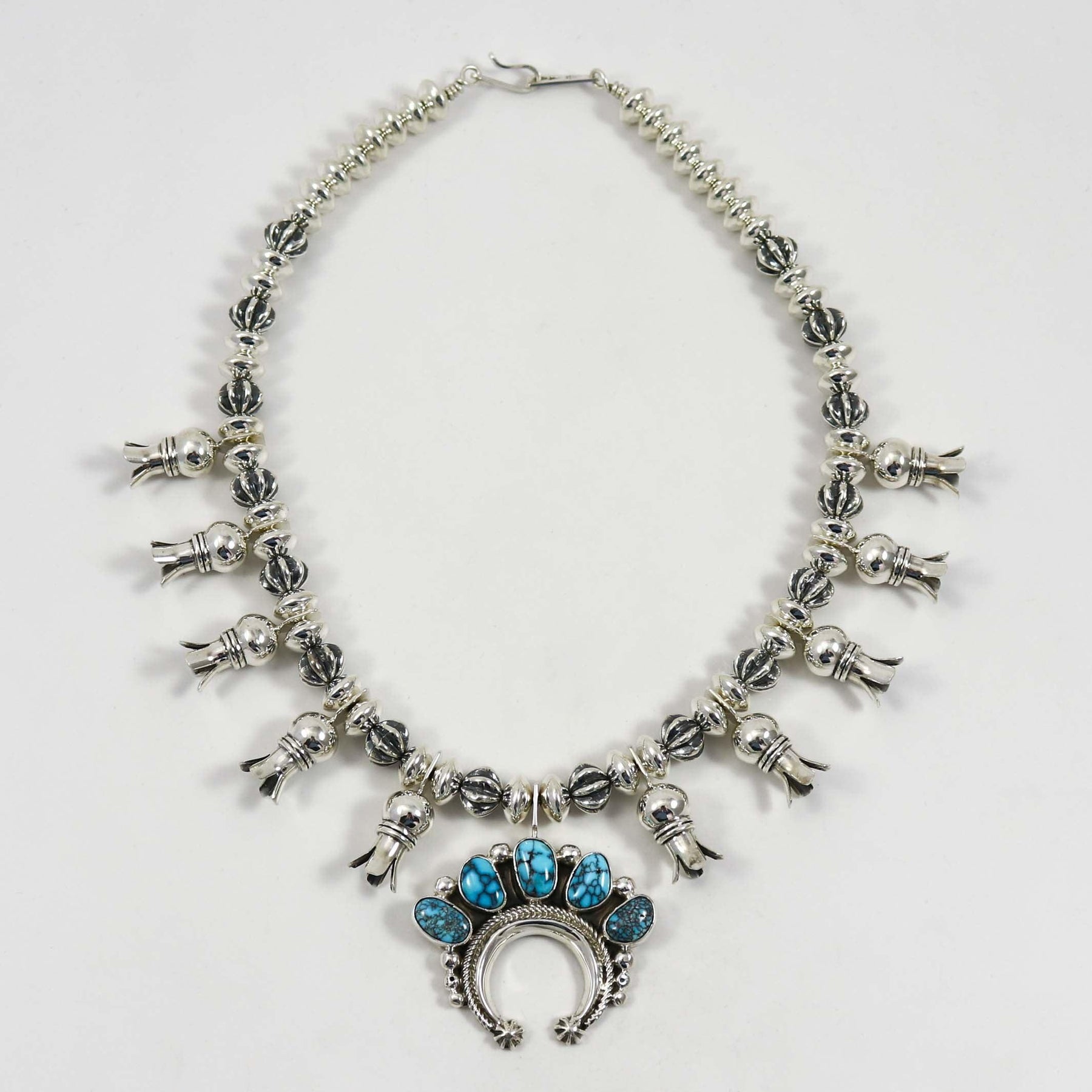 Sterling Silver Squash Blossom Necklace with Alternating Smooth and Fluted Handmade Beads and Featuring a Naja set with Natural Number Egyptian Turquoise.
