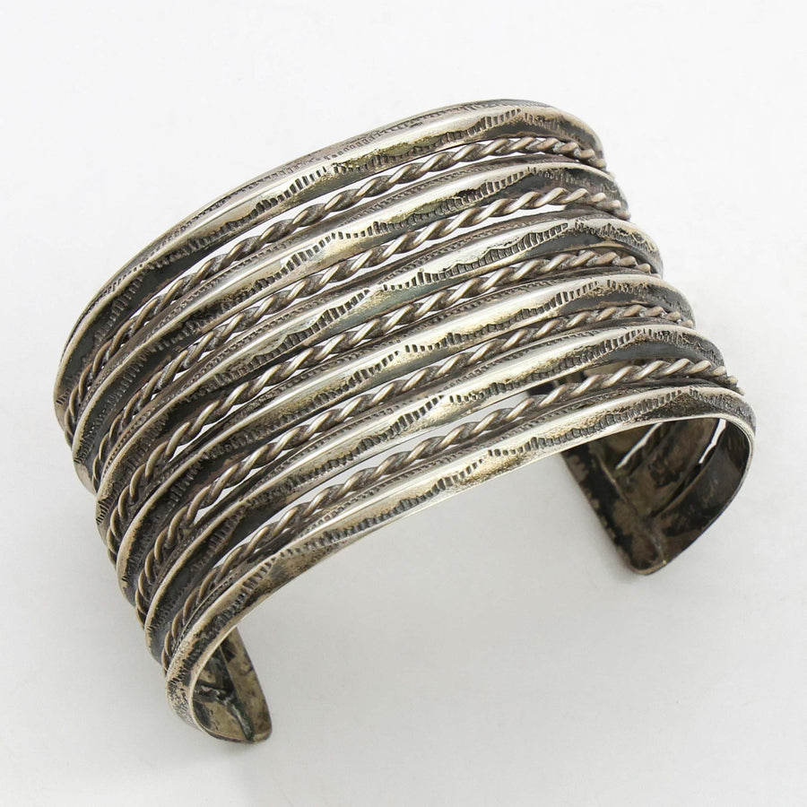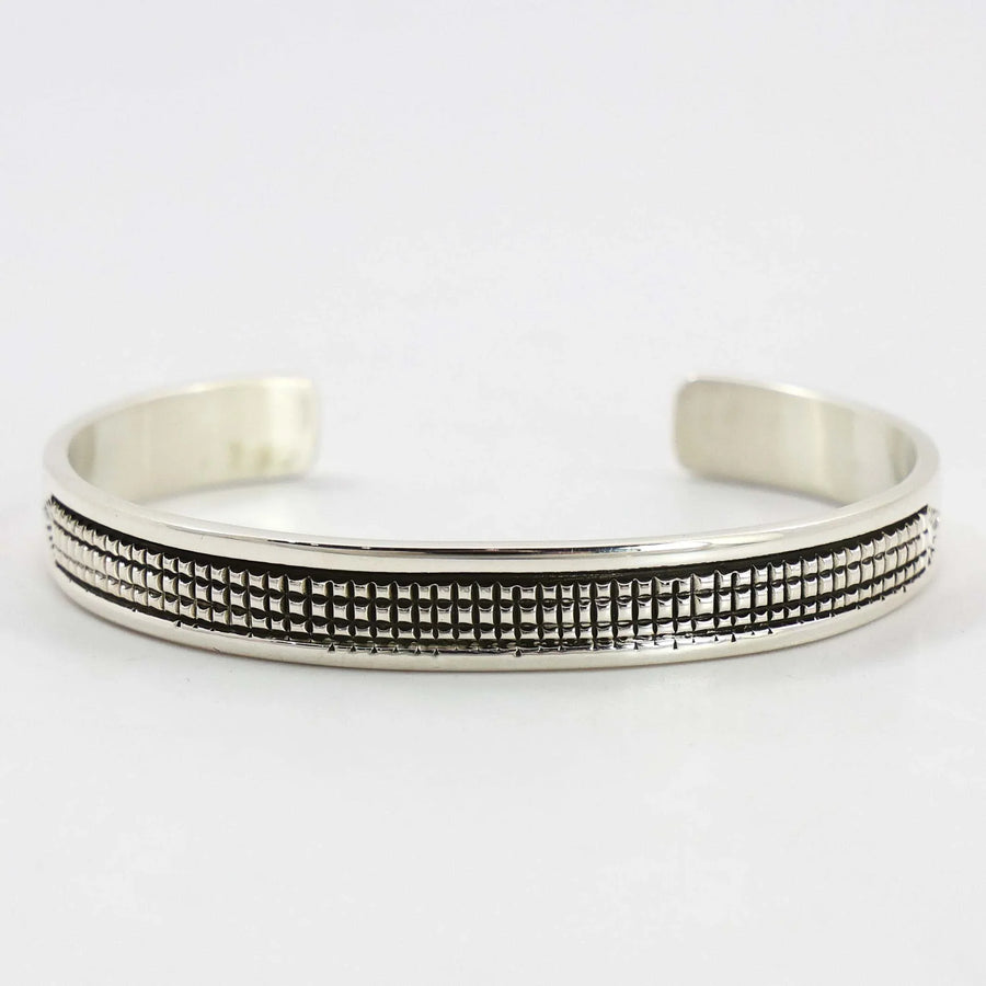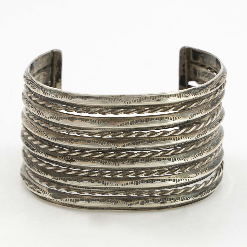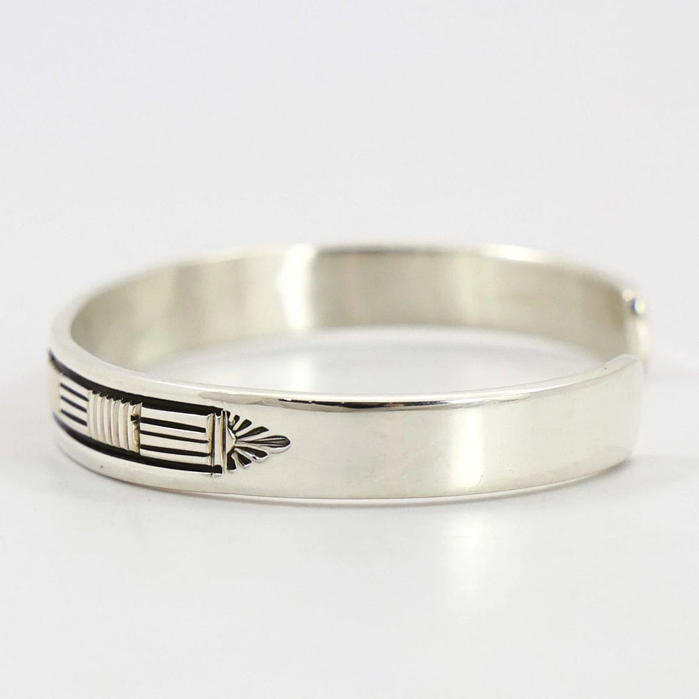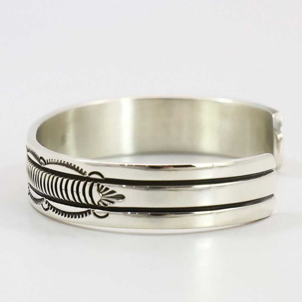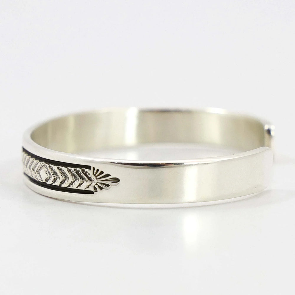To create stamped silverwork, a sheet of silver is cut into the desired shape and placed on a steel bench block. The artist then lines up the stamp and makes the impression with a single strike of a hammer. Most stamps are small and it can take many hammer strikes to complete a finished design. Once the stamp work is completed the piece may be oxidized with the protruding silver polished. This creates a more dramatic contrast within the stamped designs. The piece is then heated up and carefully molded into its final shape as a beautiful piece of stamped silver jewelry.