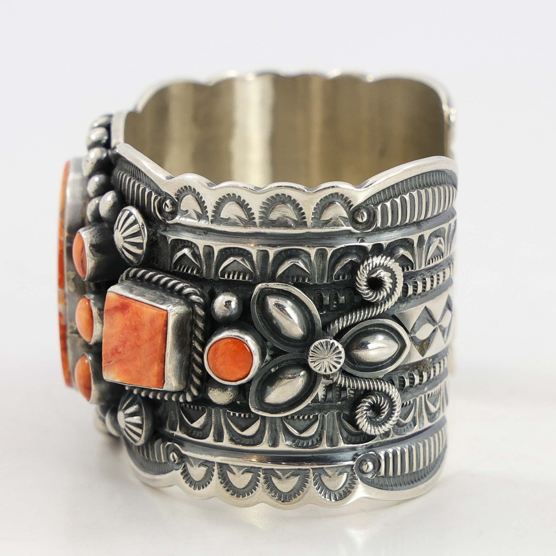 Sterling Silver Cuff Bracelet with Hand-Stamped Designs and set with Orange Spiny Oyster Shell.