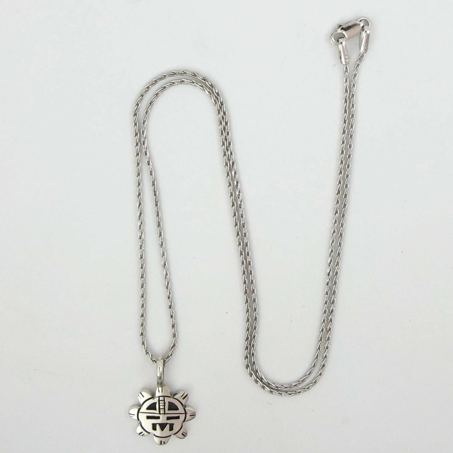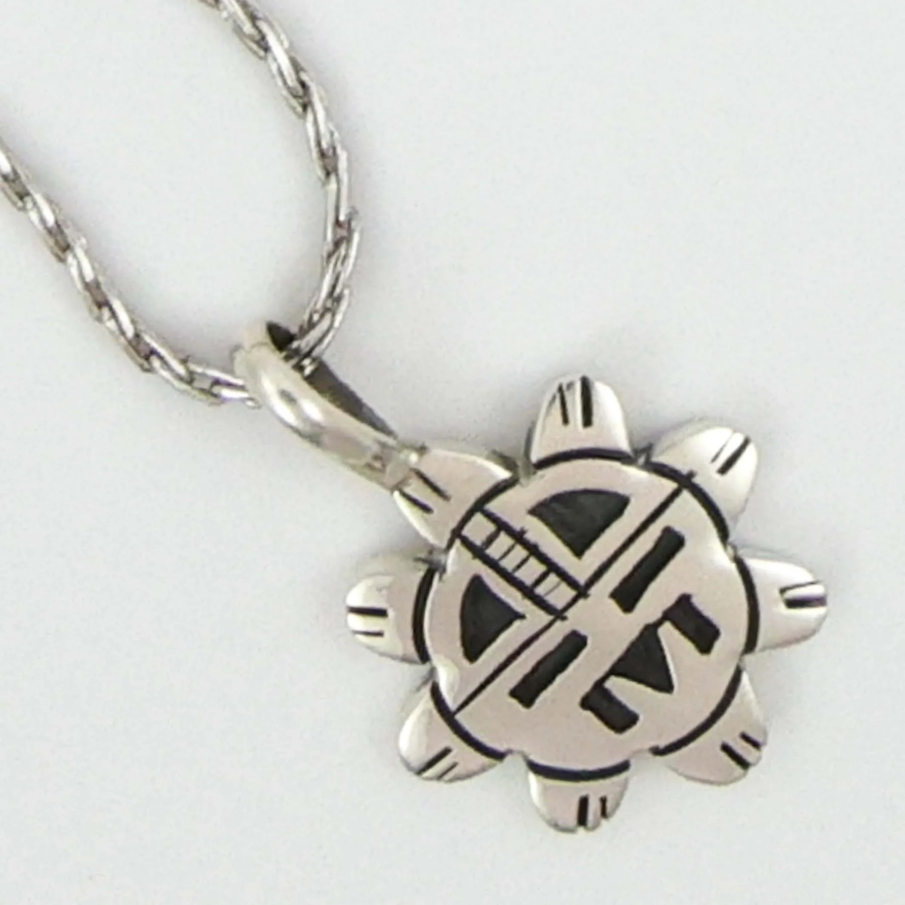 Sterling Silver Pendant with a Hopi Overlay Tawa Sunface Design by Marcus Lomayestewa. This pendant comes on a 20“ sterling silver chain.
