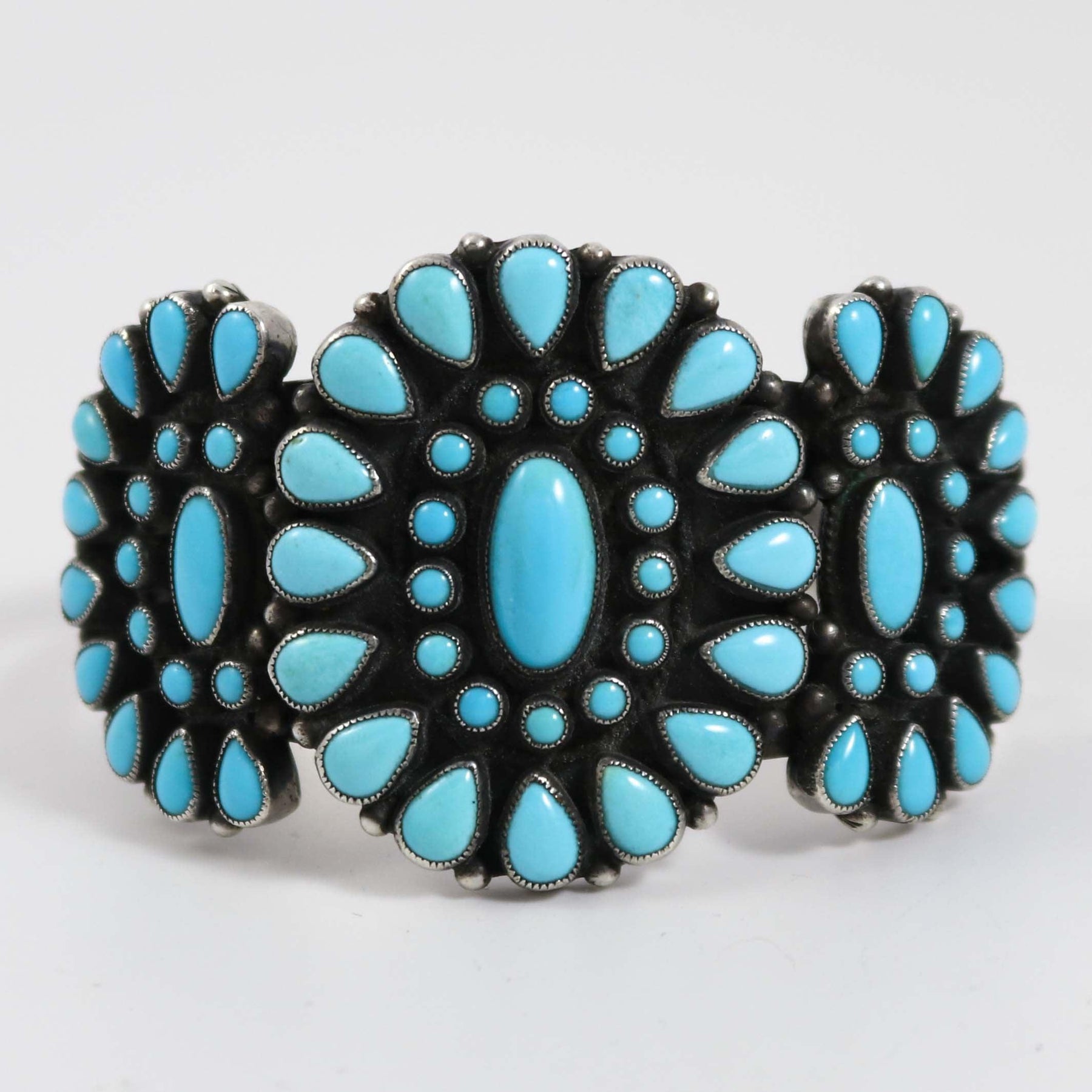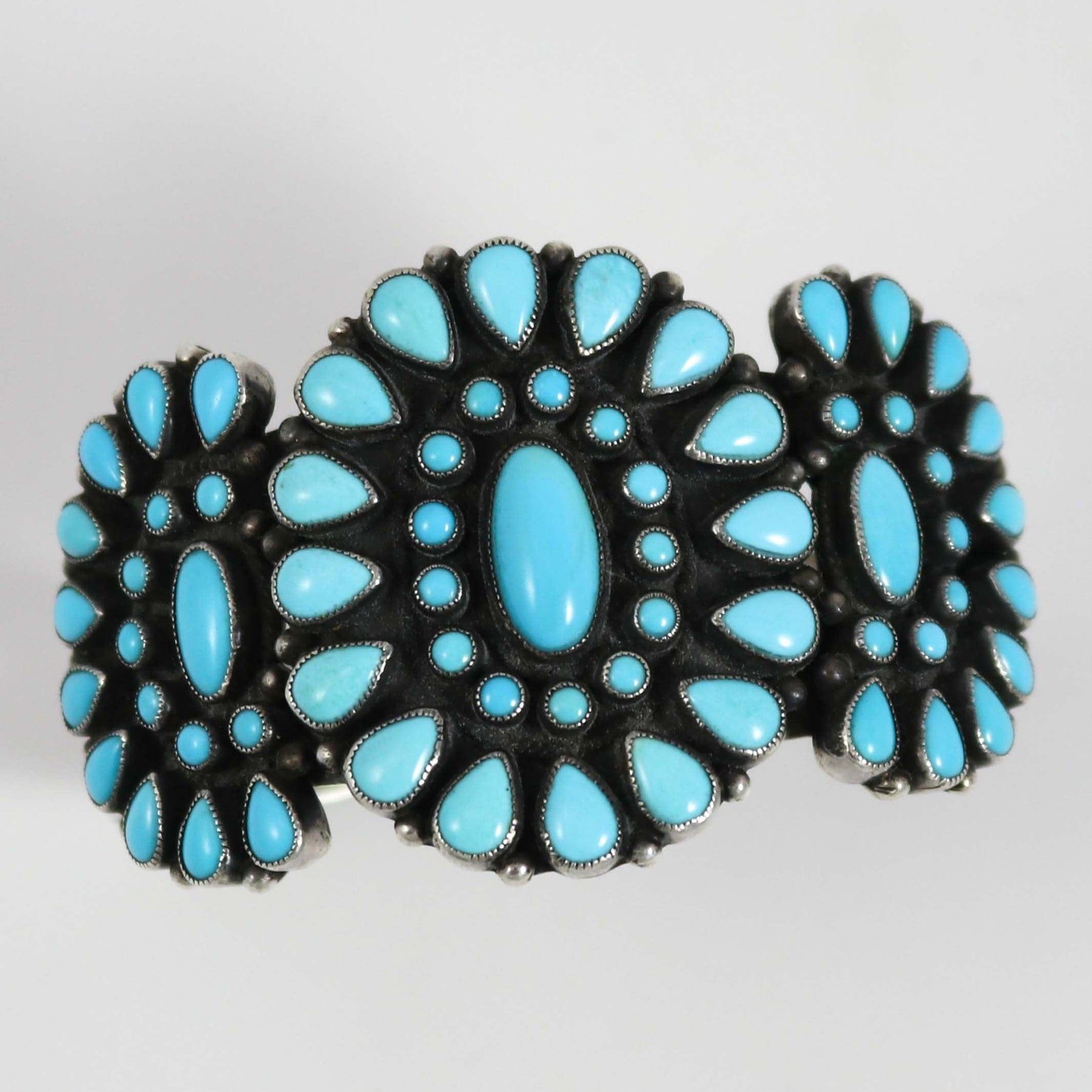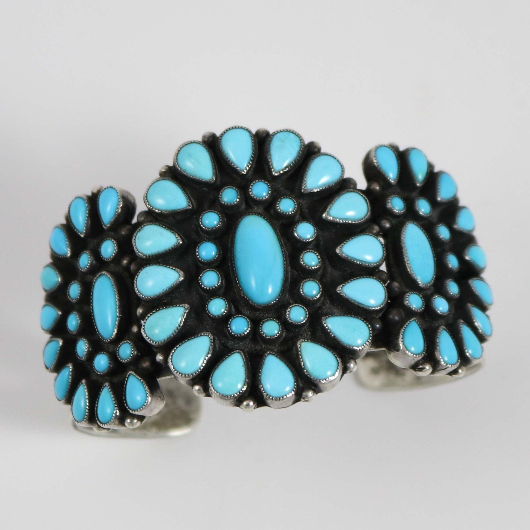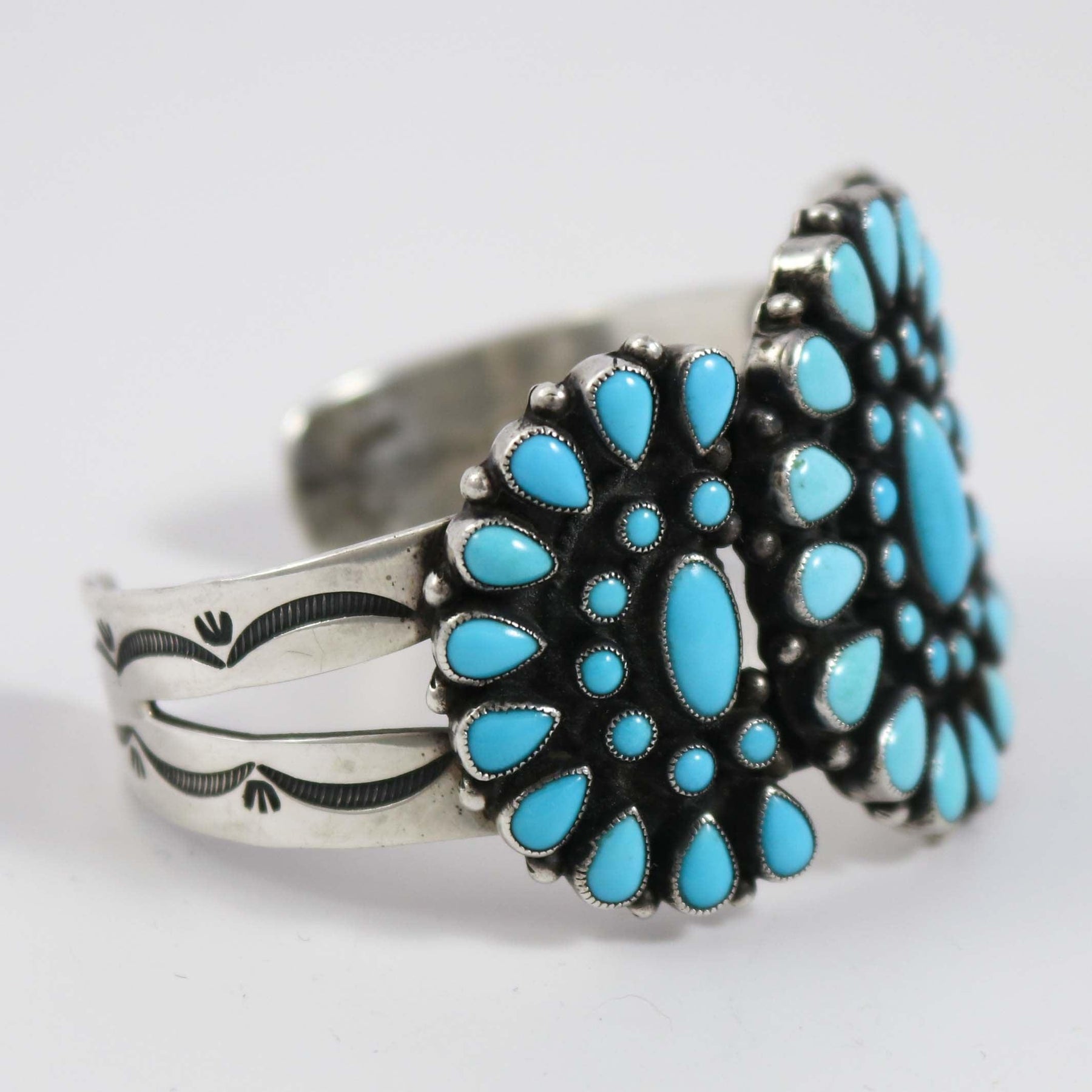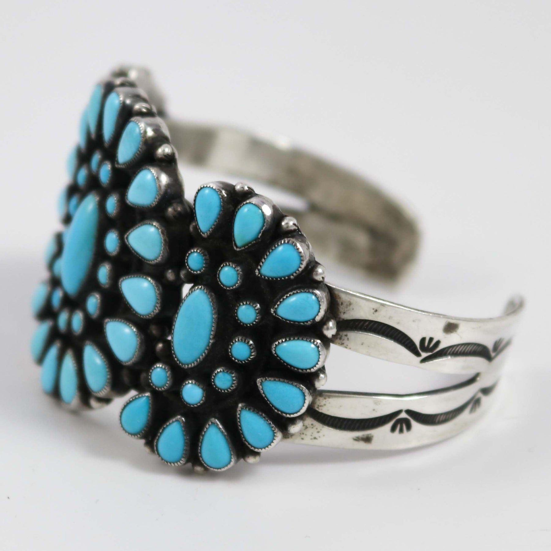Sterling Silver Cuff Bracelet set with Clusters of Natural Sleeping Beauty Turquoise from Arizona. This bracelet was made in the 2010s and was previously owned, it is in good condition.