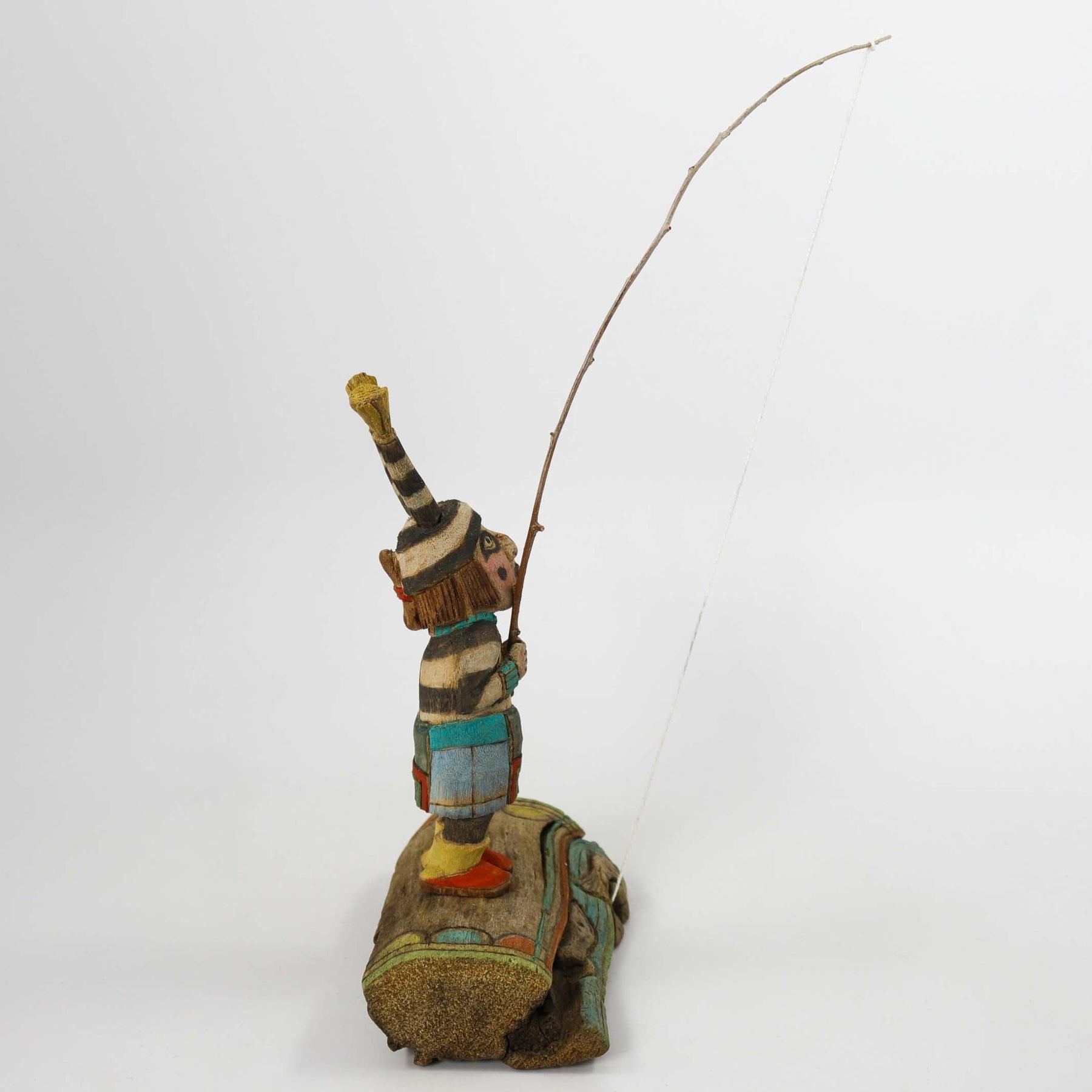 Hand Carved and Hand Painted Hopi Clown Fishing in a Stream with Water and Fish Carved into the Base.