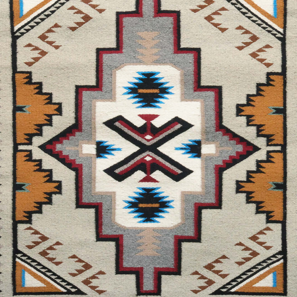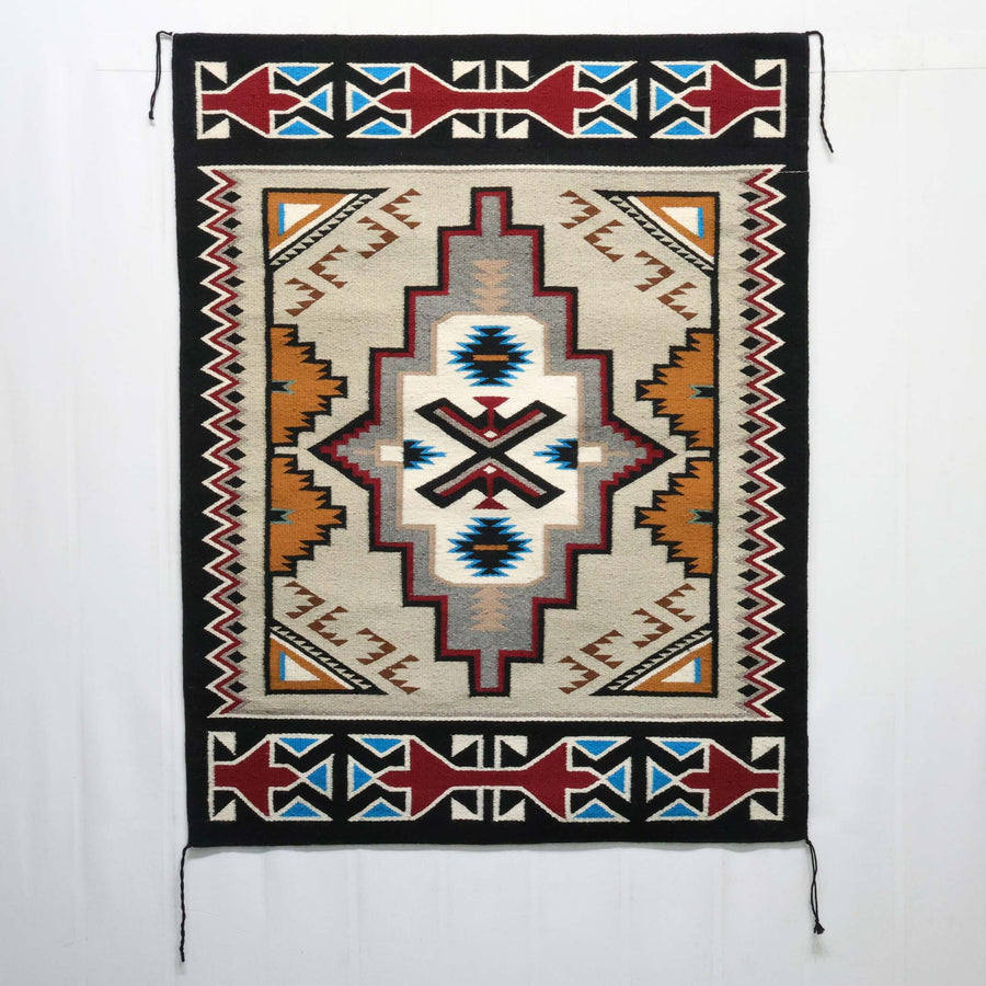 The Teec Nos Pos rug stands out as one of the most intricately detailed designs within Navajo weaving traditions. Its hallmark features include vibrant colors, eccentric designs, sharp contrasting outlines, and multiple bold borders. It often has a distinctive broad border (often an "X" or "H" shape) and an elaborate center with smaller complementary design elements. In addition to geometric patterns, Teec Nos Pos weavings may also incorporate eagle feathers, which are believed to carry prayers from earth to heaven in Navajo tradition.