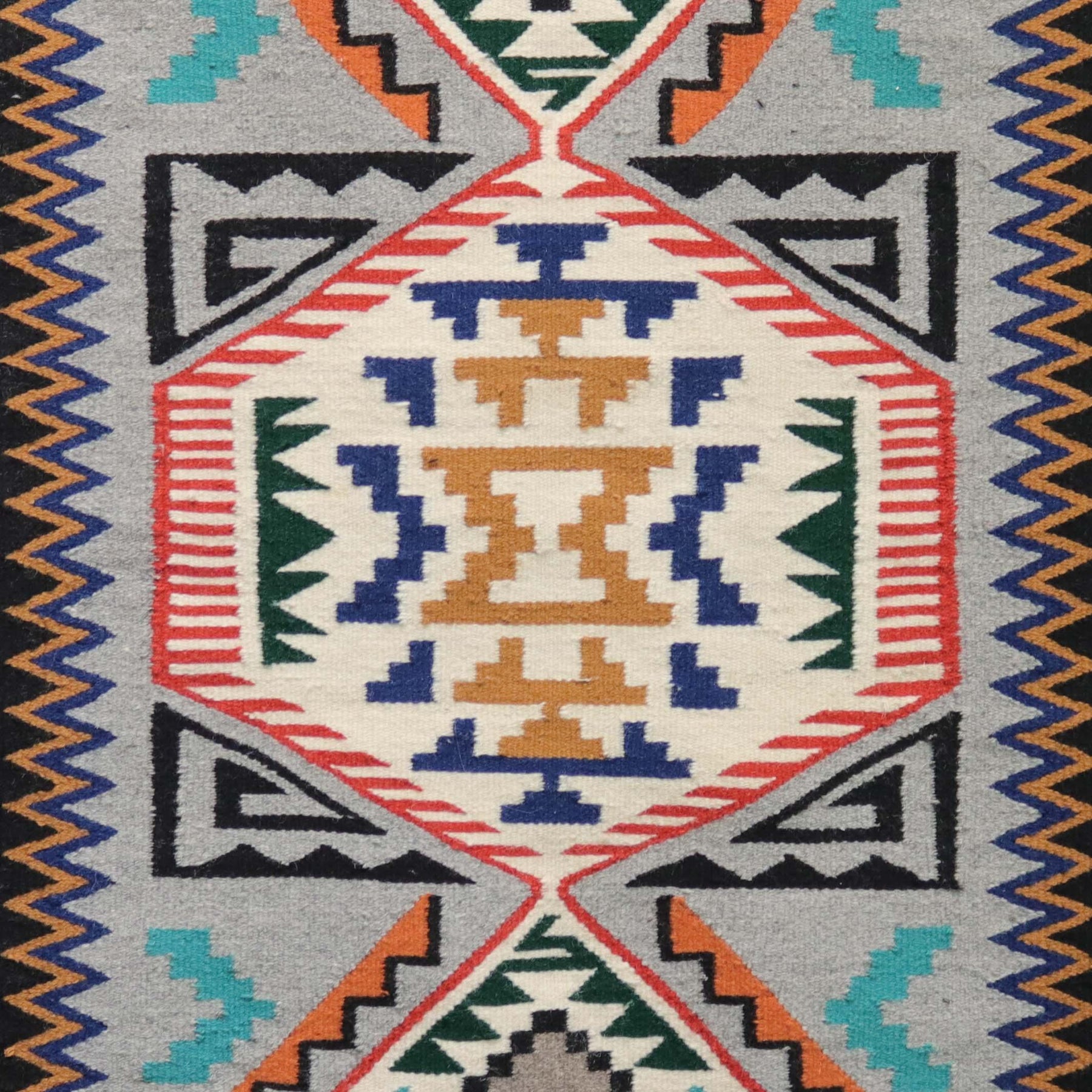 Navajo Weaving in the Teec Nos Pos Regional Style with Blue Border and Bright Aniline Dye Accents.