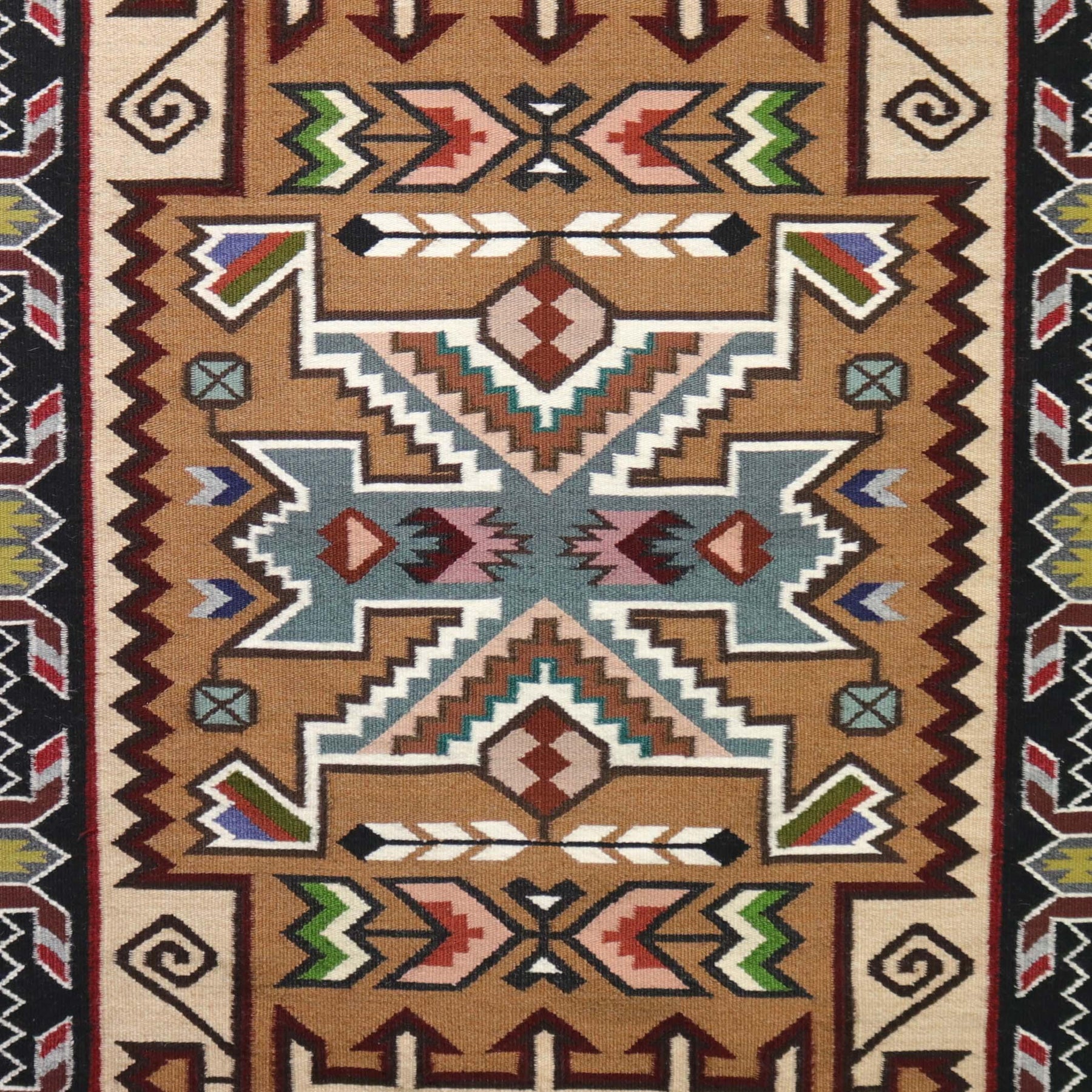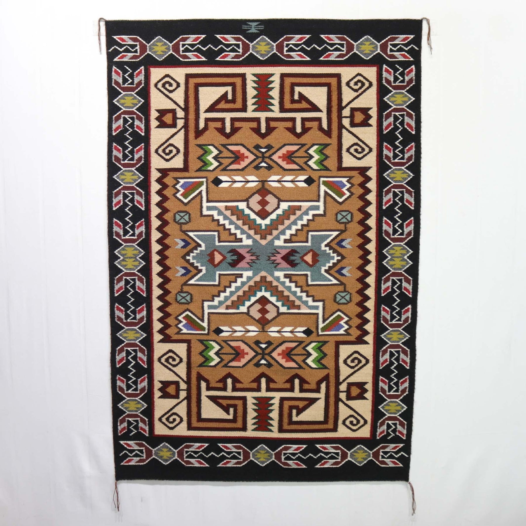 Navajo Weaving in the Teec Nos Pos Regional Style featuring Burntwater Color Schemes.