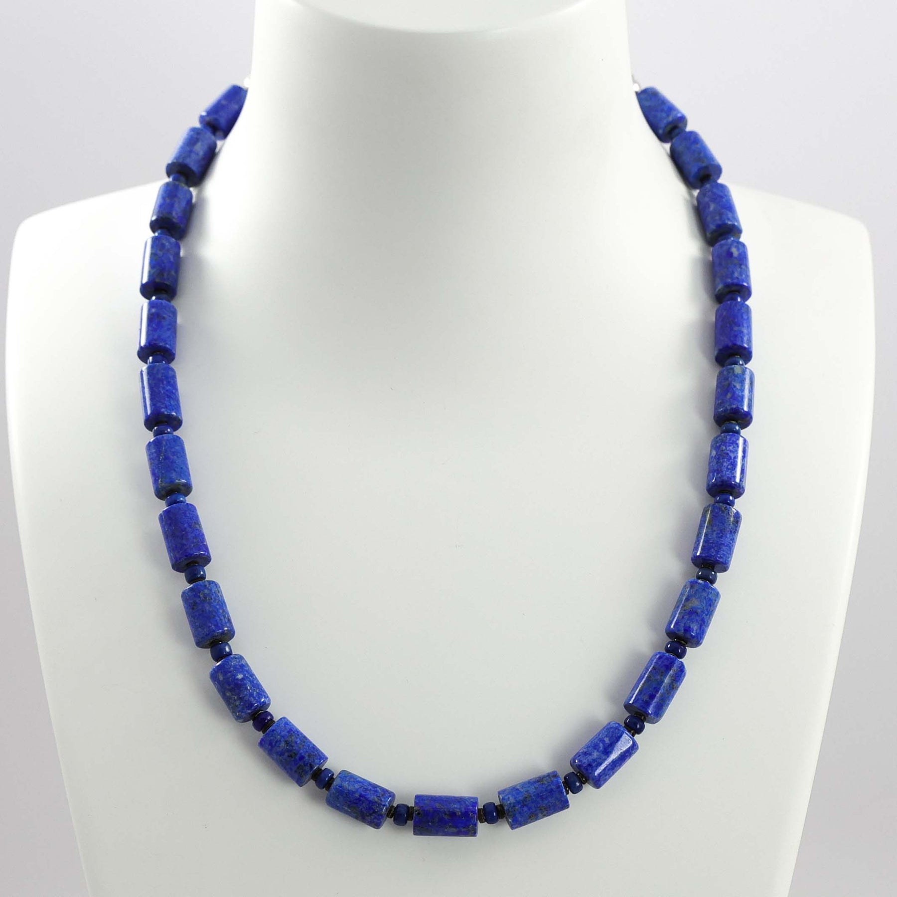 Single Strand Bead Necklace with Denim Lapis and Pen Shell Beads. This necklace features sterling silver cones and clasp.