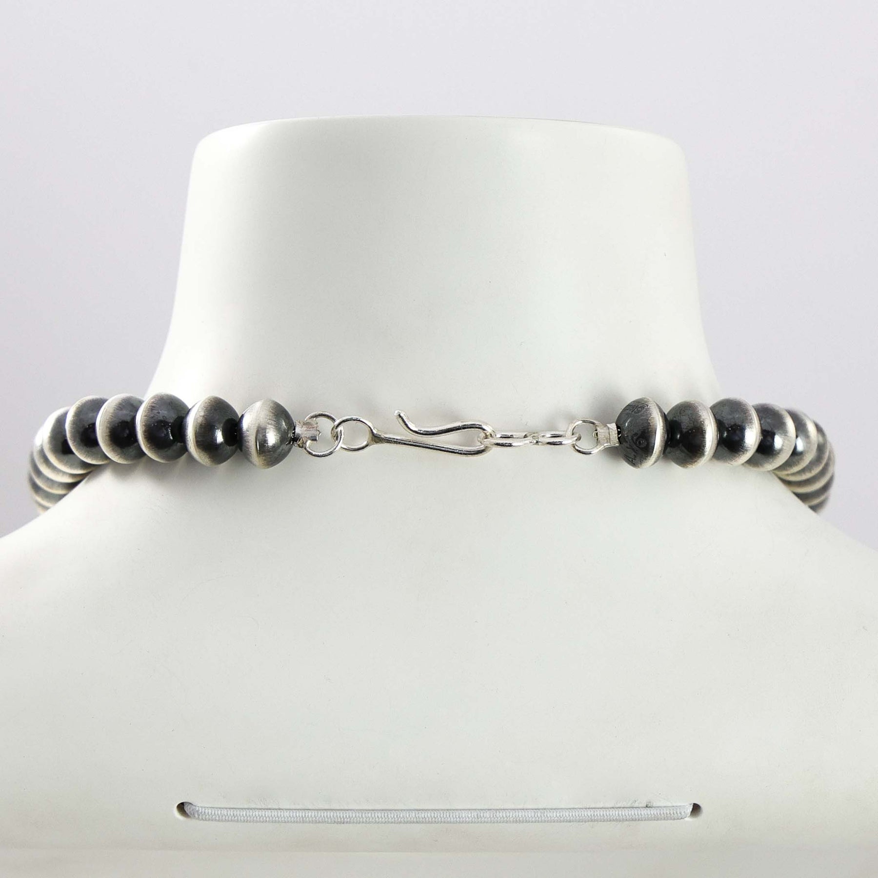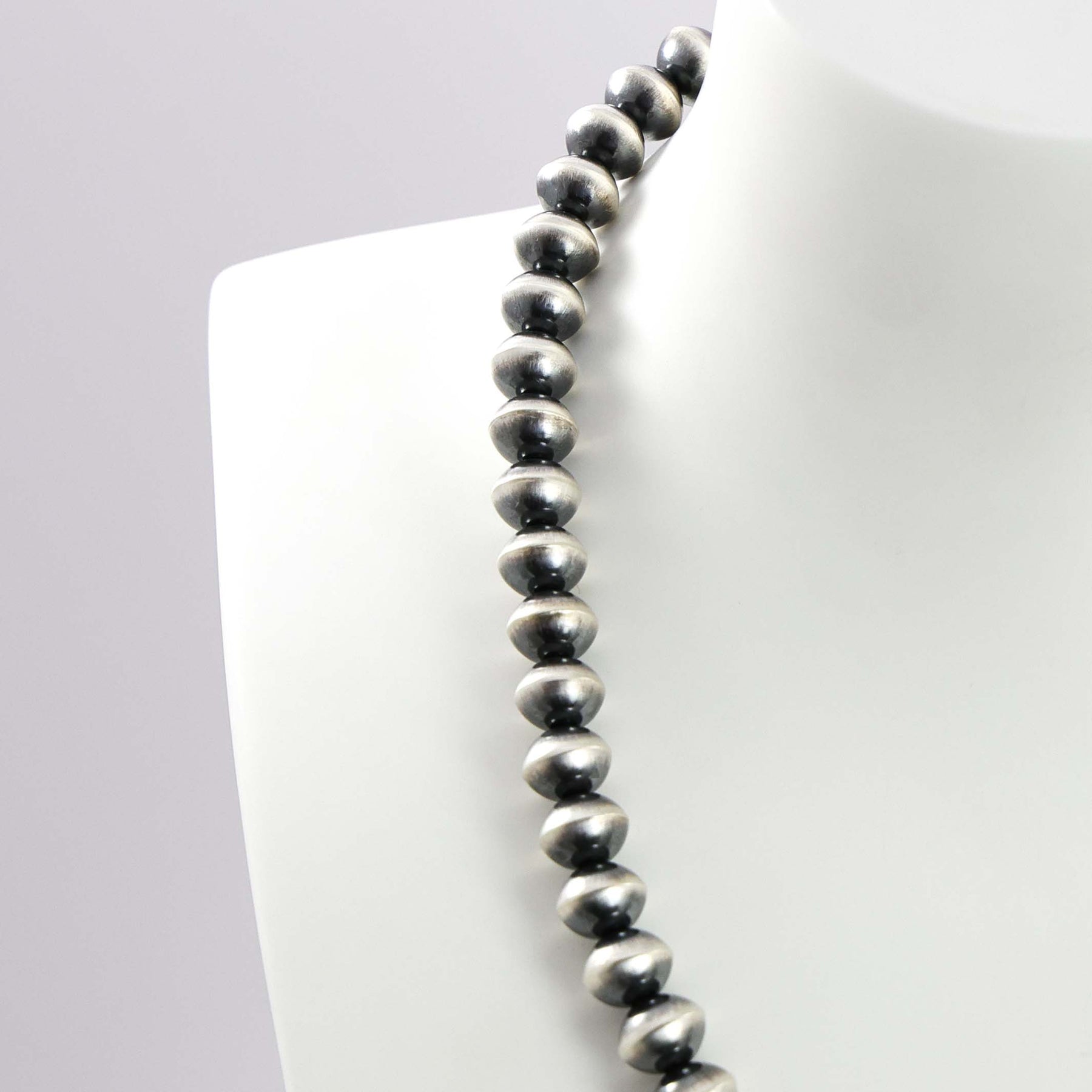Sterling Silver Navajo Pearl Necklace with Handmade Beads in an Oxidized Finish.