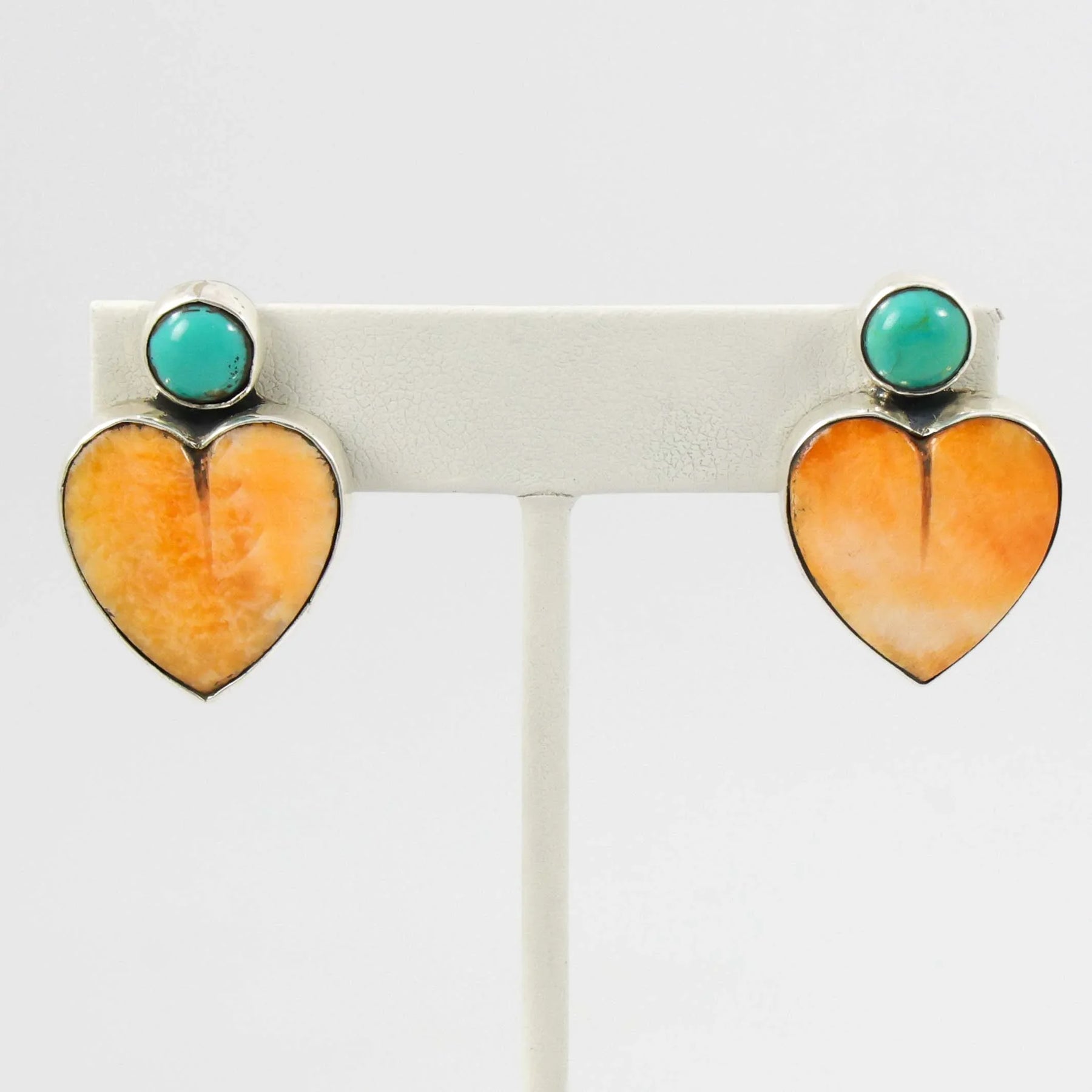Sterling Silver Clip Heart Earrings set with Spiny Oyster Shell and Turquoise.