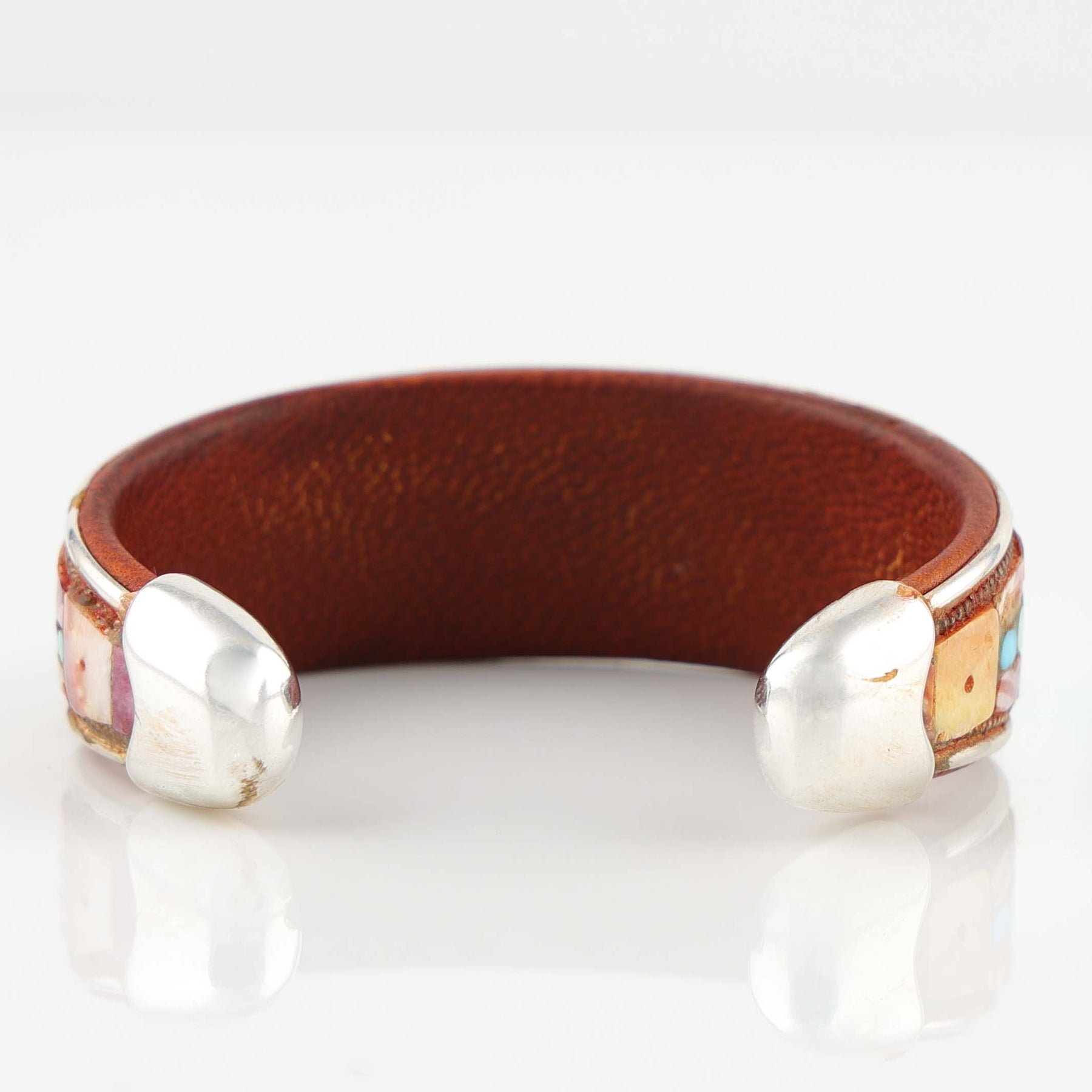 Sterling Silver, Copper, and Goat Leather Cuff Bracelet with Mosaic Inlaid Turquoise and Spiny Oyster Shell.
