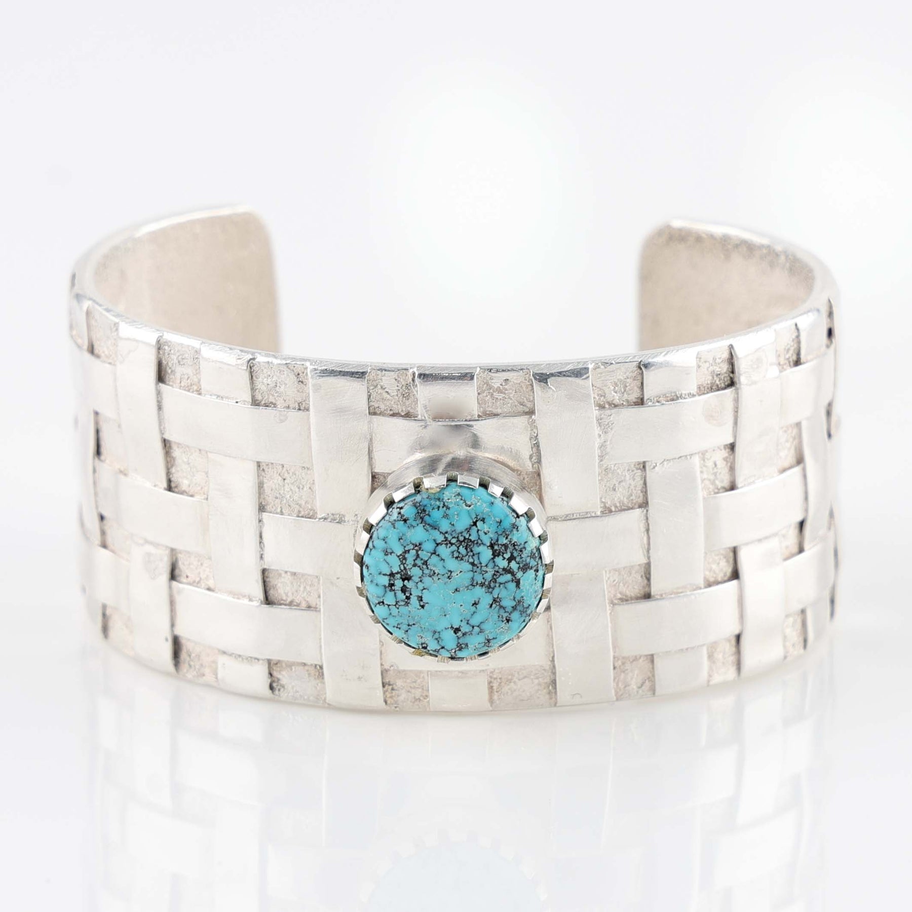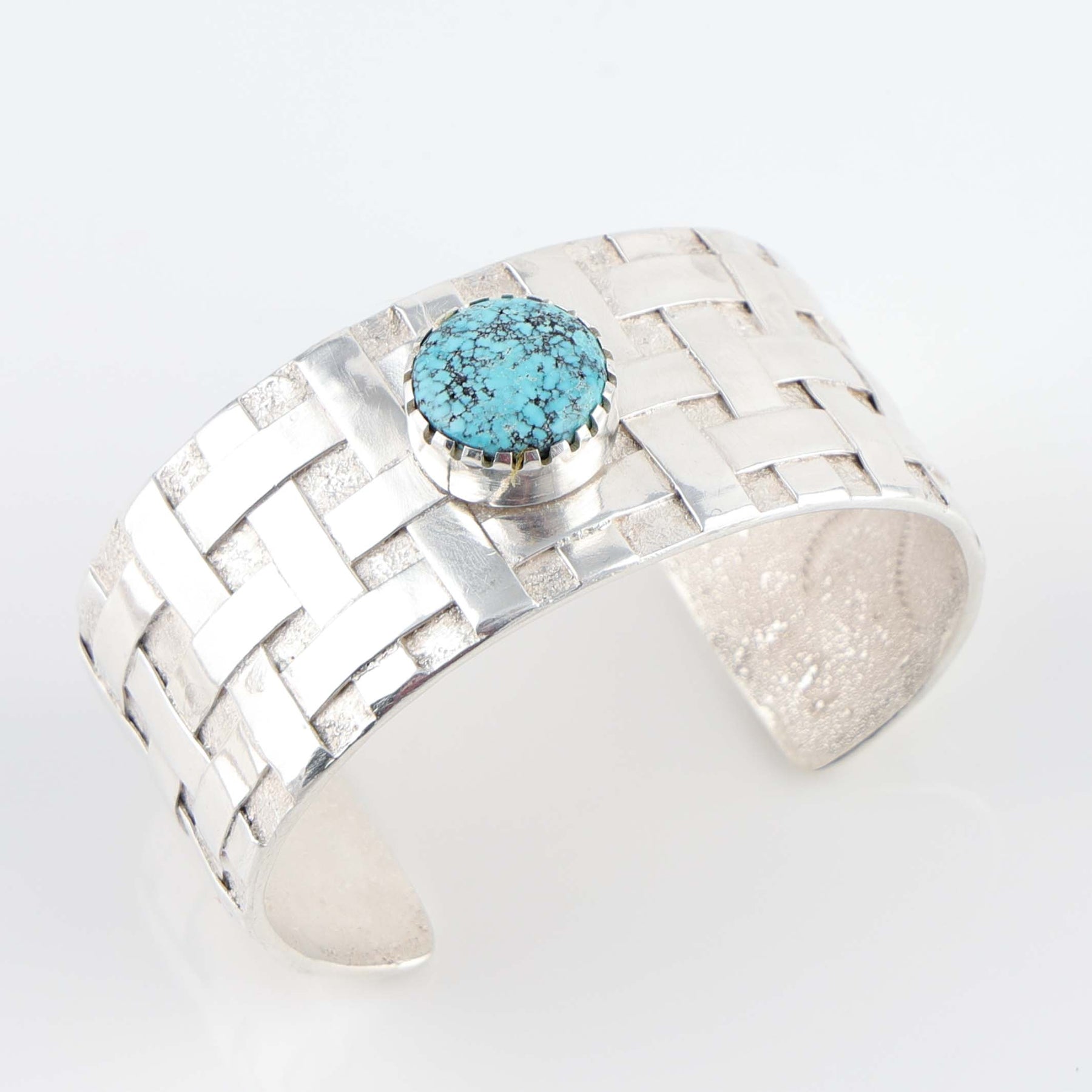 Tufa Cast Sterling Silver Cuff Bracelet with a Basket Weave Design and set with Natural Kingman Turquoise from Arizona.