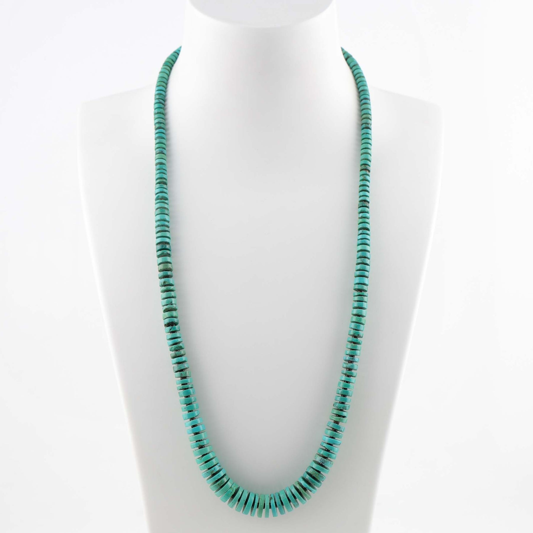 Single Strand Necklace with Graduated Stabilized Kingman Turquoise Beads and Pen Shell Heishi Beads.