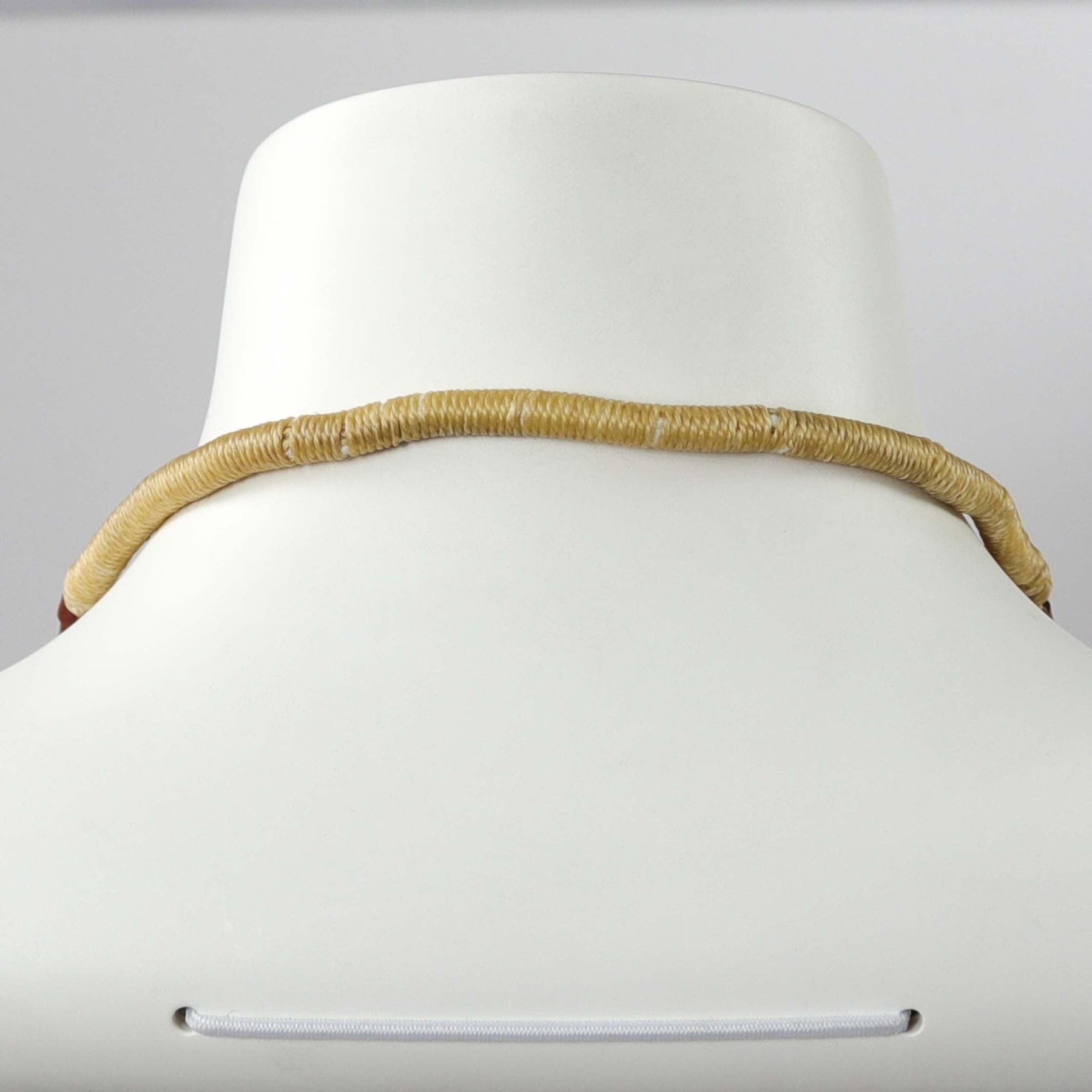 Three Strand Bead Necklace with Hand-Rolled Pipestone and Kingman Turquoise from Arizona. This necklace features a traditional wrapped backing and was made by Delia Abeyta (11 years old).