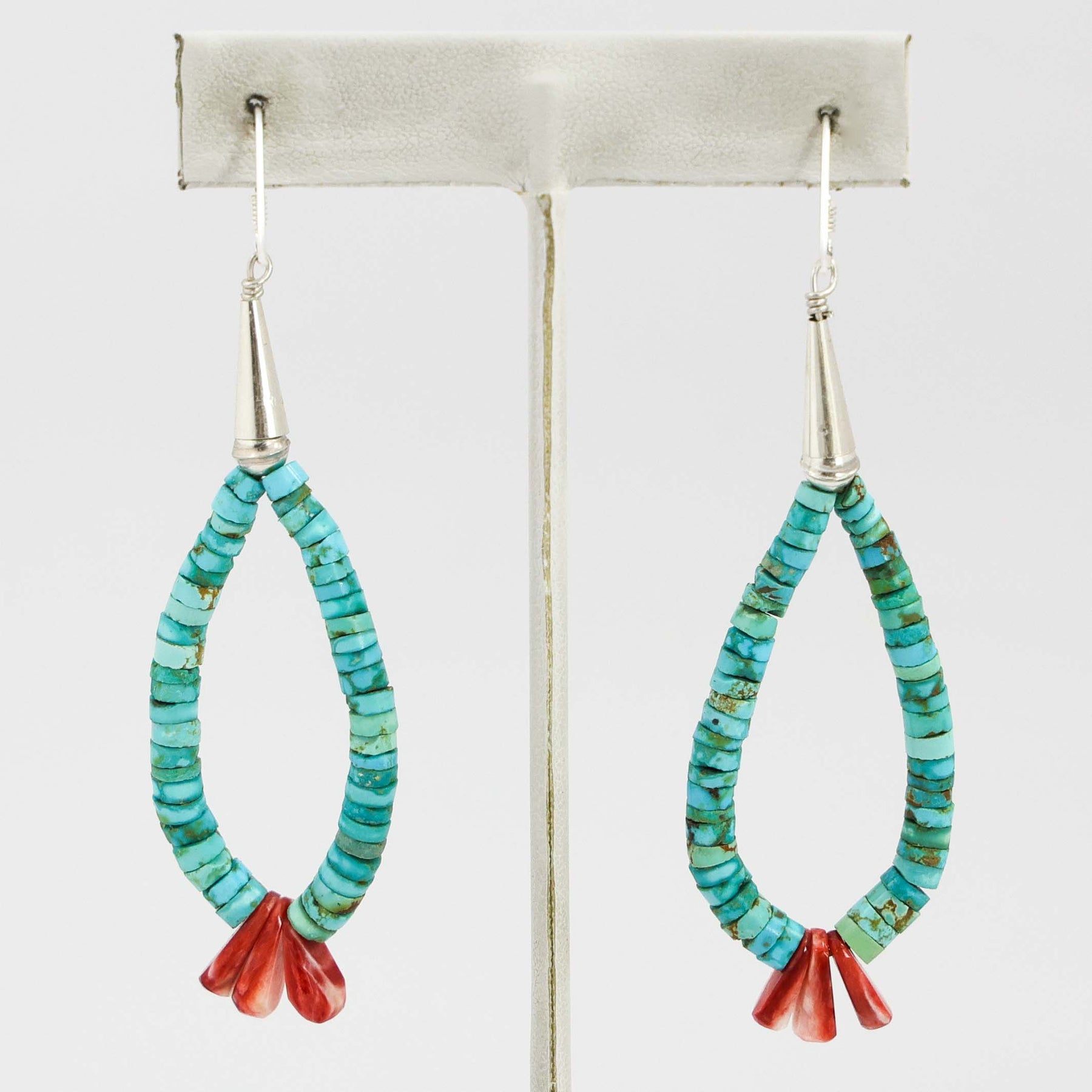 Sterling Silver French Hook Jacla Earrings with Hand-Rolled Natural Sleeping Beauty Turquoise Heishi Beads and Spiny Oyster Shell Tabs.