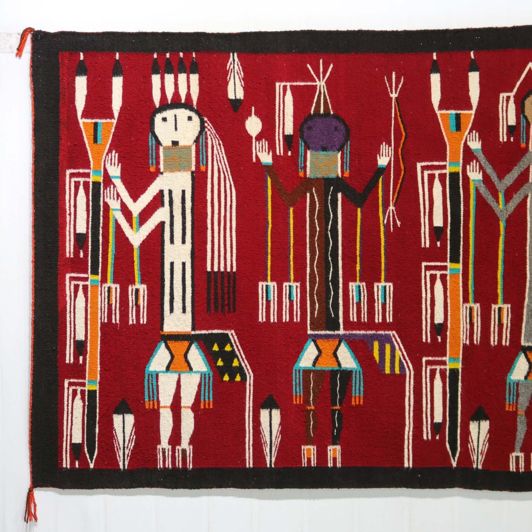 1940s Yei Weaving Depicting Three Yei Figures (Water Sprinkler, Fringe Mouth, and Biighaaask’idii) on a Red Background with Hand-Carded and Spun Wool. This weaving has no issues and is in excellent overall condition.
