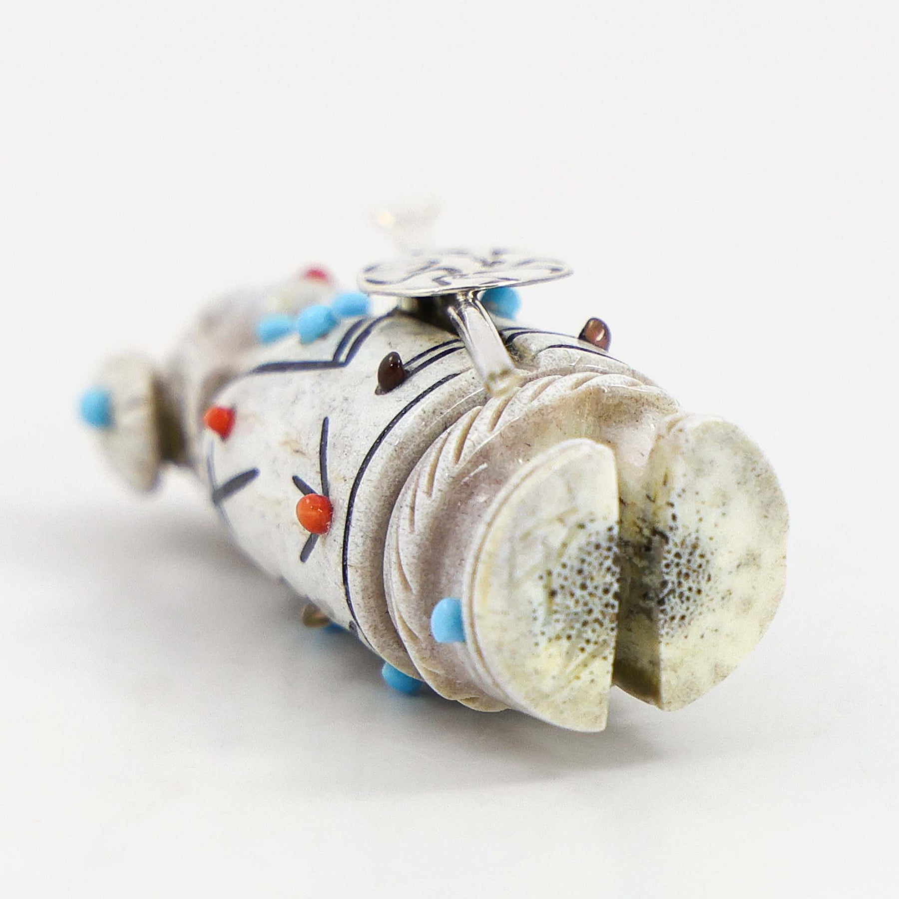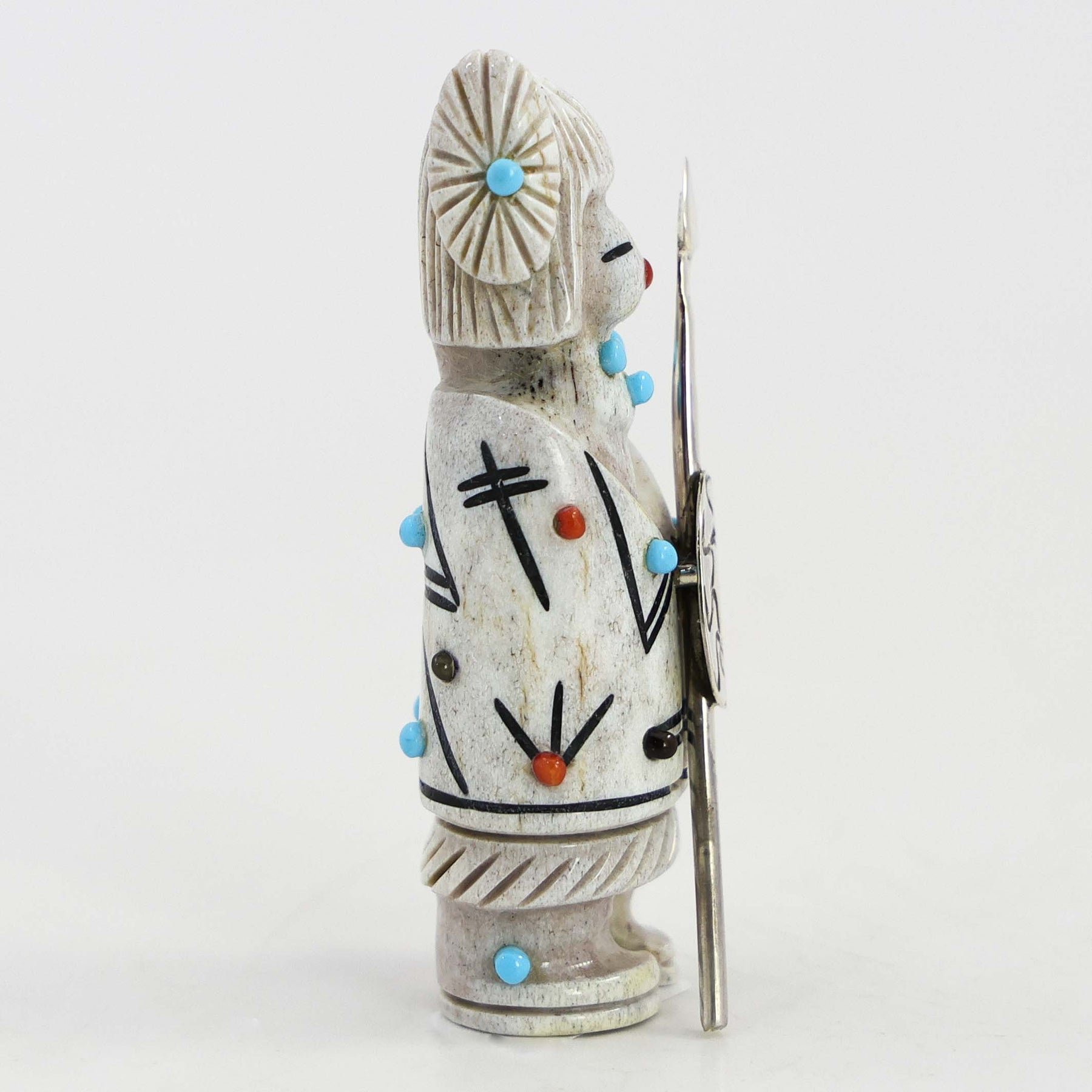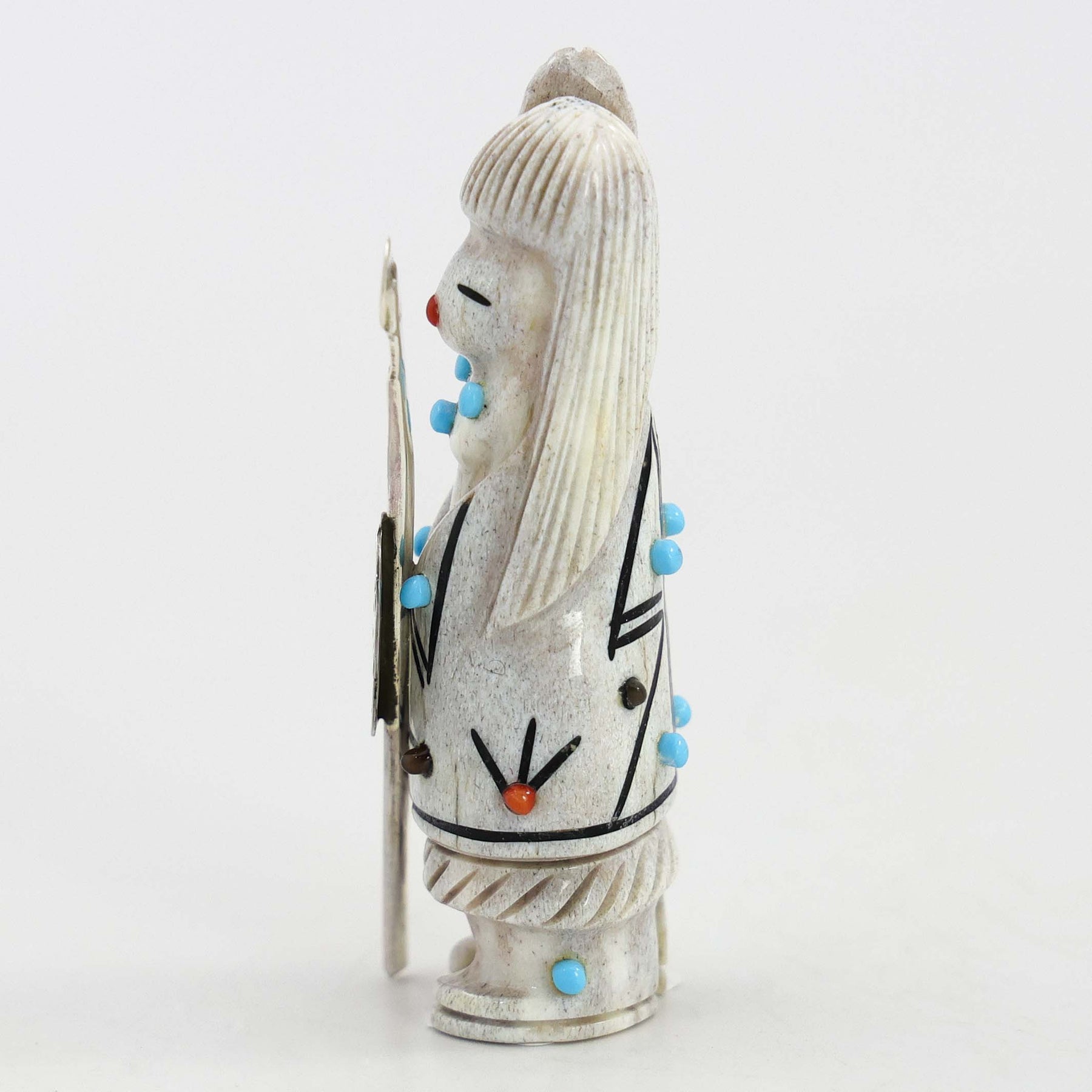 Hand-Carved Zuni Warrior Maiden Fetish made from Antler and featuring a Sterling Silver Shield and Spear. The Warrior Maiden also features turquoise and coral details.