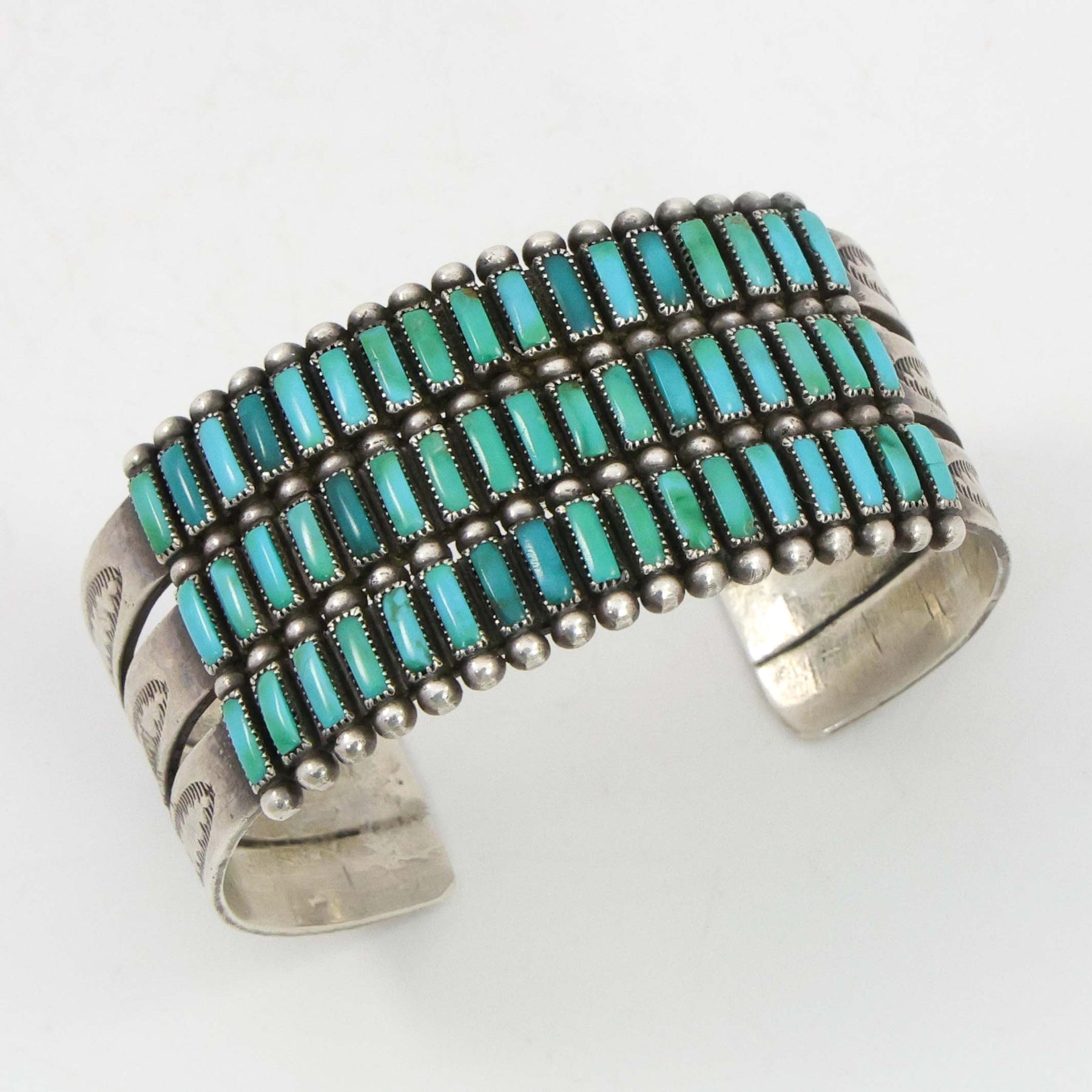 1940s Zuni Sterling Silver Cuff Bracelet set with Four Rows of Hand Cut Square Natural American Turquoise Stones.