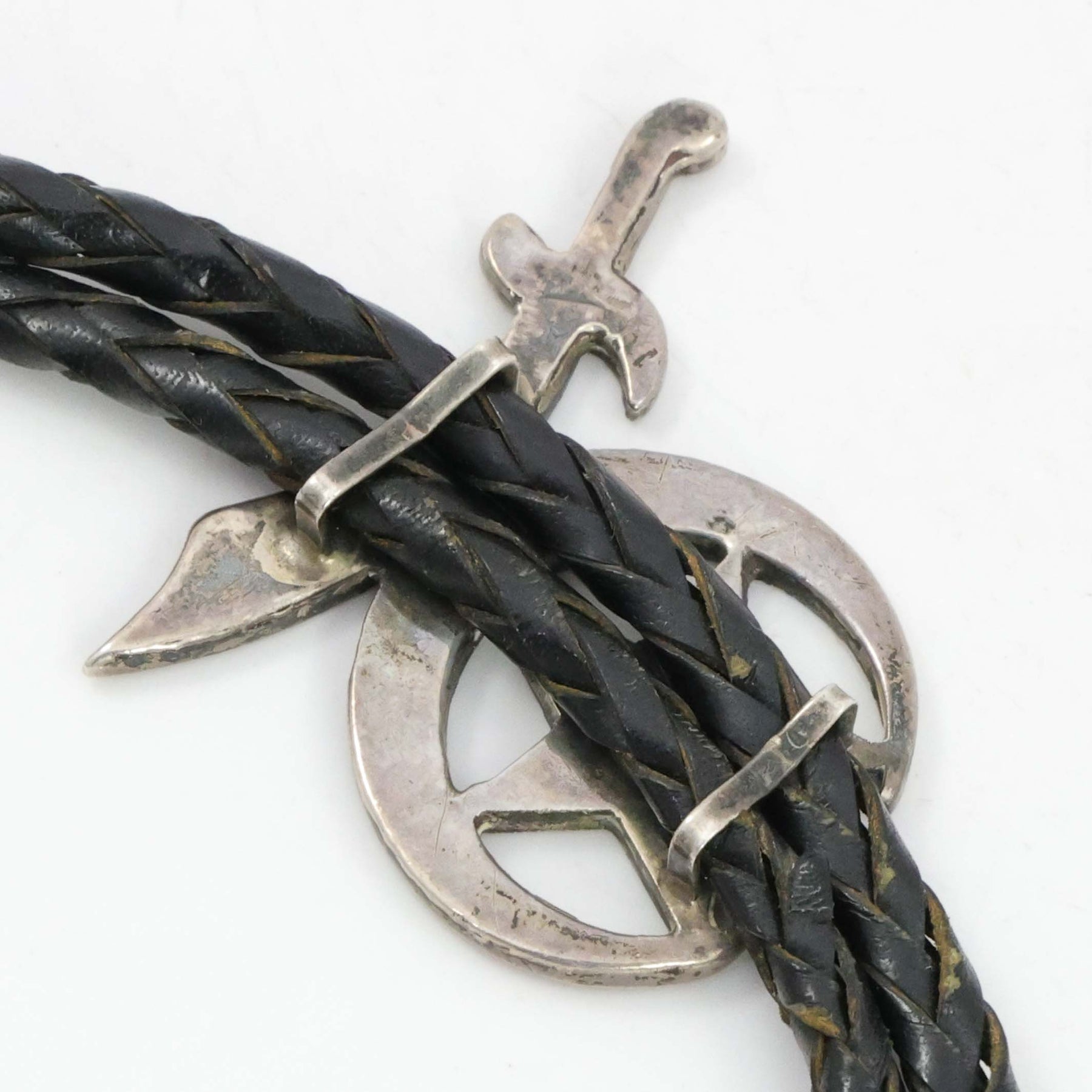 1960s Zuni bolo tie featuring the Shriner’s emblem with a scimitar and crescent motif, a philanthropic fraternity associated with Freemasonry. Handmade in sterling silver with finely executed channel inlay of natural American turquoise and Mediterranean coral. The bolo is fitted with a custom sterling silver slide backing and is paired with a 37" braided black leather cord tipped with stamped sterling silver tips. A distinctive example of mid-20th century Zuni craftsmanship.