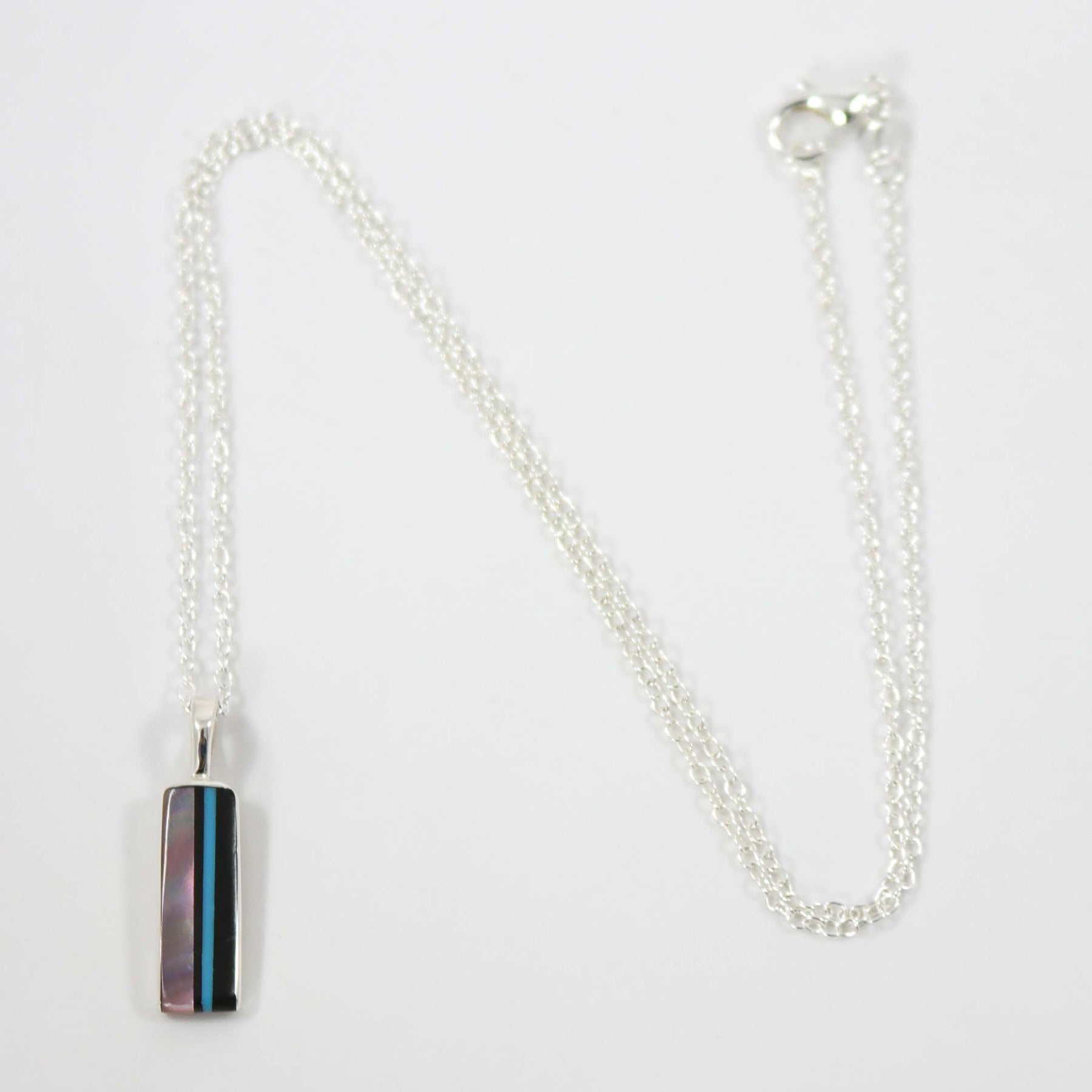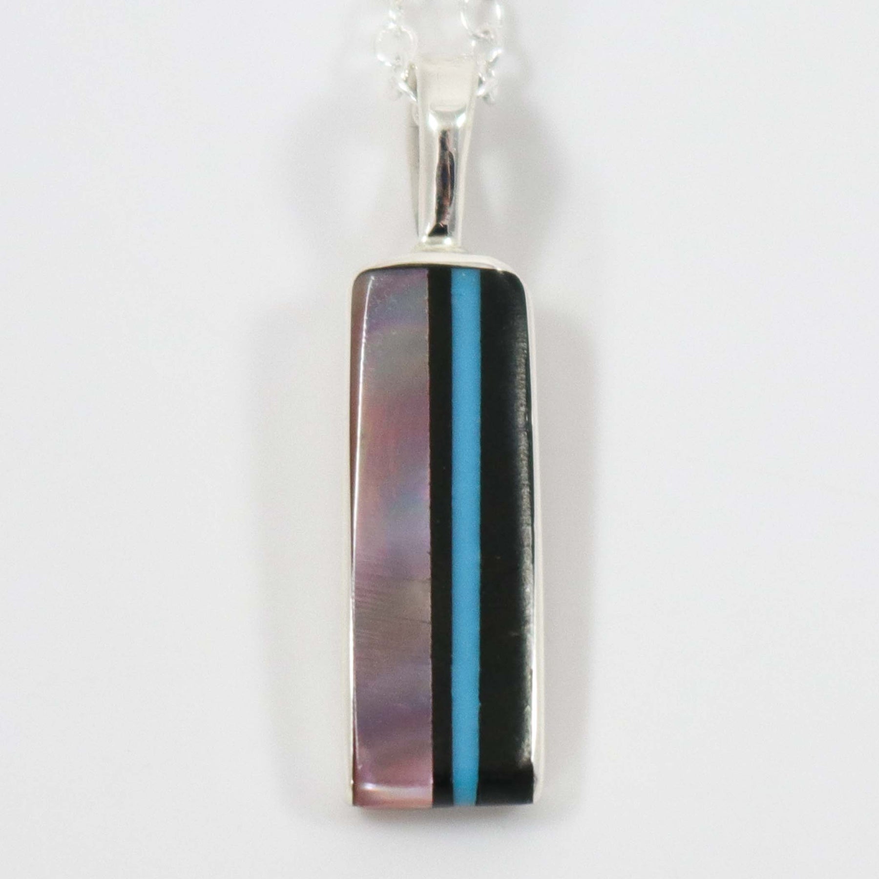 Sterling Silver Pendant with Inlaid Mother of Pearl Shell, Jet, and Turquoise on a 18” Sterling Silver Chain Necklace.