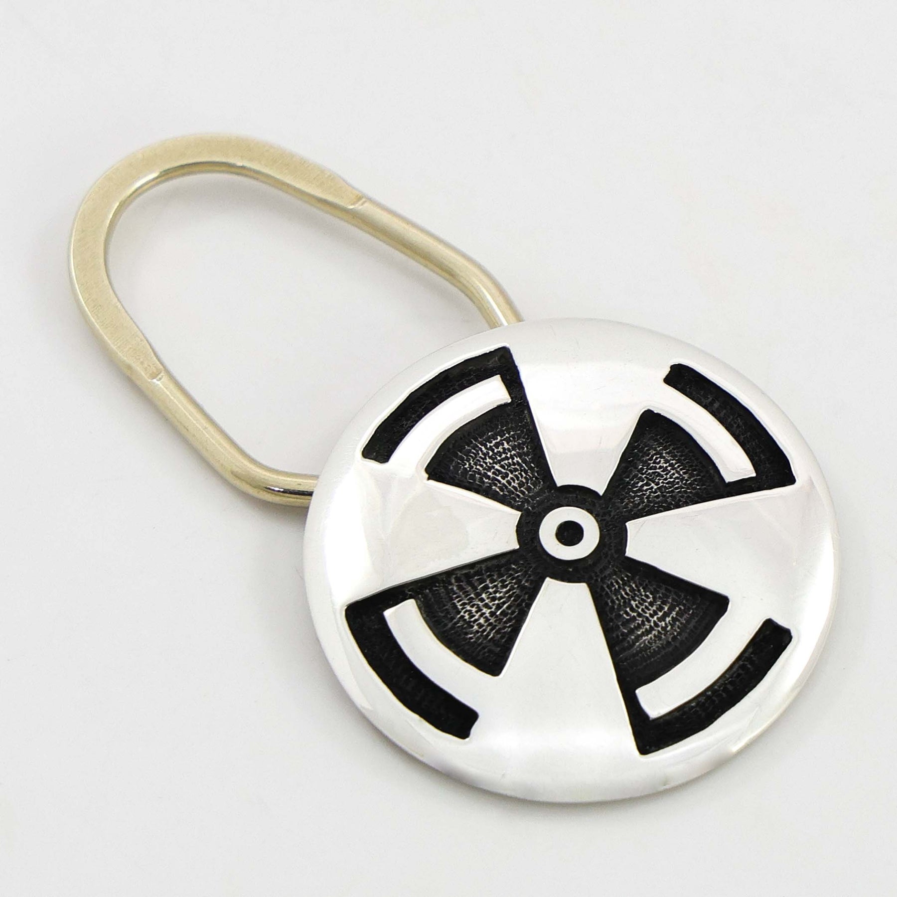 Stainless Steel Key Ring with a Sterling Silver Panel Featuring a Hopi Overlaid Design of Prayer Feathers for Renewing Life and Spirit.