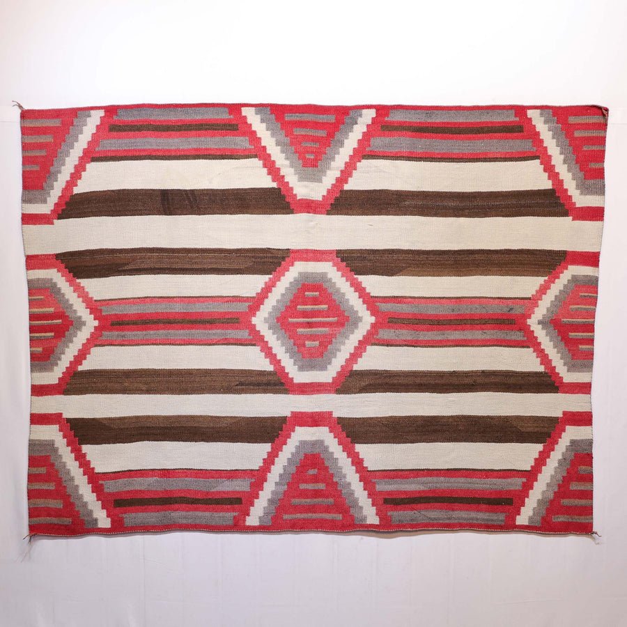 1890s Navajo Handwoven Third Phase Chief Blanket with Black and White Piano Keys and Aniline Dyed Blues and Reds using  Hand-Carded and Spun Wool. This weaving has some slight moth damage, one small stain, and slight fading on one side.