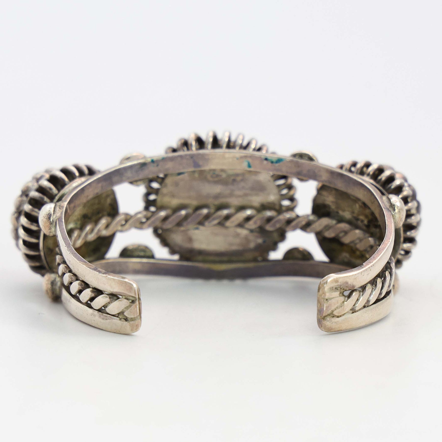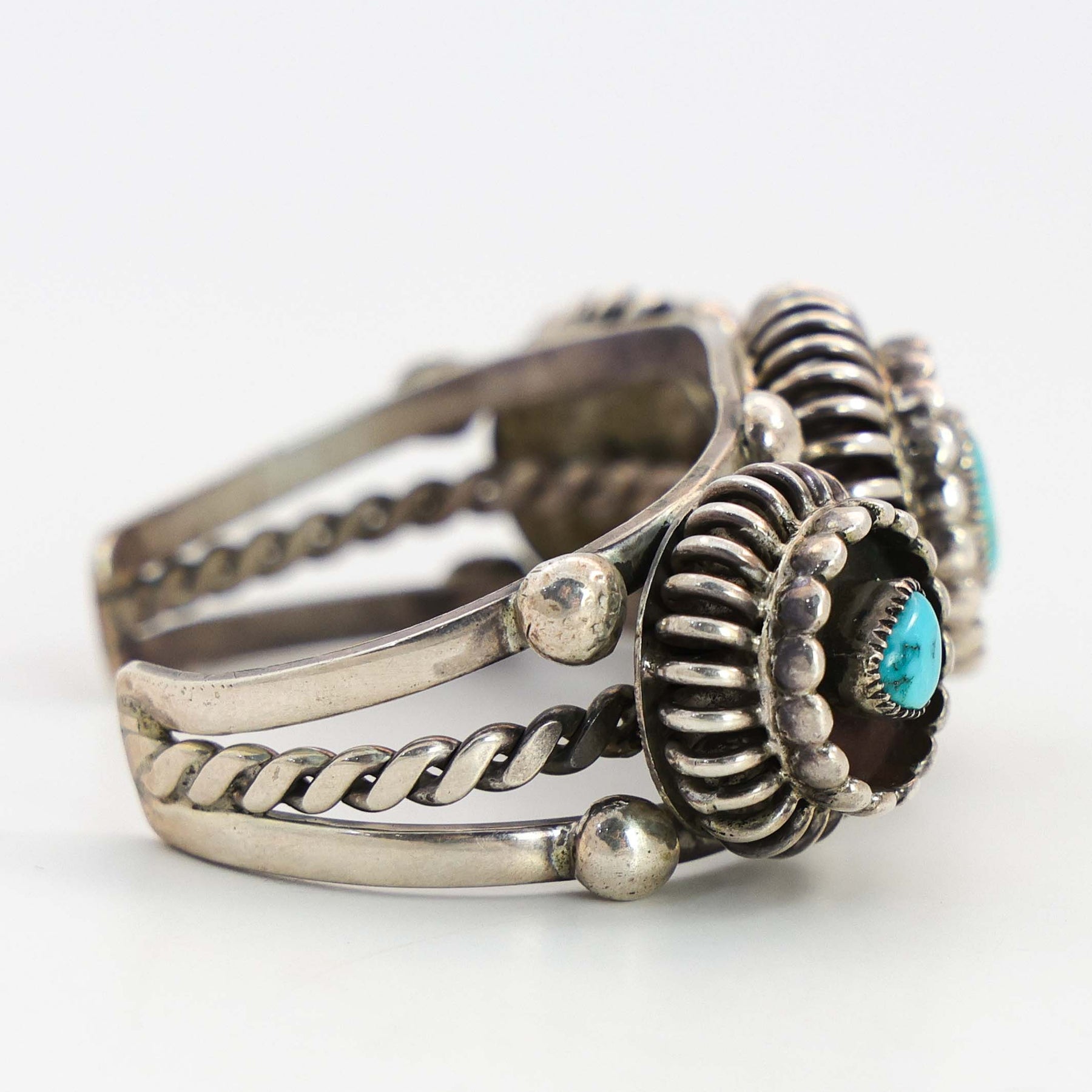 Circa 1940s Navajo sterling silver cuff bracelet featuring three natural American turquoise stones framed in hand-applied sunburst wirework and silver raindrops. A split-shank design with twisted center wire adds dimension and classic early Navajo character.