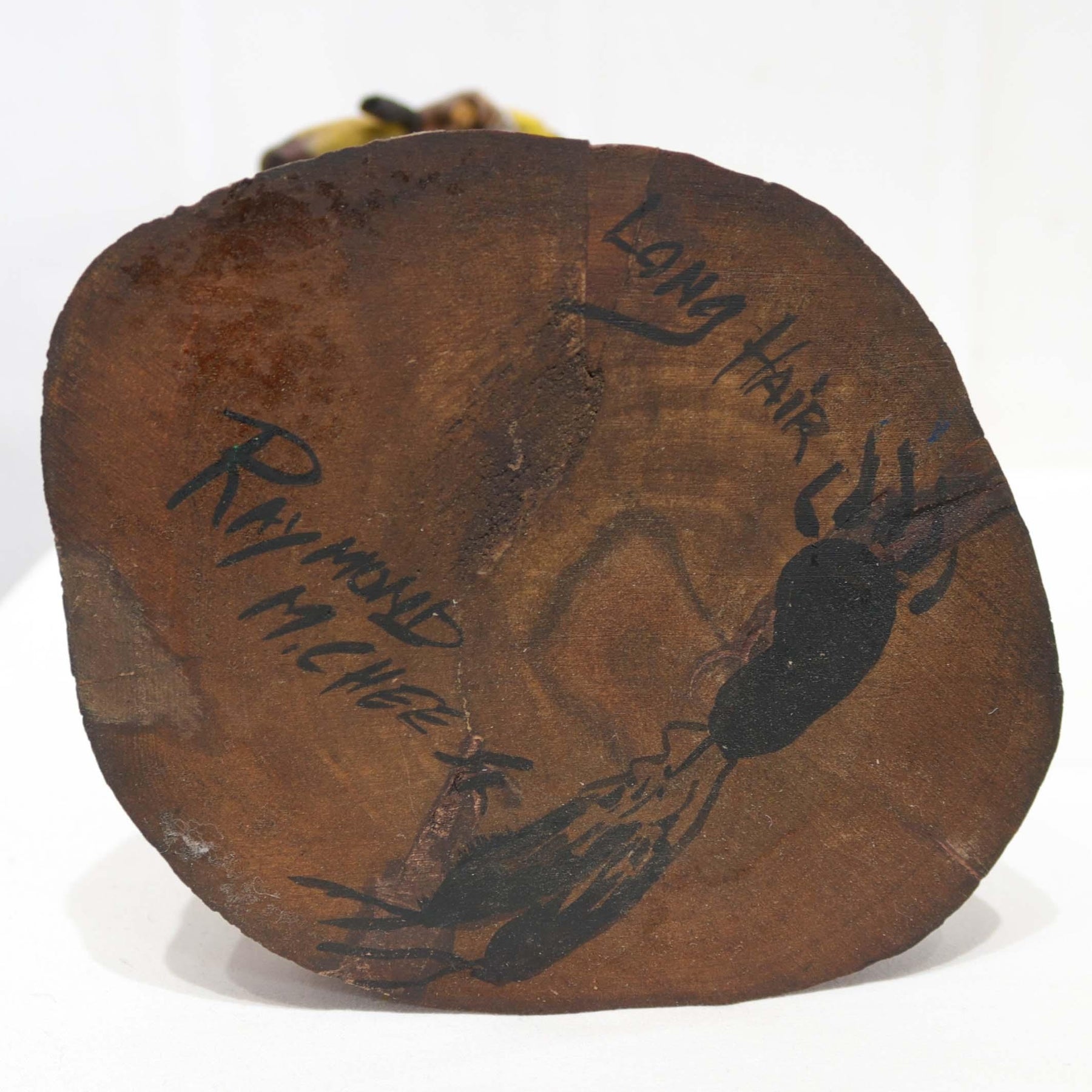 Hand-Carved and Painted Long Hair (Angakchina) Kachina Holding a Rattle and Bringing Gifts, including Corn Stalks, Dolls, and Piki Bread. This beautiful Kachina is carved out of one piece of Cottonwood Root; only the rattle and feathers were added.