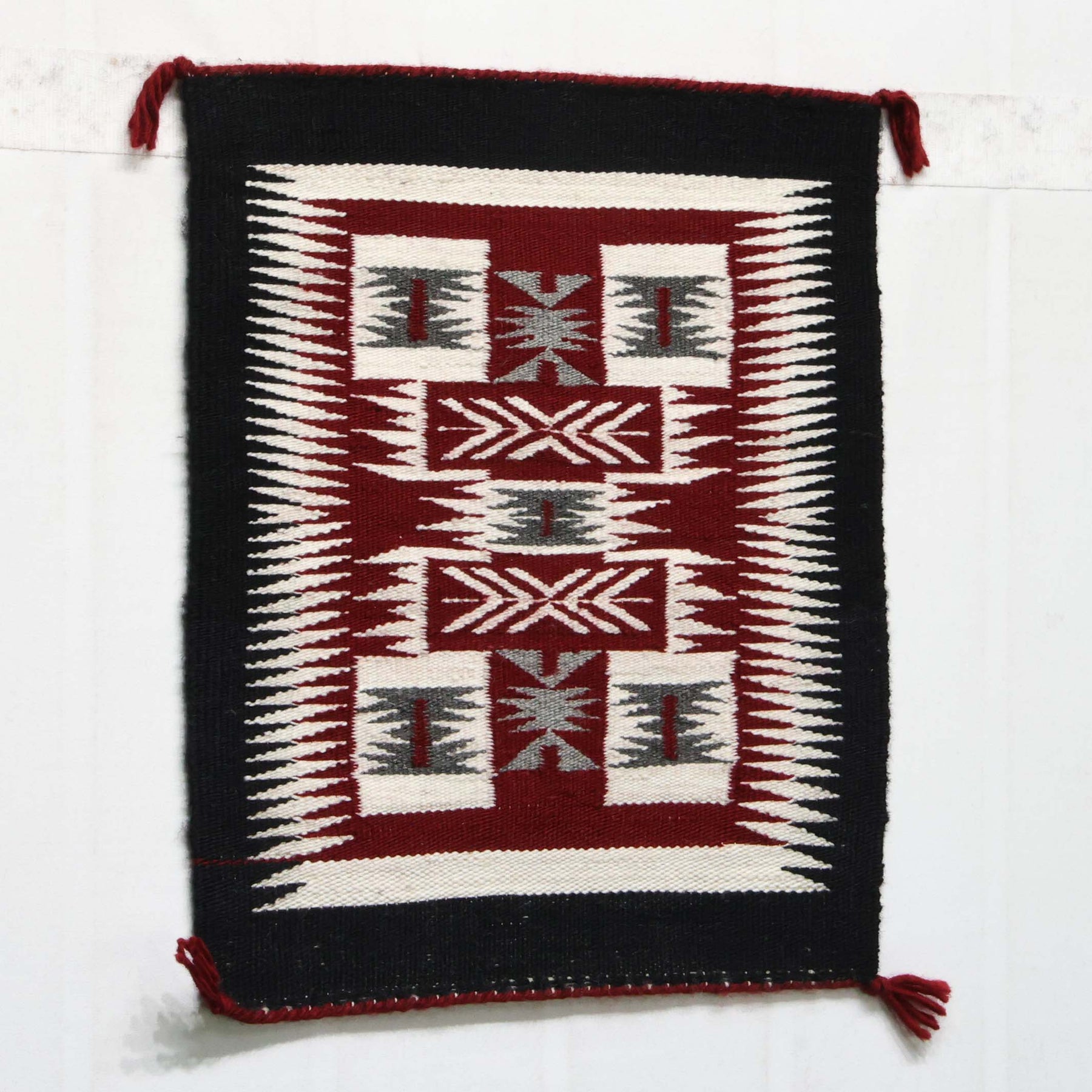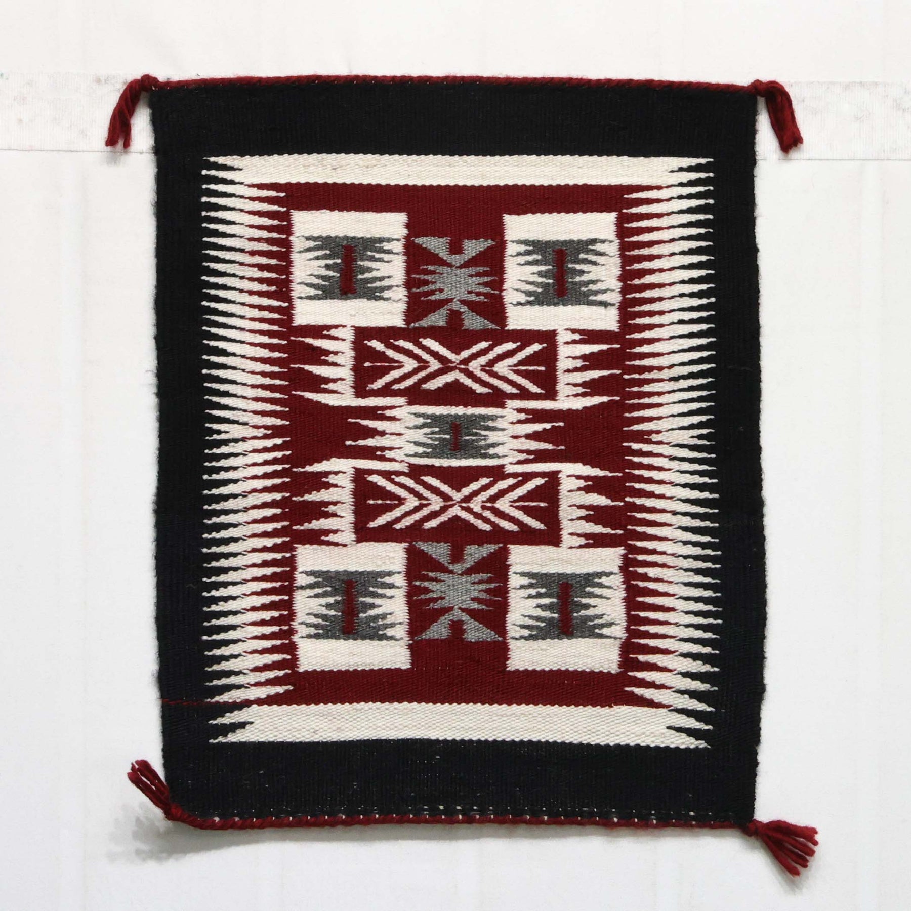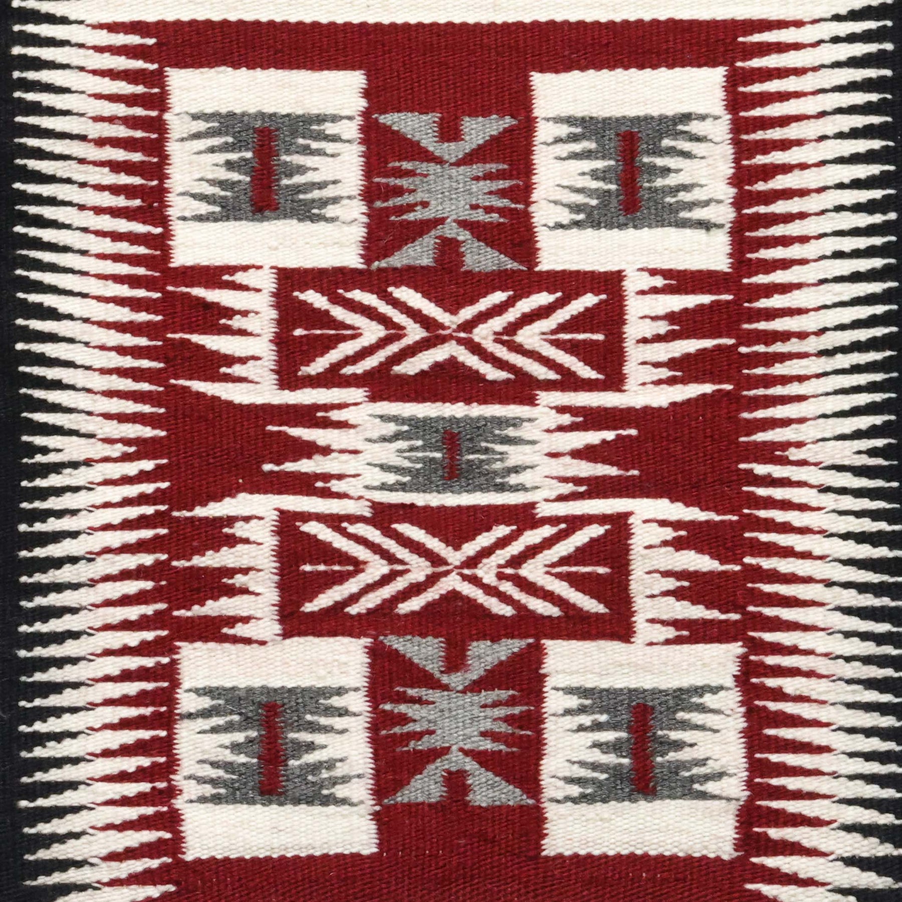 Navajo Weaving featuring a White Storm Pattern Design Element on a Red Background.