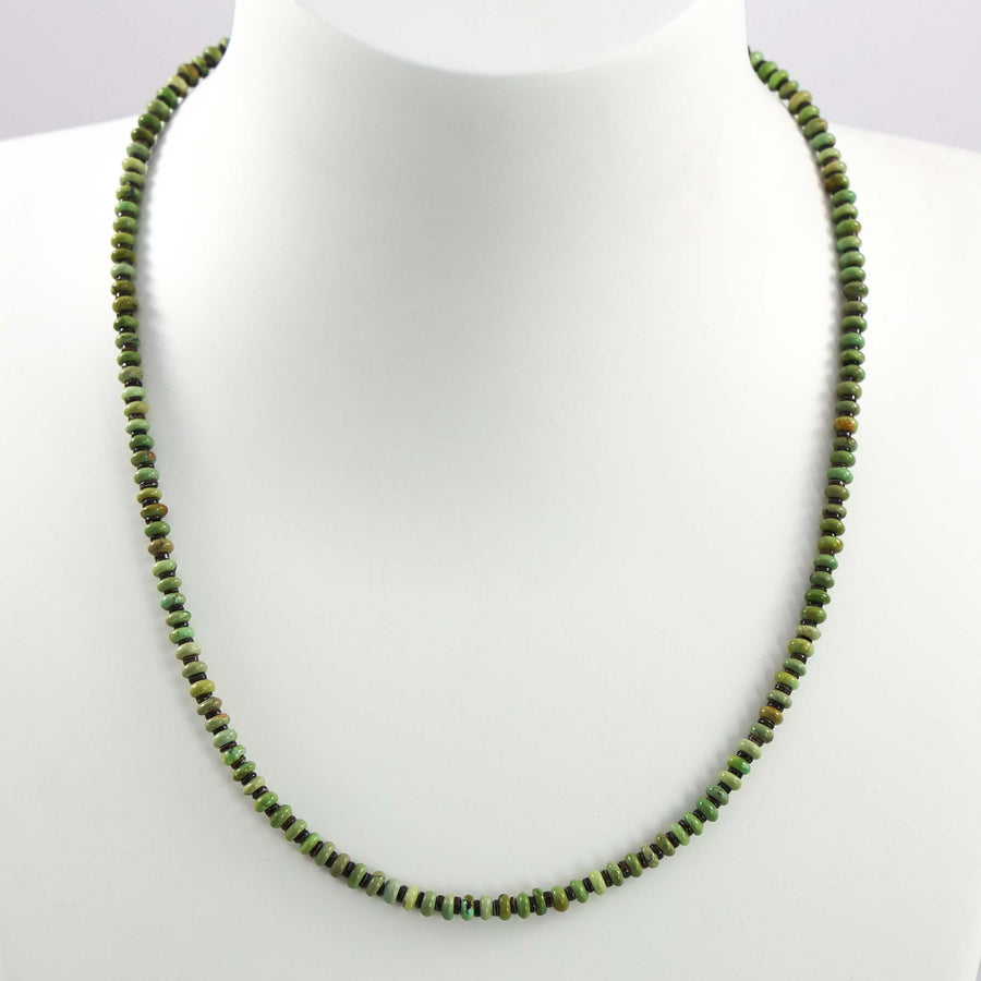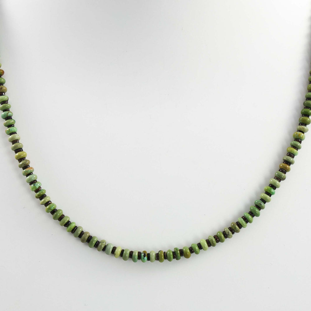 Single Strand Necklace with Pen Shell Heishi Beads and Inlay Tabs and Pendant featuring Rain Cloud Designs. The Tabs and Pendants Feature Mosaic Inlaid Turquoise, Spiny Oyster Shell, Jet, and Mother of Pearl Shell on Shell Backings and with Sterling Silver Accents and an Adjustable Sterling Silver Clasp. This necklace is by Santo Domingo (Kewa) artist, Warren Nieto.